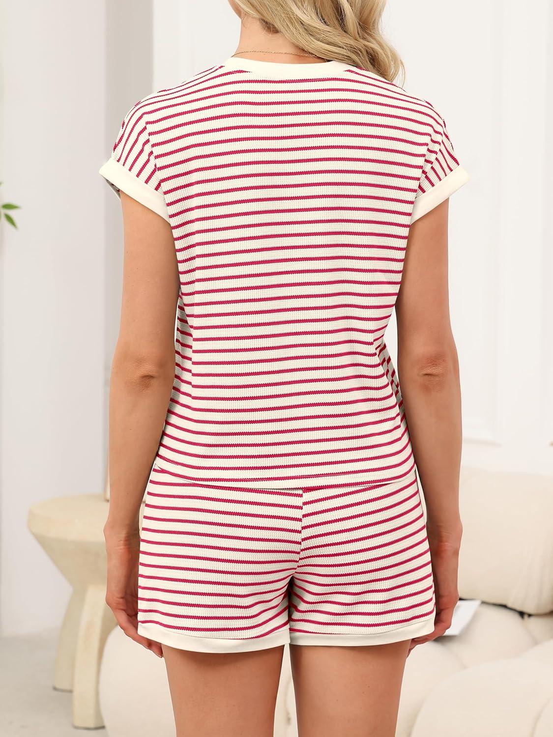ANRABESS Women 2 Piece Pajama Lounge Sets Stripe Knit Cap Sleeve Tee Shirts Shorts 2026 Casual Summer Loungewear Shorts Set(Red Beige Striped)