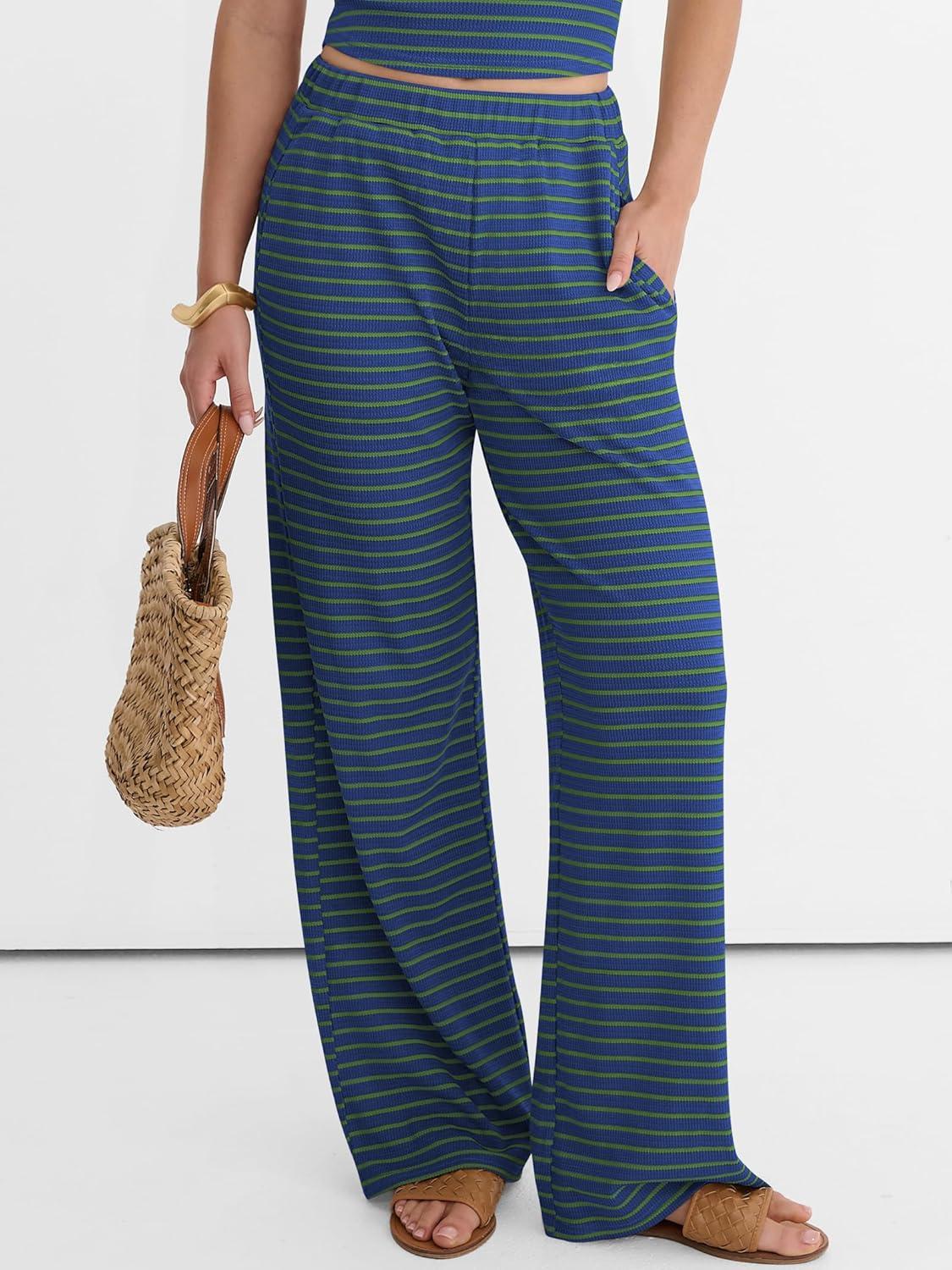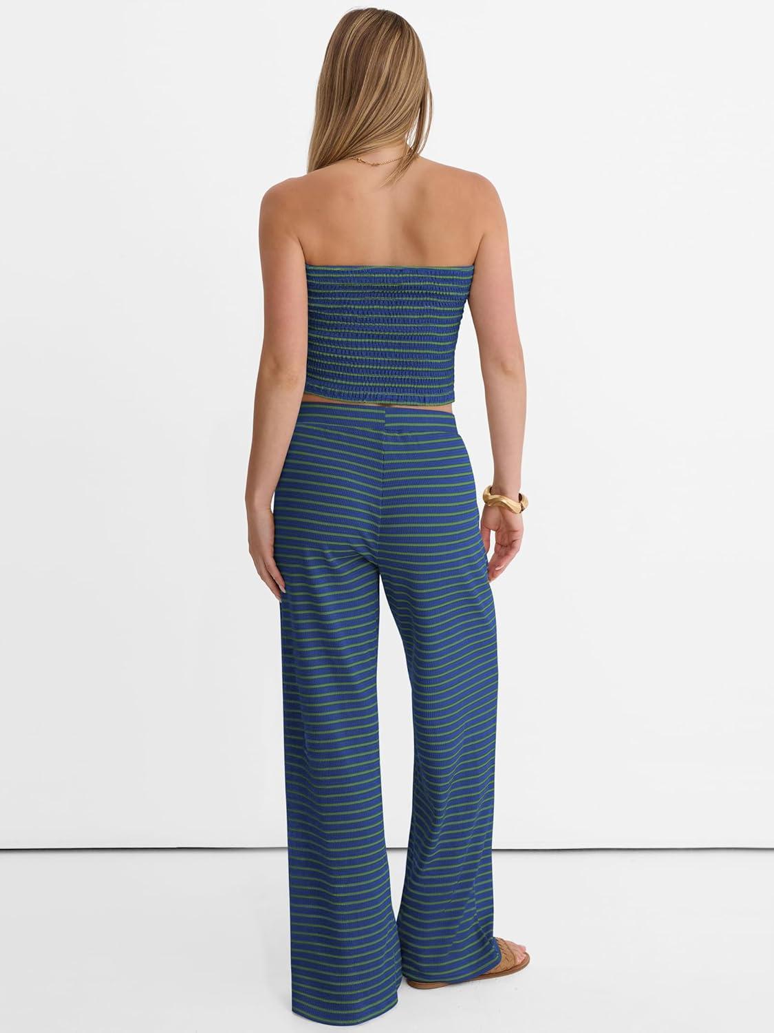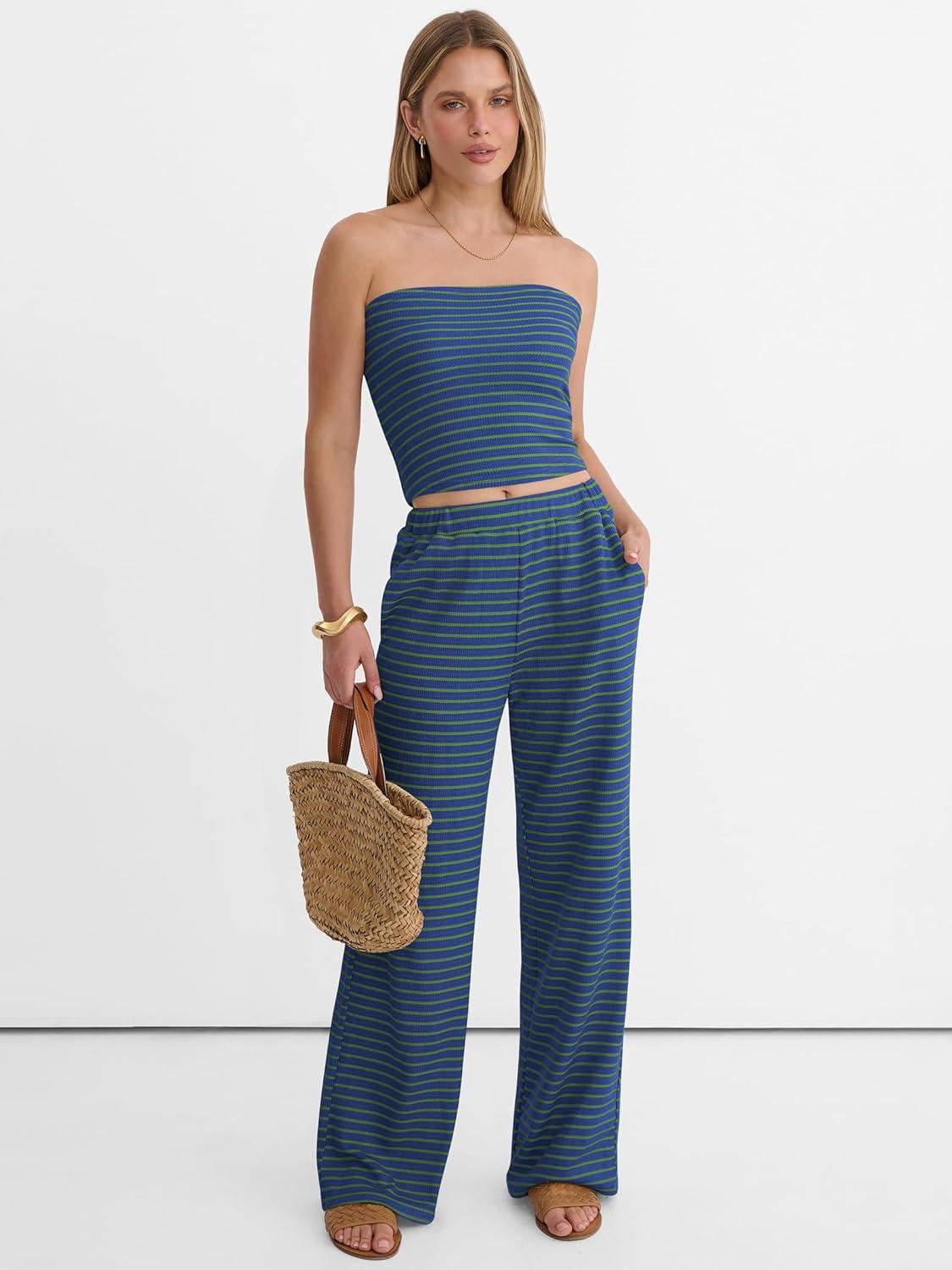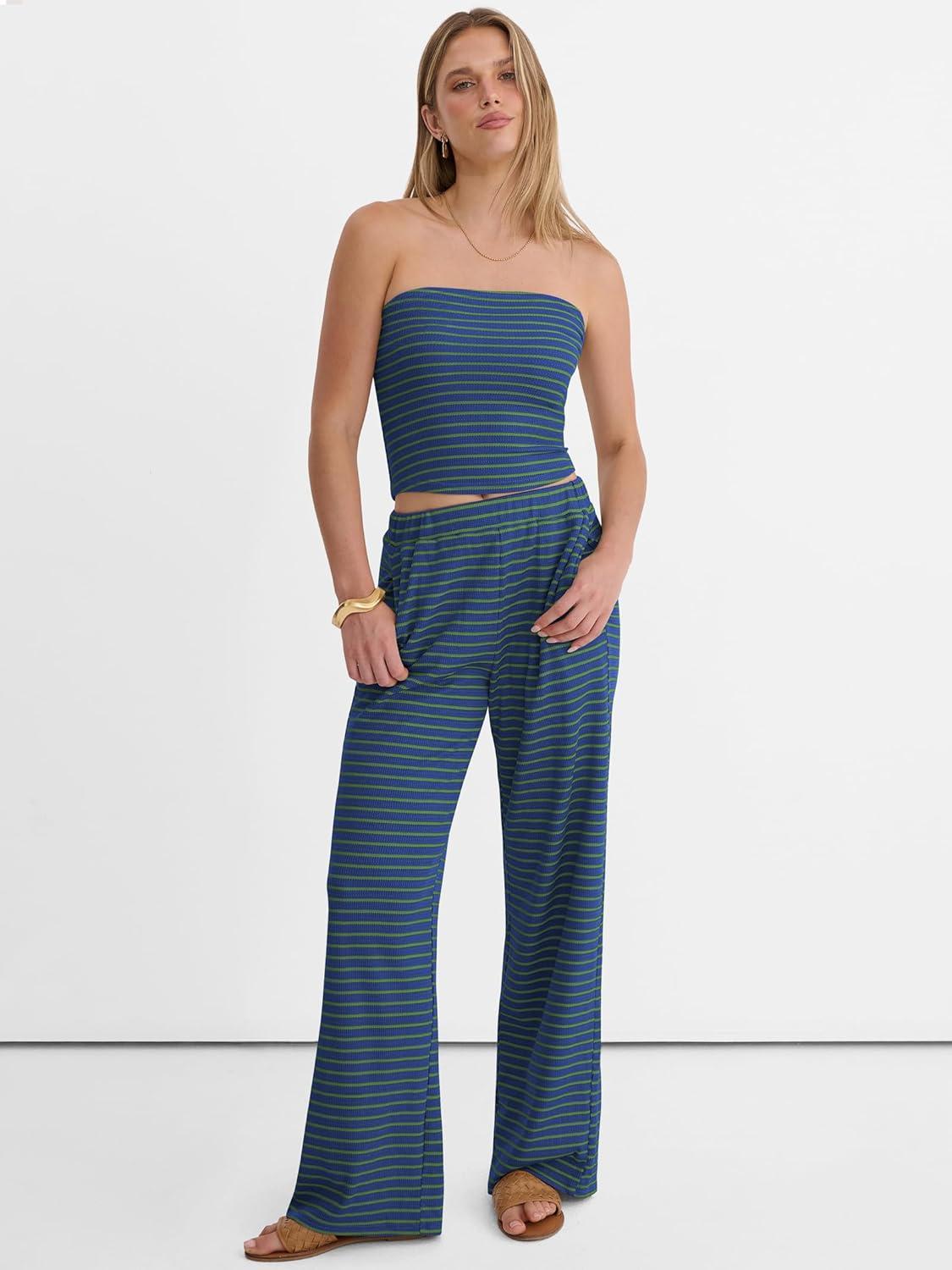 ANRABESS Women 2 Piece Sets Summer Striped Outfits Matching Tube Top Wide Leg Lounge Pants 2026 Travel Beach Vacation Clothes(Blue Green Stripe)