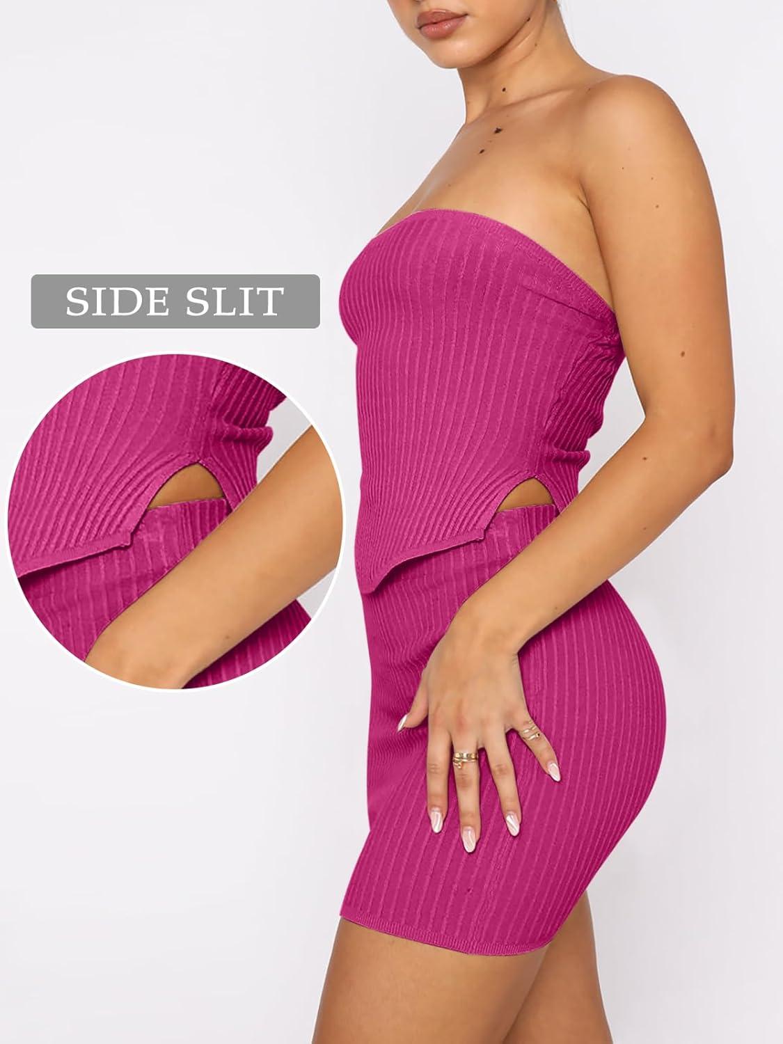 imageANRABESS Women 2 Piece Skirt Sets Summer Strapless Crop Top Matching Bodycon Sexy Going Out Mini Club Dress Outfit ClothesHot Pink
