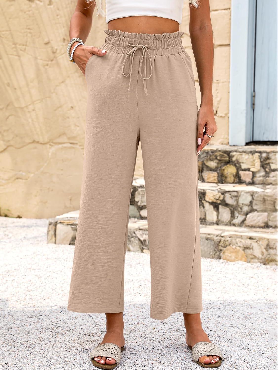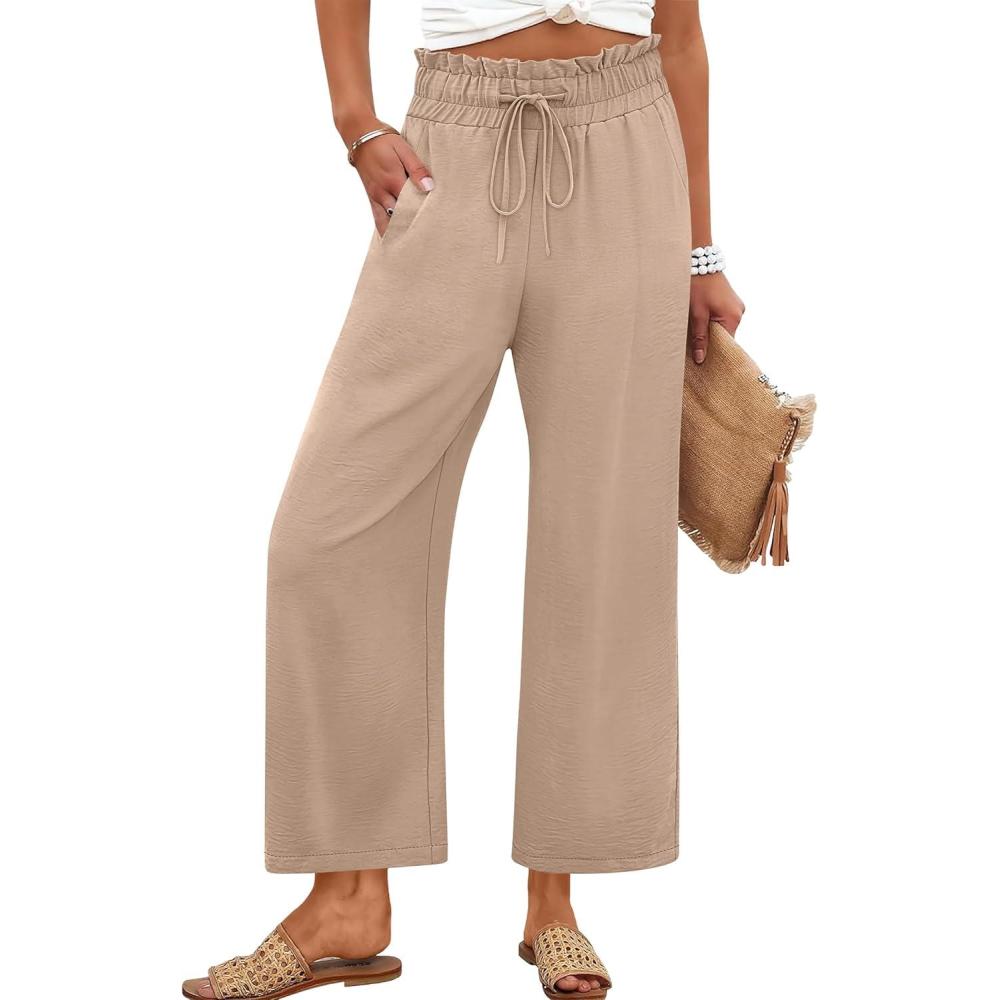 ANRABESS Women 2025 Summer Casual Flowy Loose High Waist Boho Wide Leg Cropped Palazzo Lounge Beach Vacation Pants Trousers(Khaki)