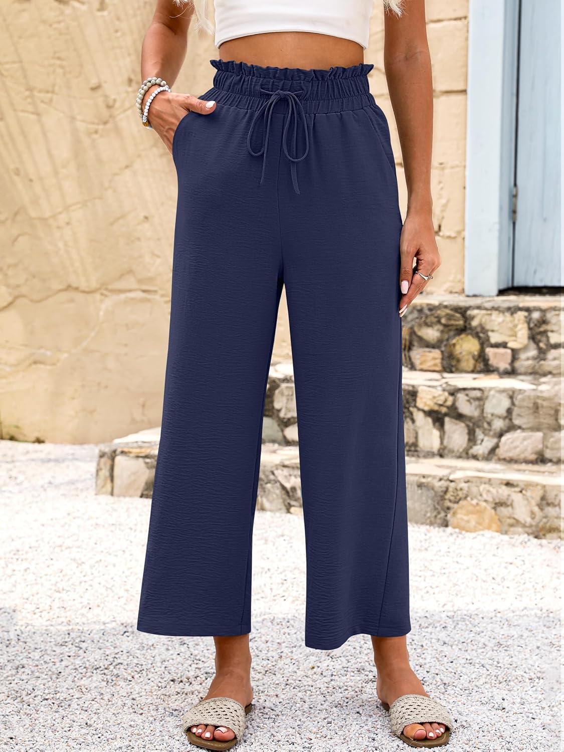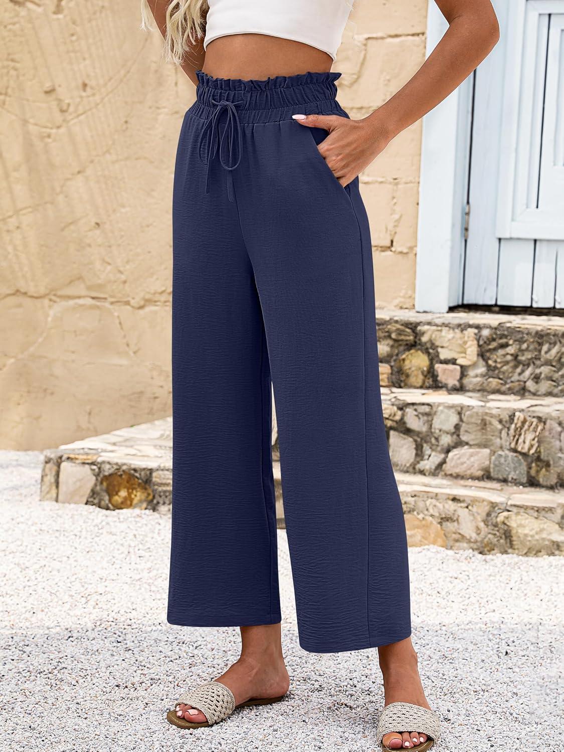 ANRABESS Women 2025 Summer Casual Flowy Loose High Waist Boho Wide Leg Cropped Palazzo Lounge Beach Vacation Pants Trousers(Navy Blue)