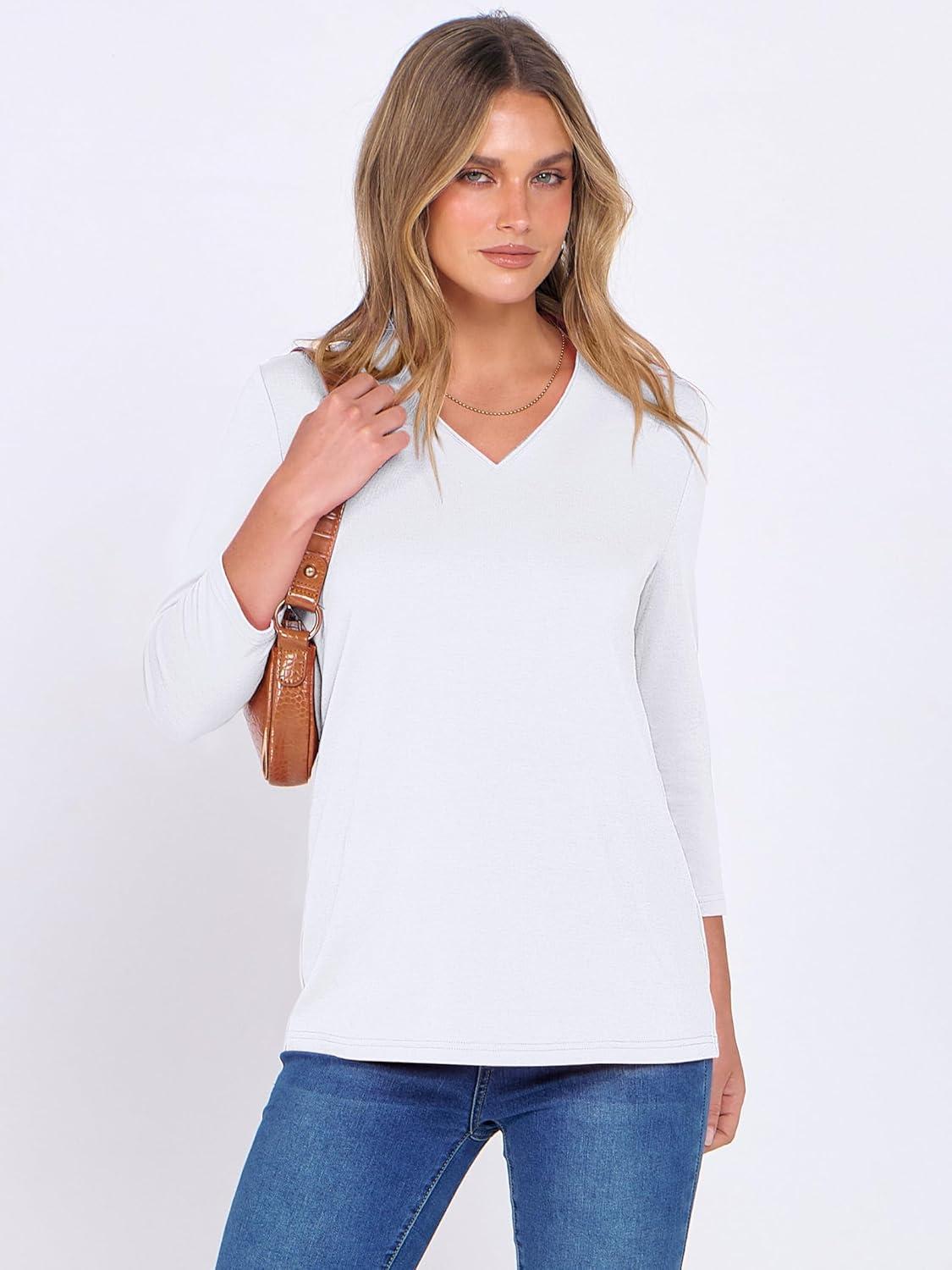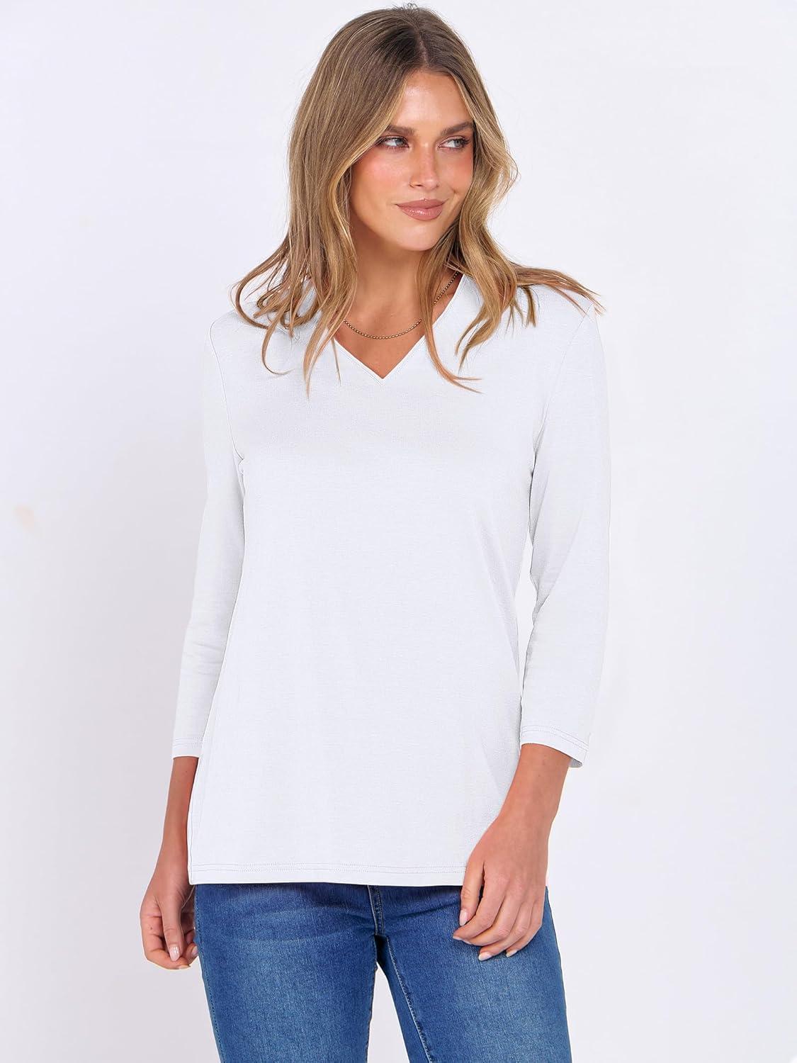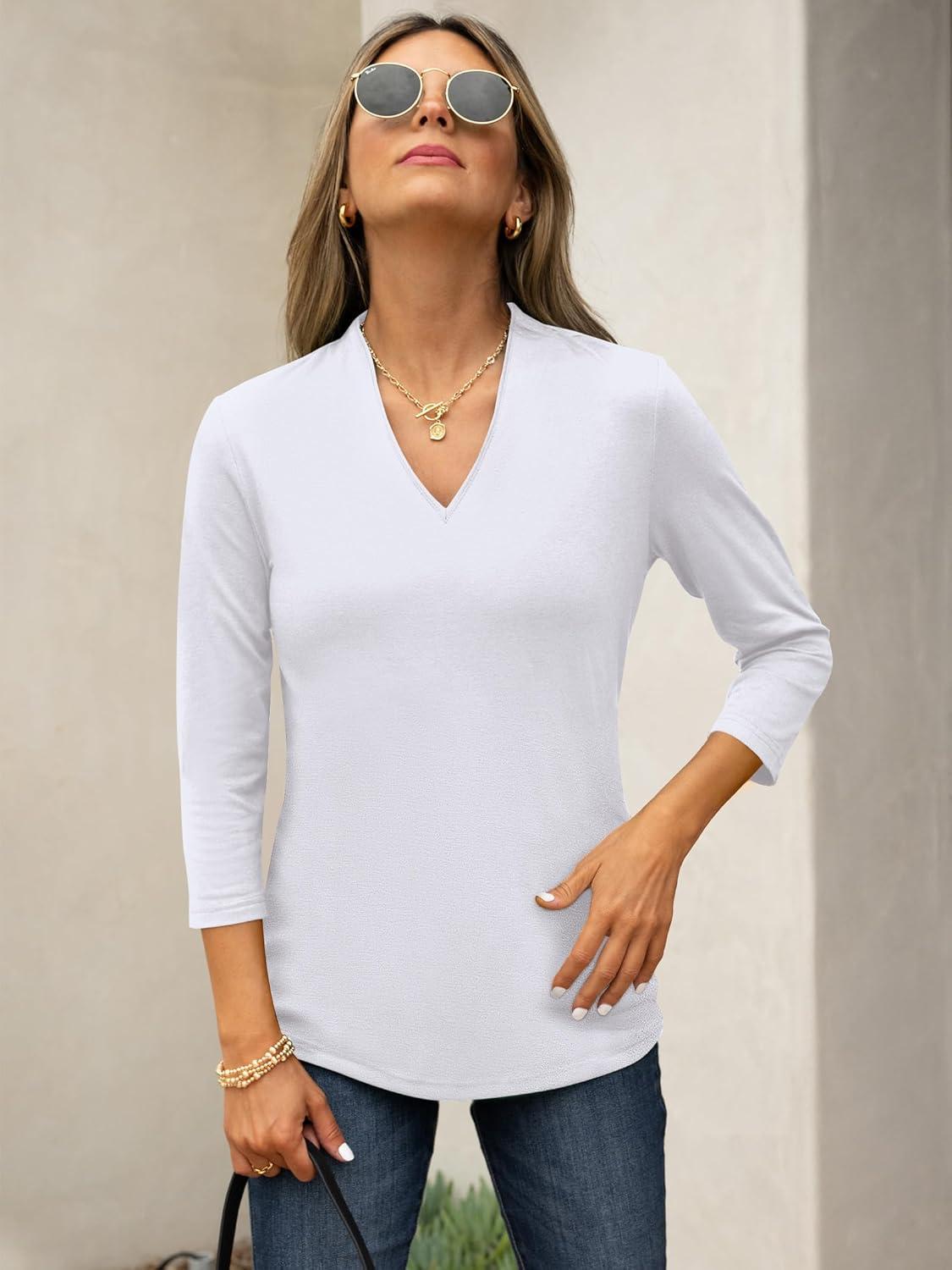 ANRABESS Women 3/4 Length Sleeve Tops V Neck Basic Dressy Casual Business Tunic Tee Shirts 2025 Fall Summer Trendy Outfits(White)