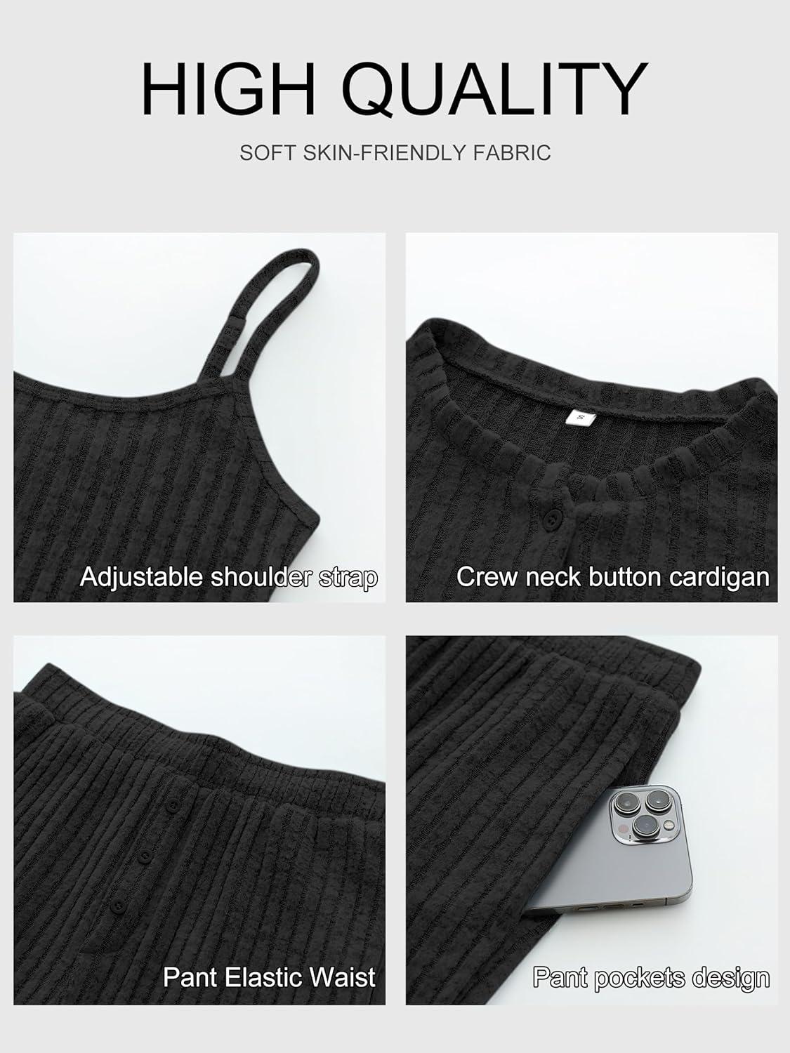 ANRABESS Women 3 Piece Lounge Pajama Sets Knit Crop Cardigan Cami Top Wide Leg Pants 2025 Fall Outfits Comfy Matching Clothes(Black)