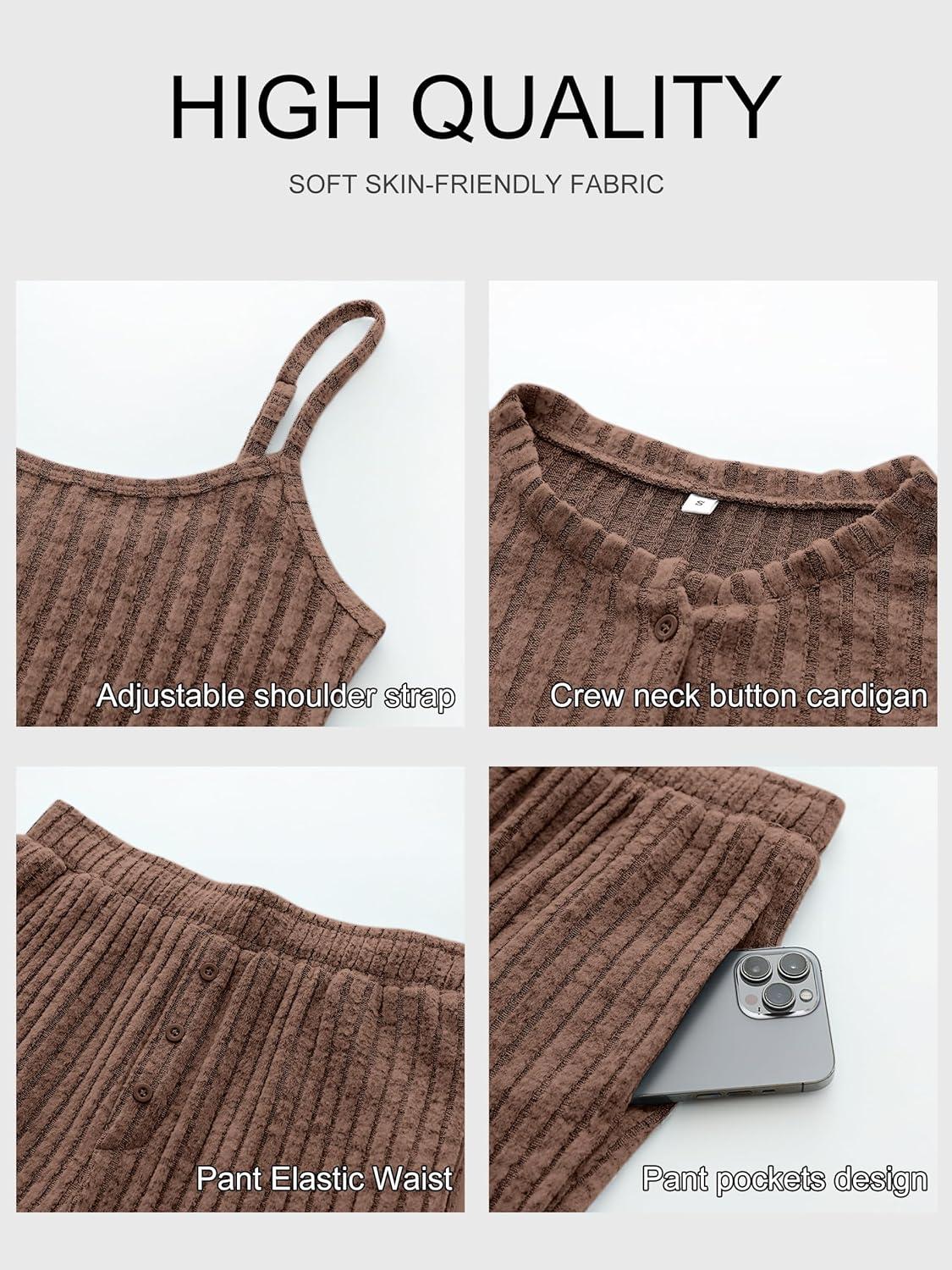 ANRABESS Women 3 Piece Lounge Pajama Sets Knit Crop Cardigan Cami Top Wide Leg Pants 2025 Fall Outfits Comfy Matching Clothes(Brown)