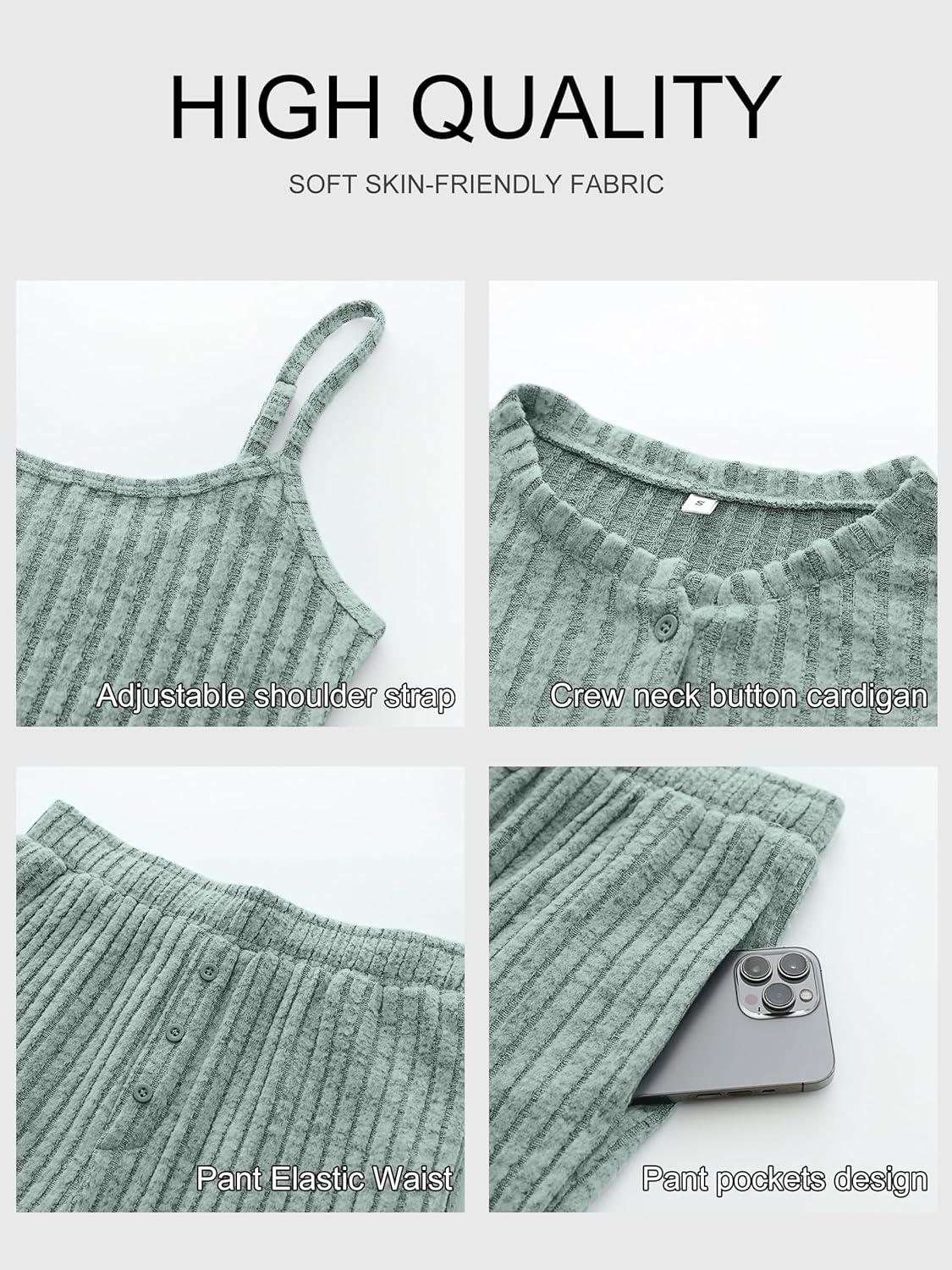 ANRABESS Women 3 Piece Lounge Pajama Sets Knit Crop Cardigan Cami Top Wide Leg Pants 2025 Fall Outfits Comfy Matching Clothes(Green)