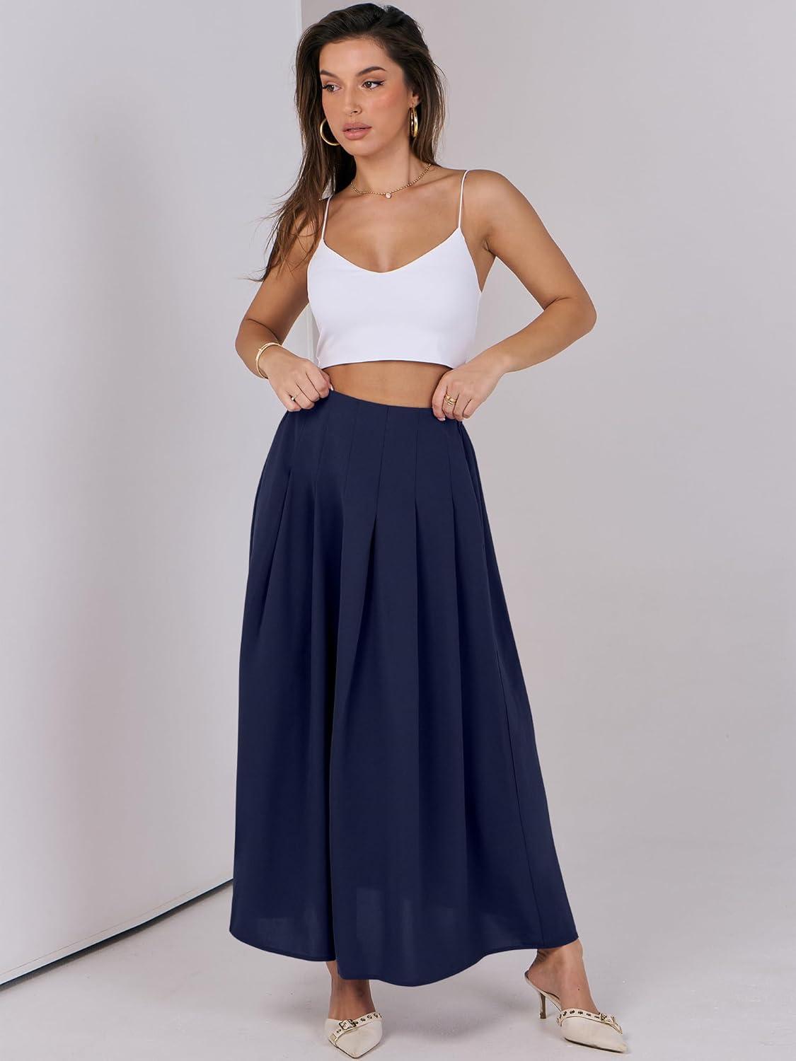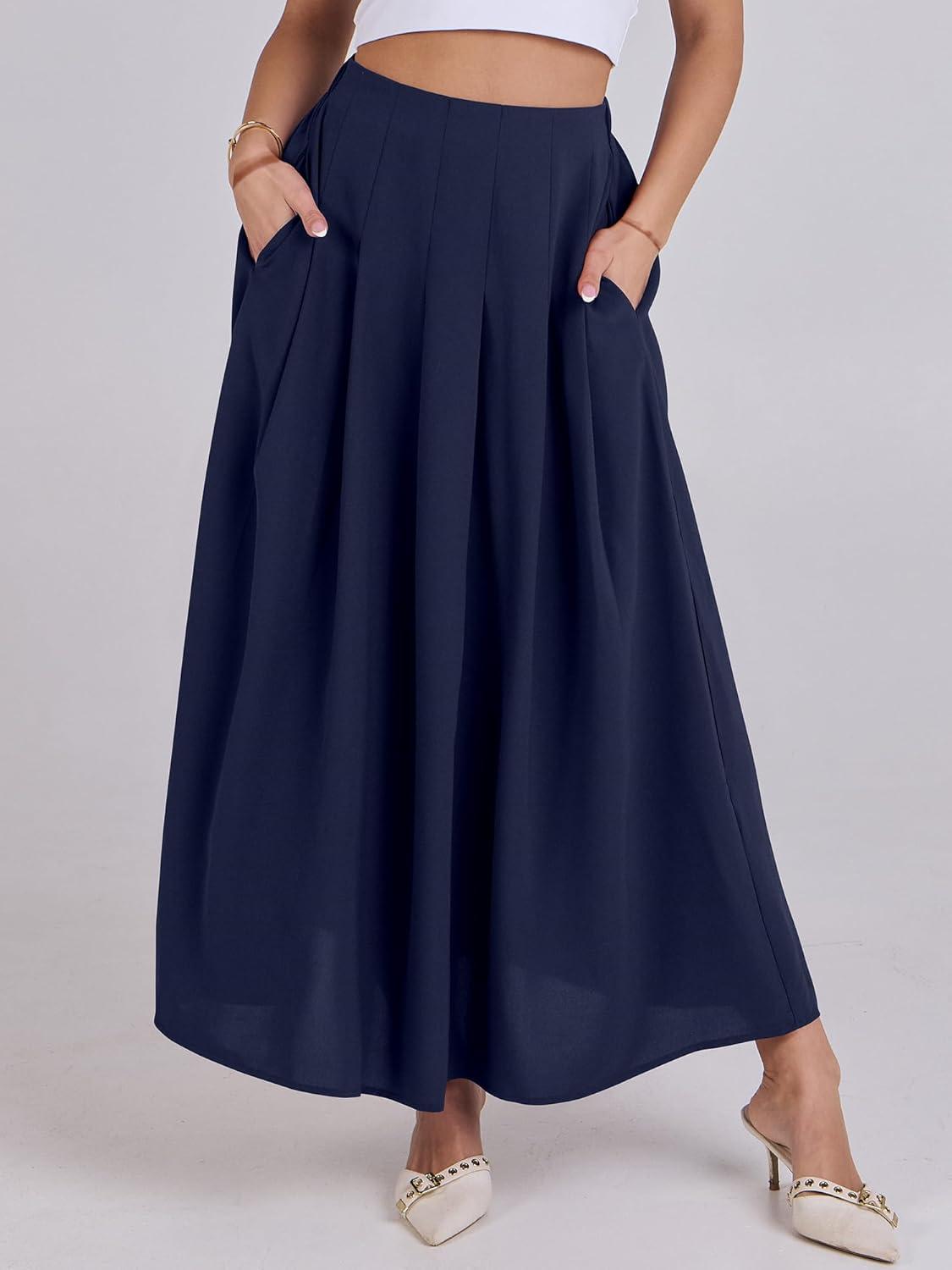 ANRABESS Women A-Line Pleated High Waist Maxi Skirt Full Ankle Length Flowy Swing Elegant Dressy Casual Work Long Skirts(Navy Blue)