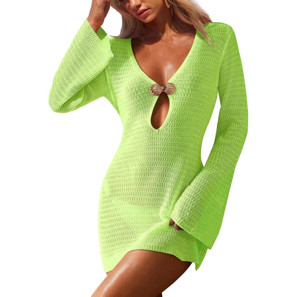 ANRABESS Women Beach Cover Ups 2026 Summer Crochet Knit Swimwear Mesh Bathing Suit Hollow Out Dress Swimsuit Vacation Clothes(Pea Green)