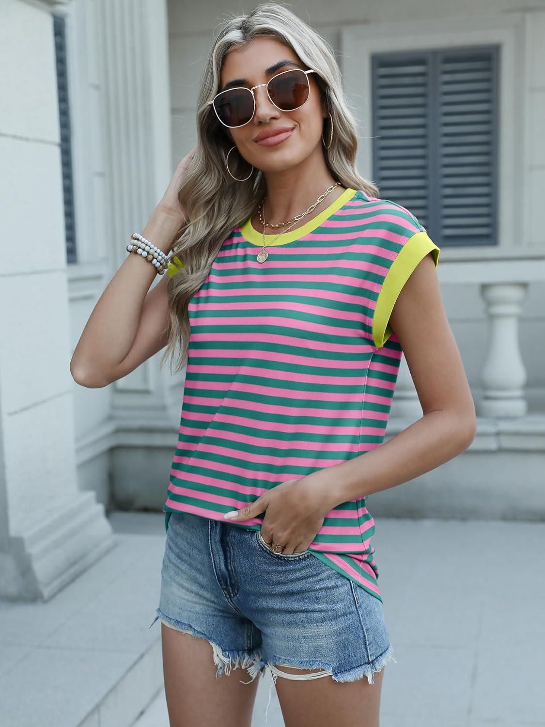 ANRABESS Women Cap Sleeve Tops 2026 Trendy Summer Loose Fit Cute Basic T Shirts Business Dressy Casual Outfits Clothes(Rose Green Stripe)