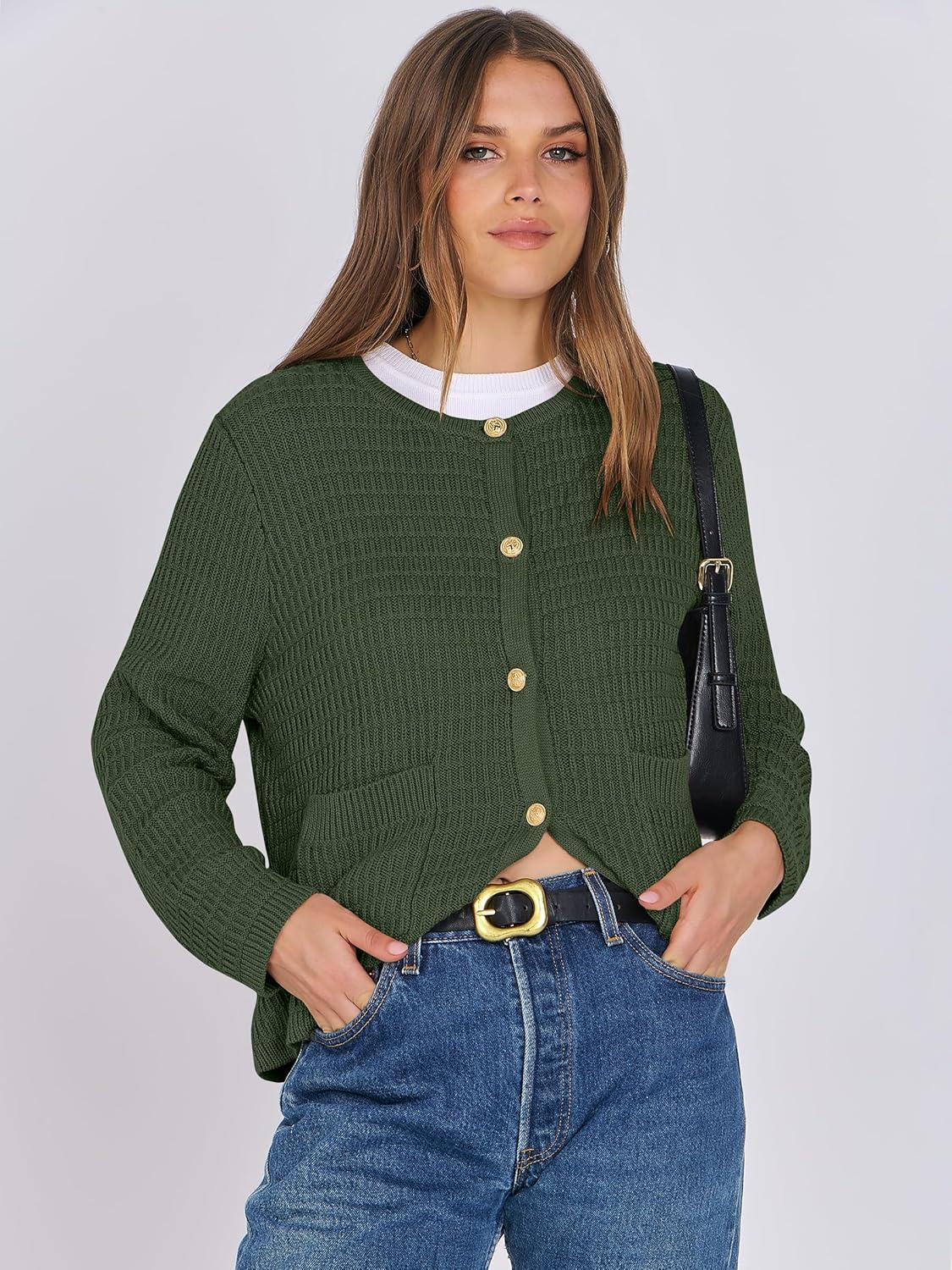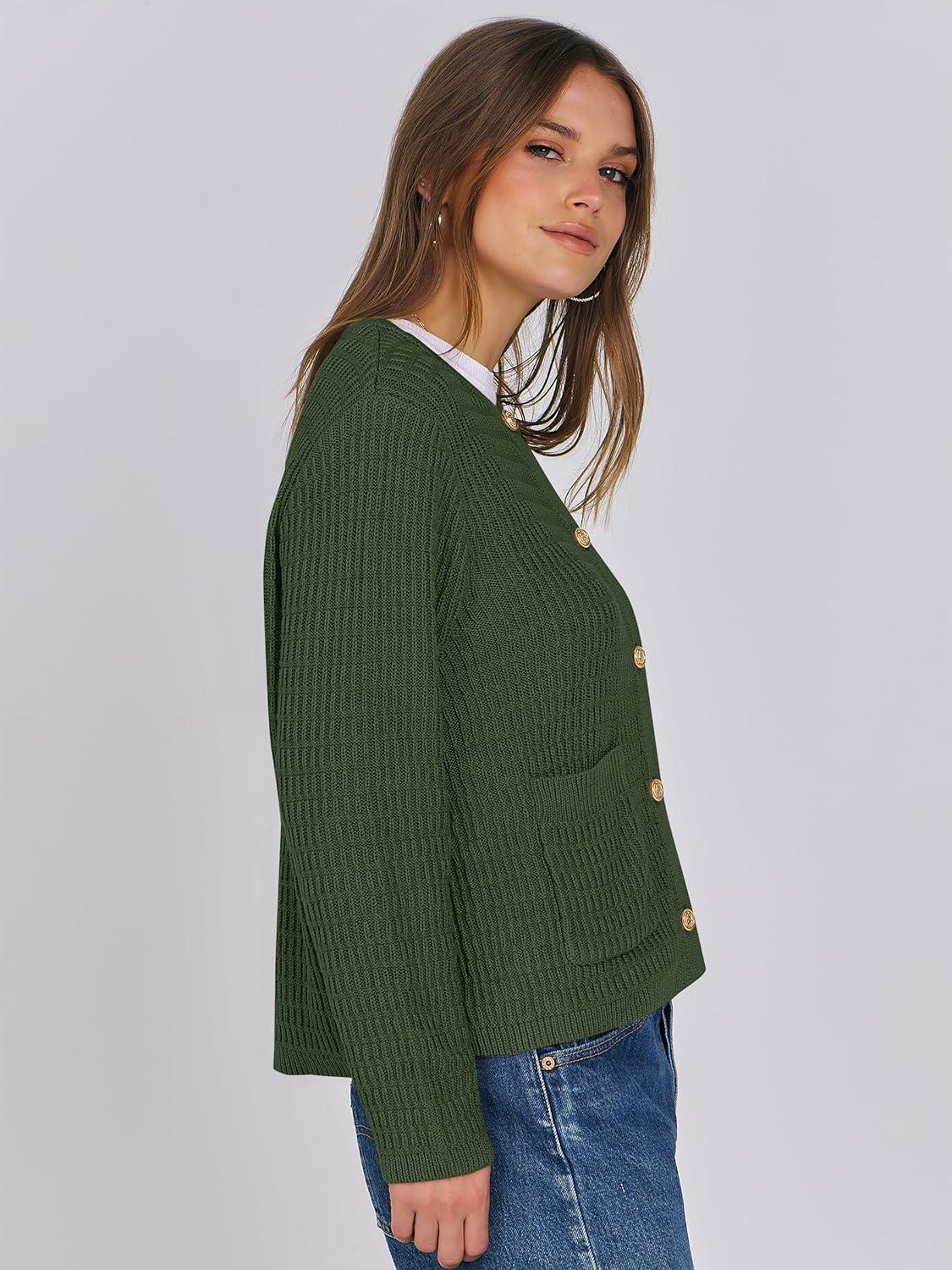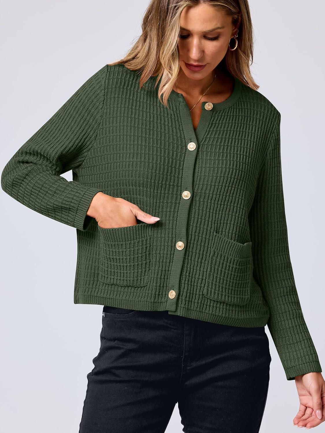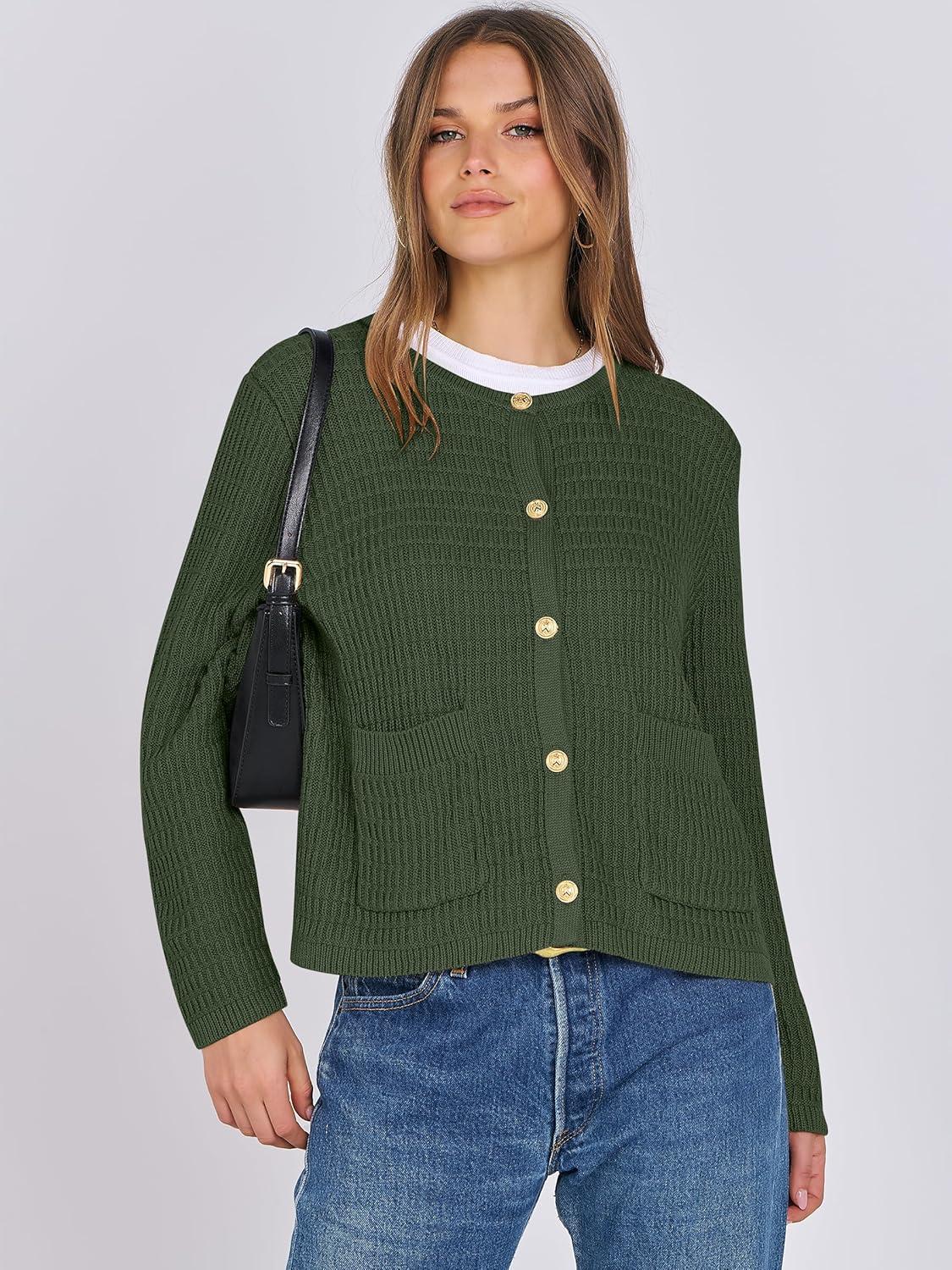 ANRABESS Women Cardigan Sweater Dressy Casual Classic Long Sleeve Crew Neck Button Down Tweed Knit Jacket 2025 Fall Outfits(Army Green)