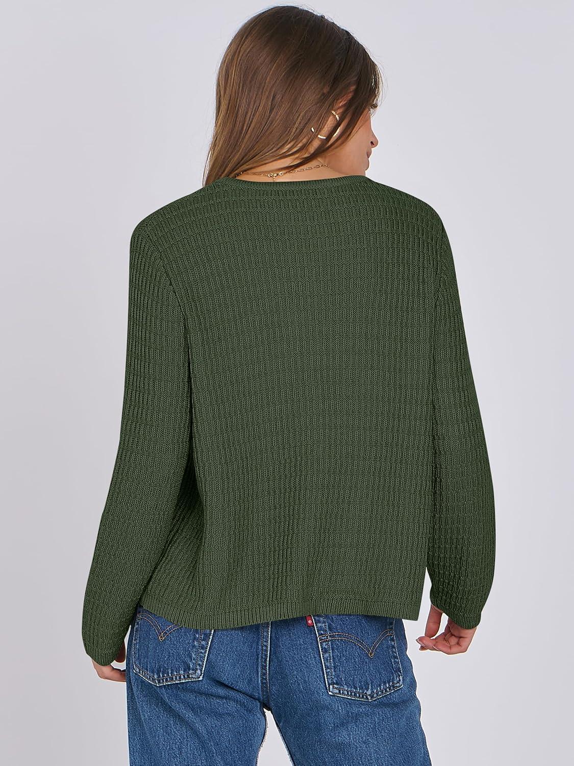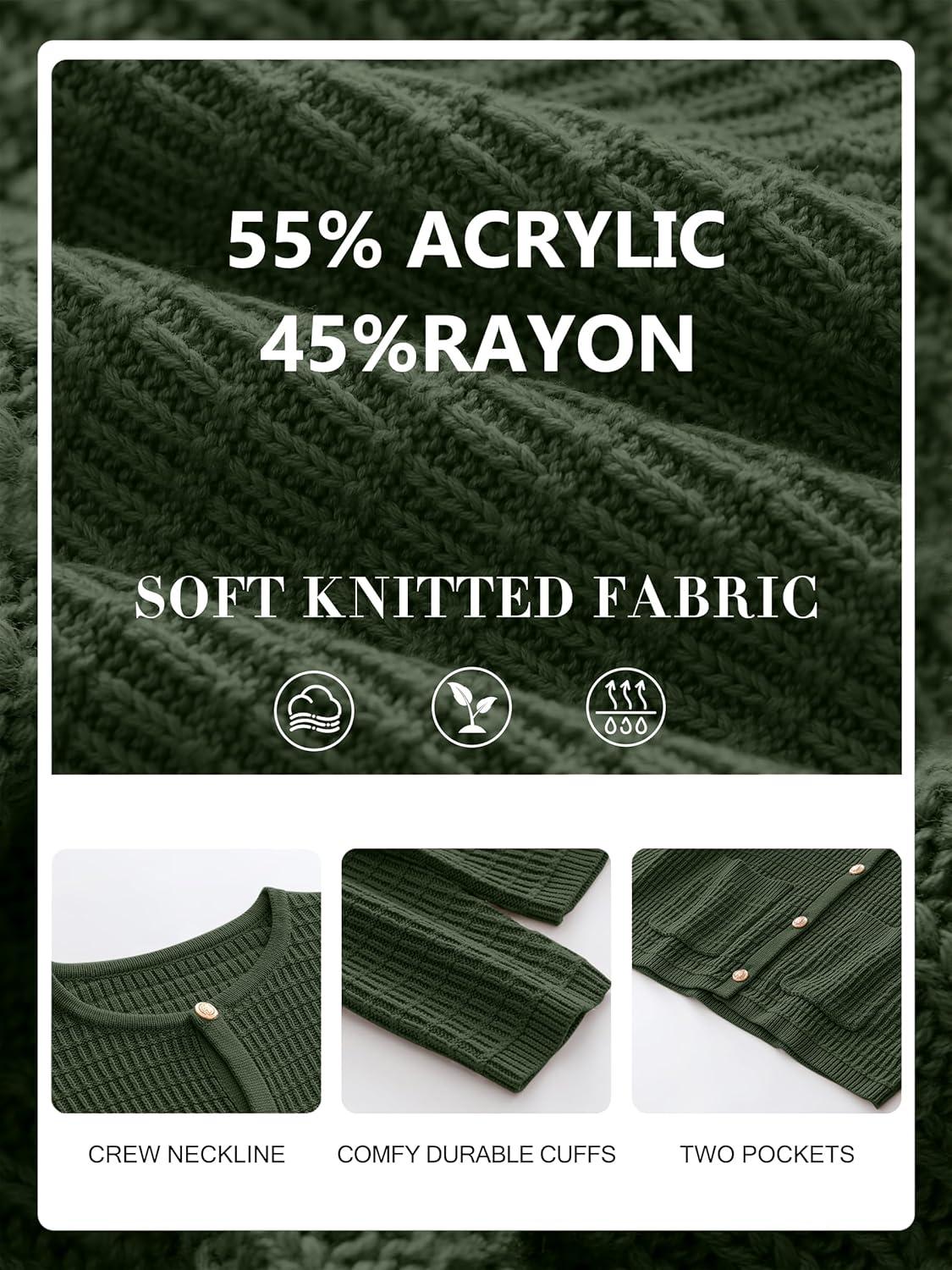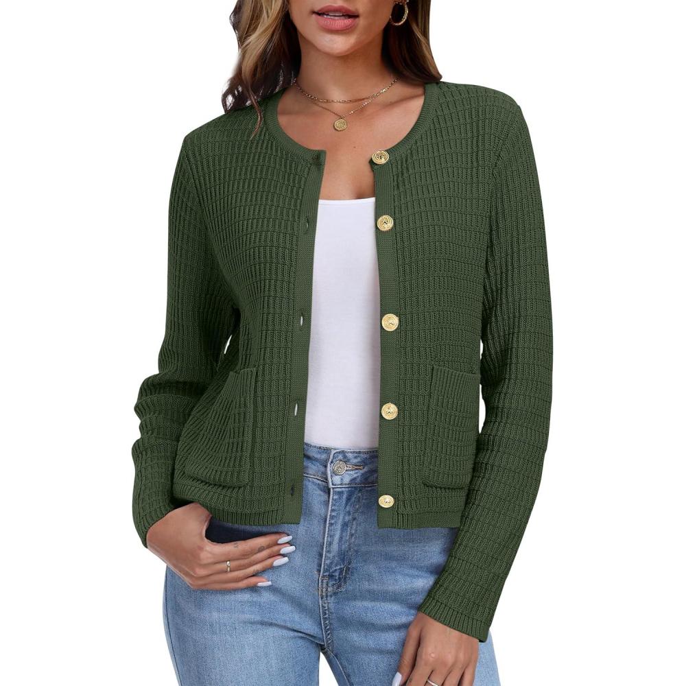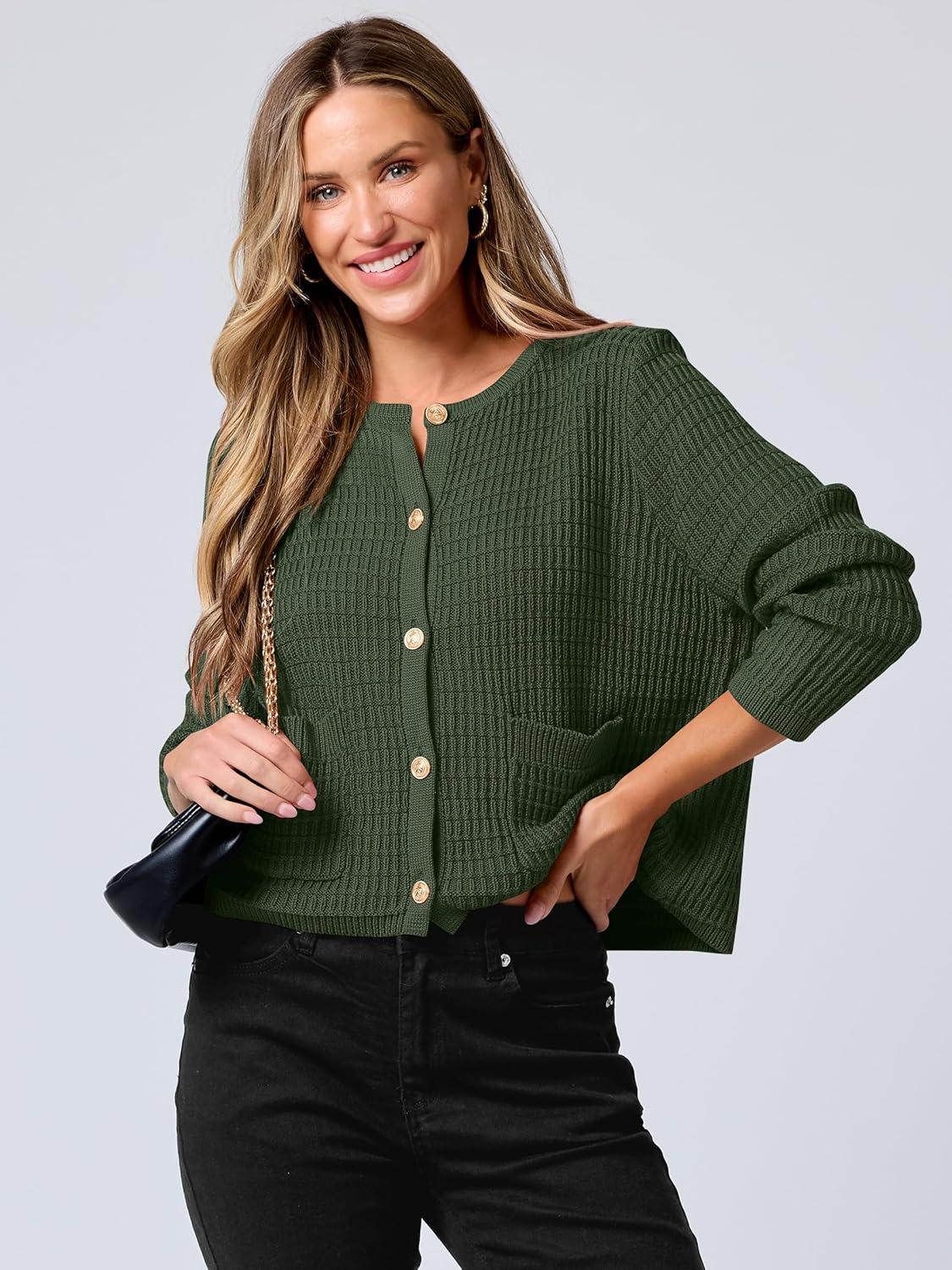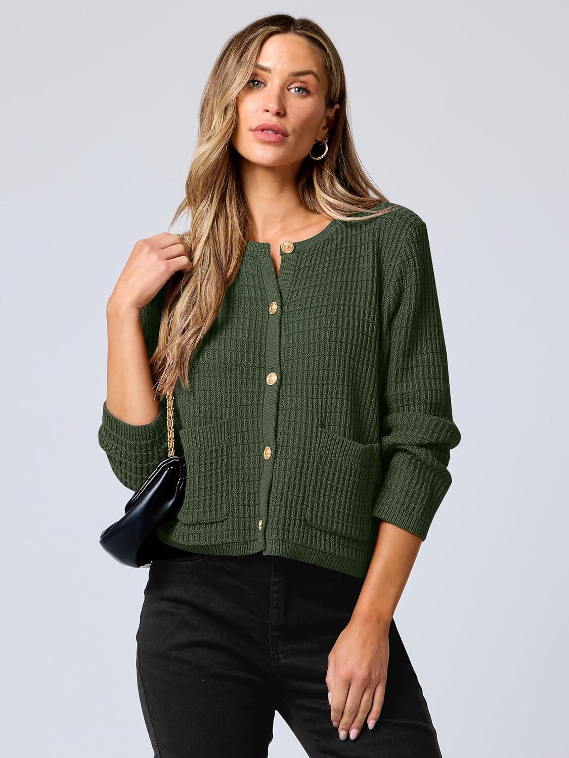 ANRABESS Women Cardigan Sweater Dressy Casual Classic Long Sleeve Crew Neck Button Down Tweed Knit Jacket 2025 Fall Outfits(Army Green)