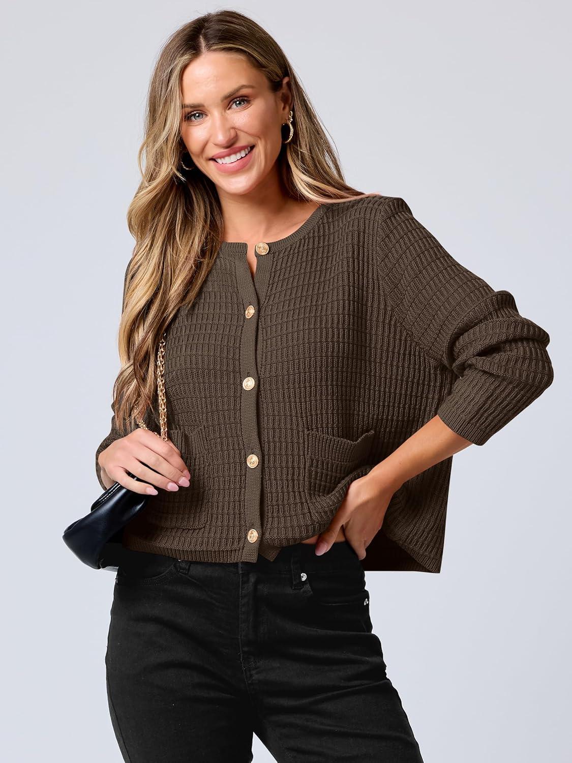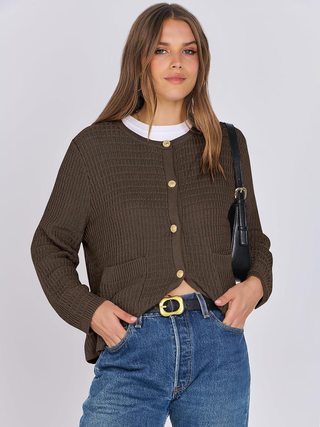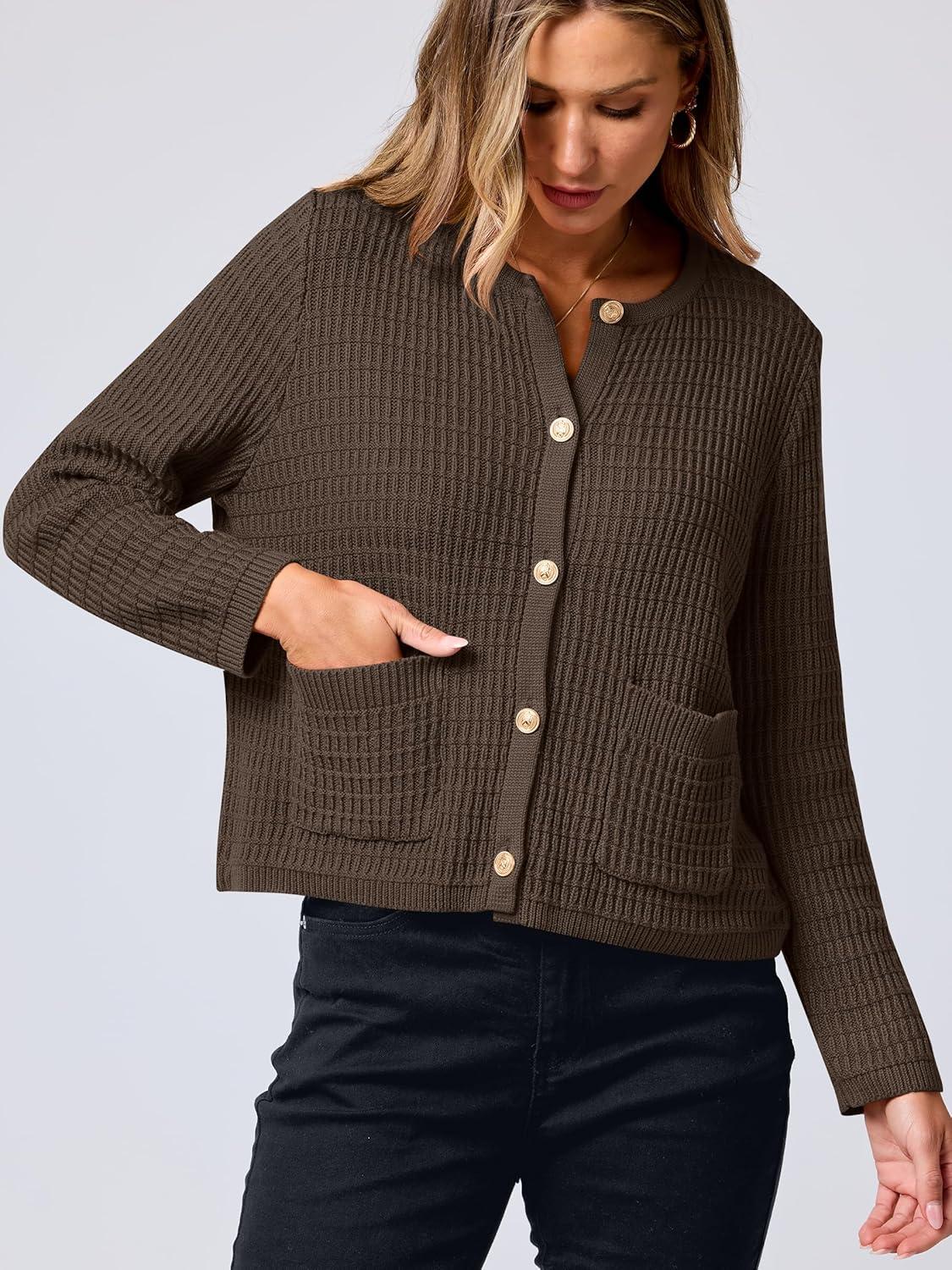 ANRABESS Women Cardigan Sweater Dressy Casual Classic Long Sleeve Crew Neck Button Down Tweed Knit Jacket 2025 Fall Outfits(Coffee)