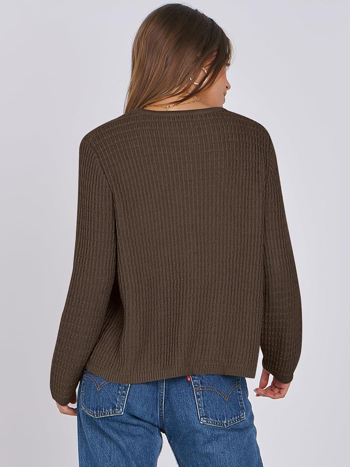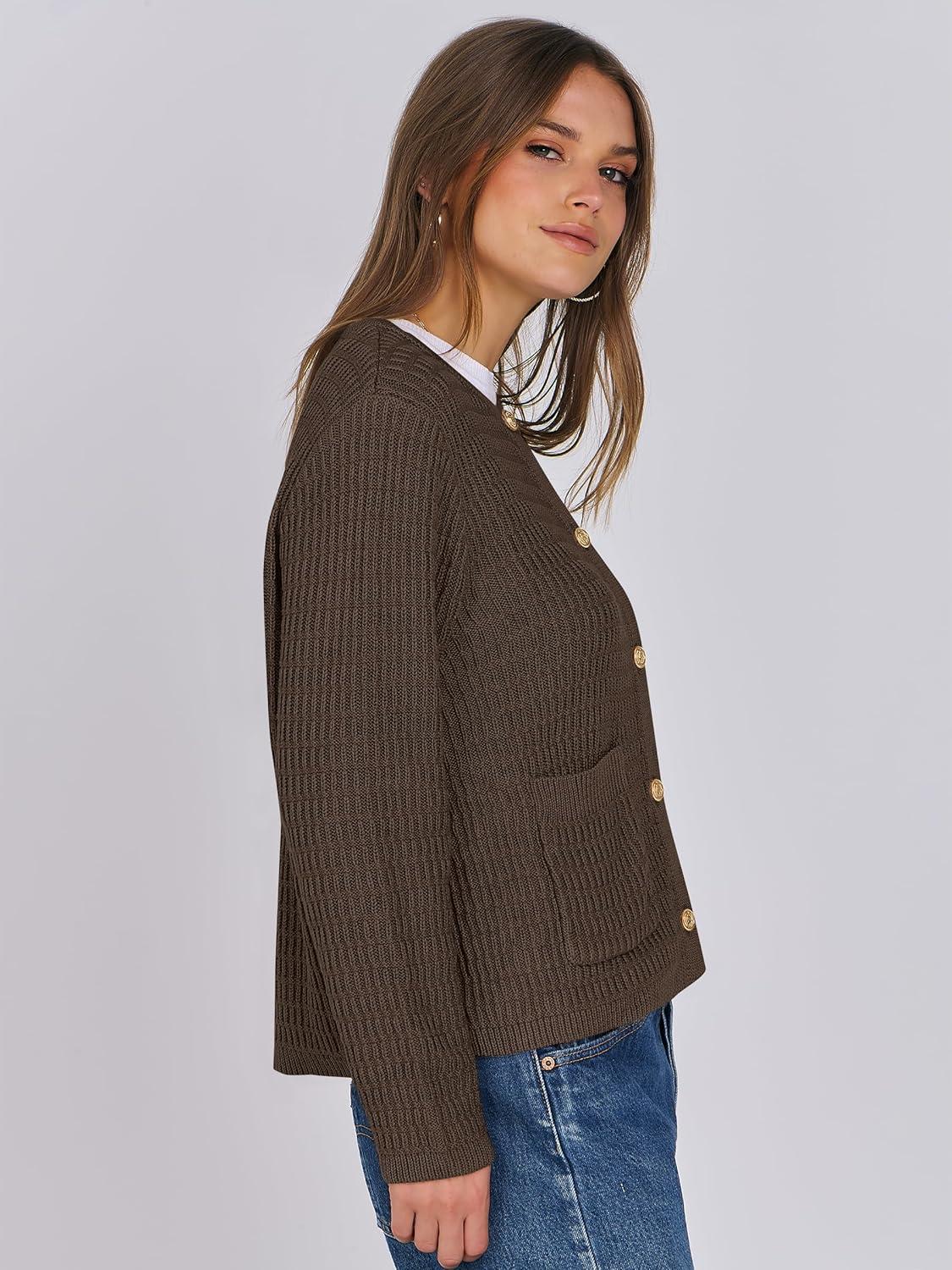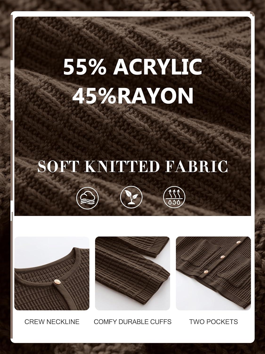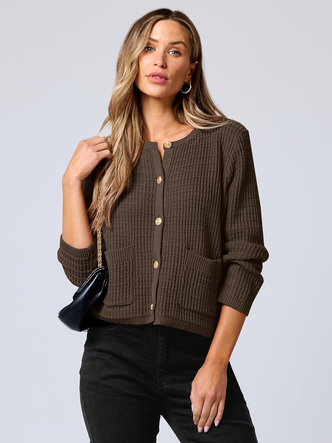 ANRABESS Women Cardigan Sweater Dressy Casual Classic Long Sleeve Crew Neck Button Down Tweed Knit Jacket 2025 Fall Outfits(Coffee)