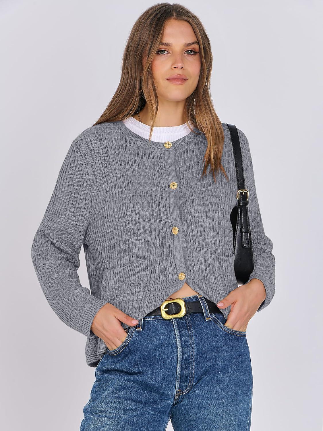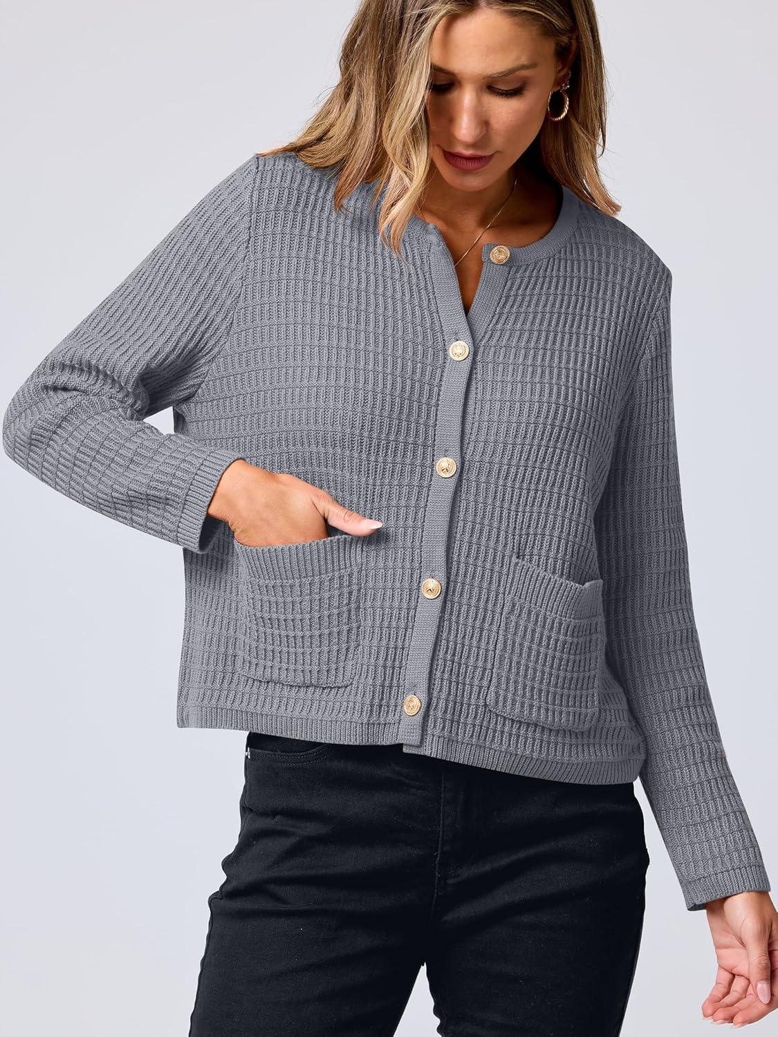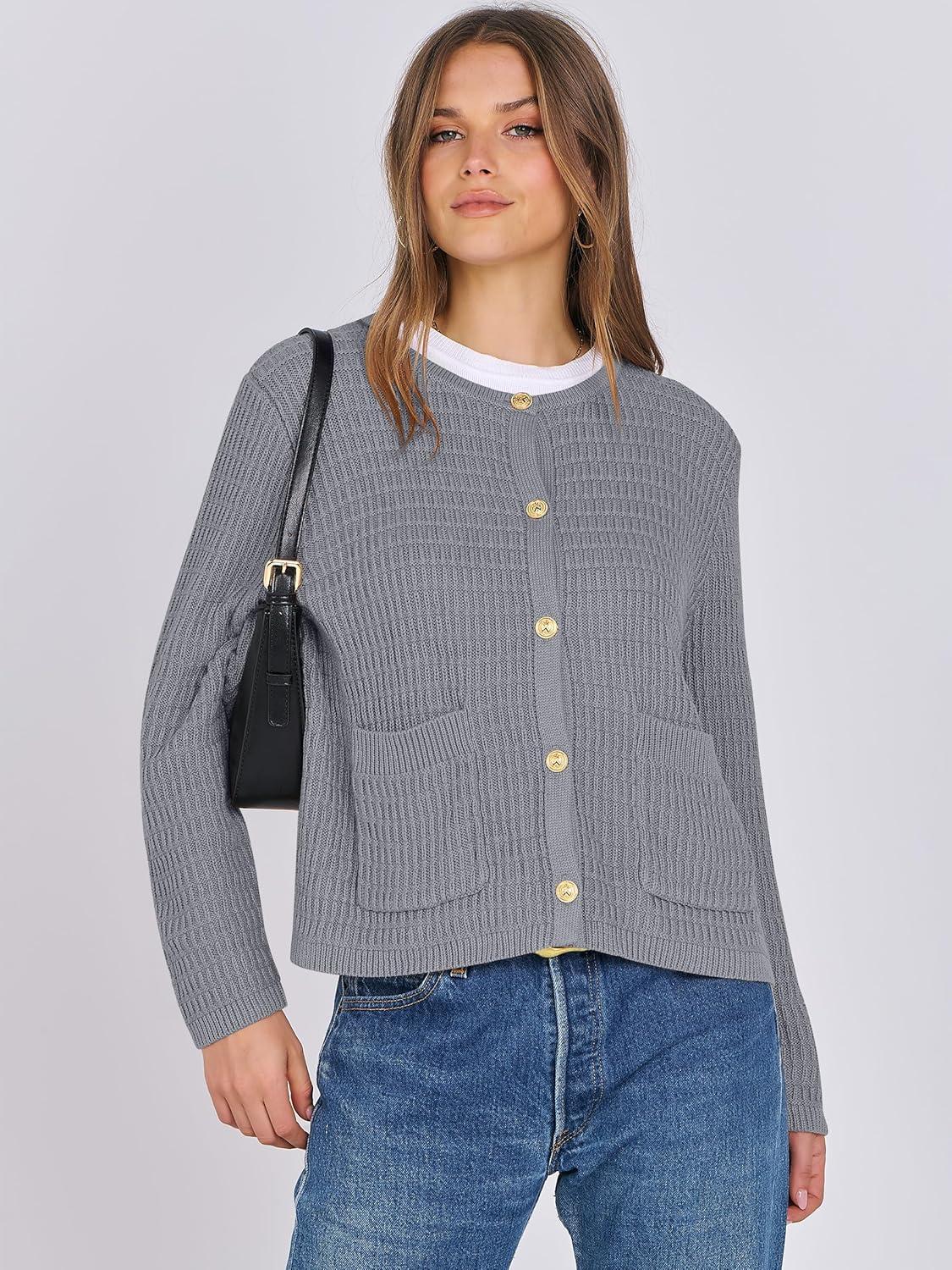 ANRABESS Women Cardigan Sweater Dressy Casual Classic Long Sleeve Crew Neck Button Down Tweed Knit Jacket 2025 Fall Outfits(Grey)