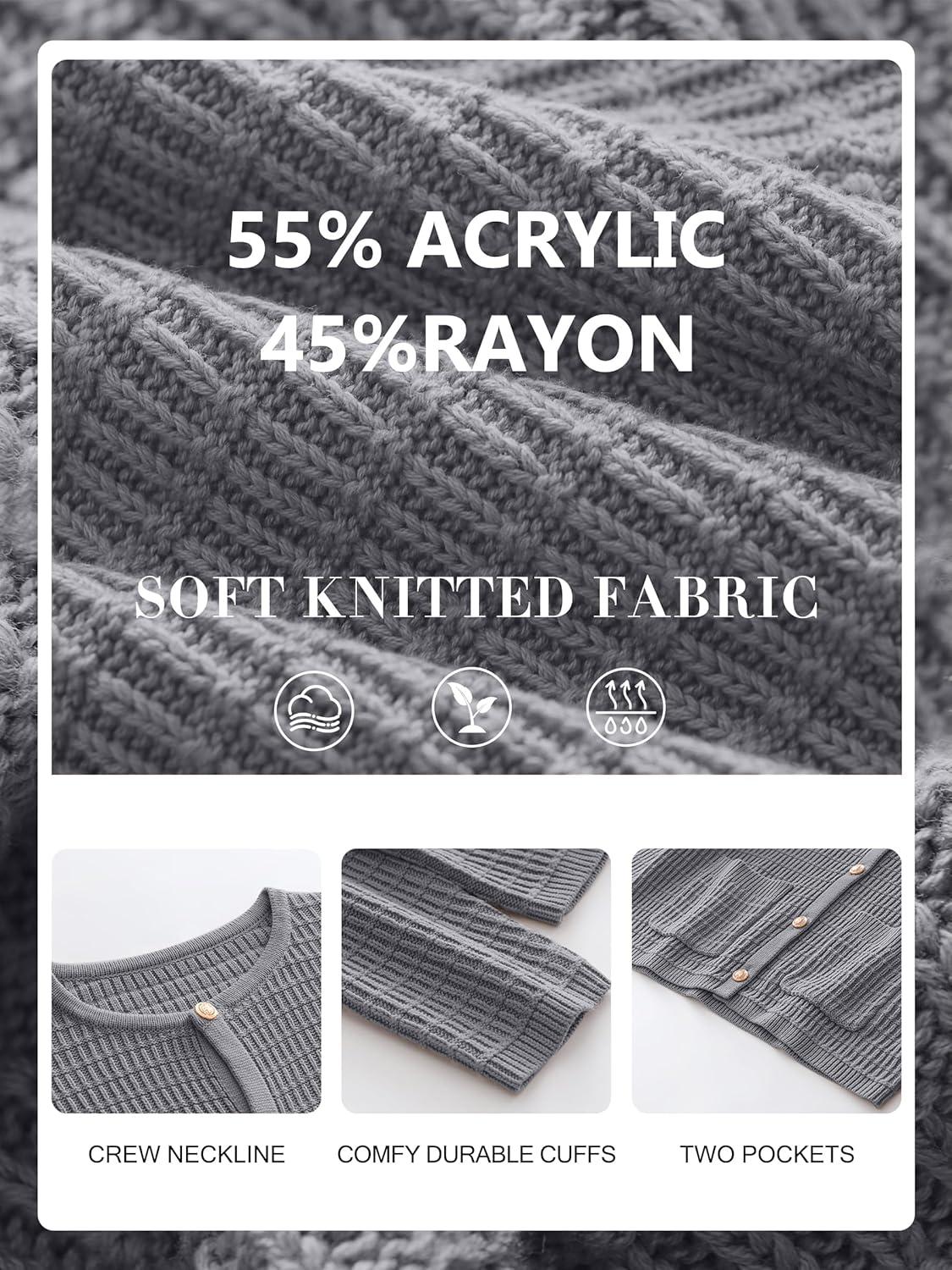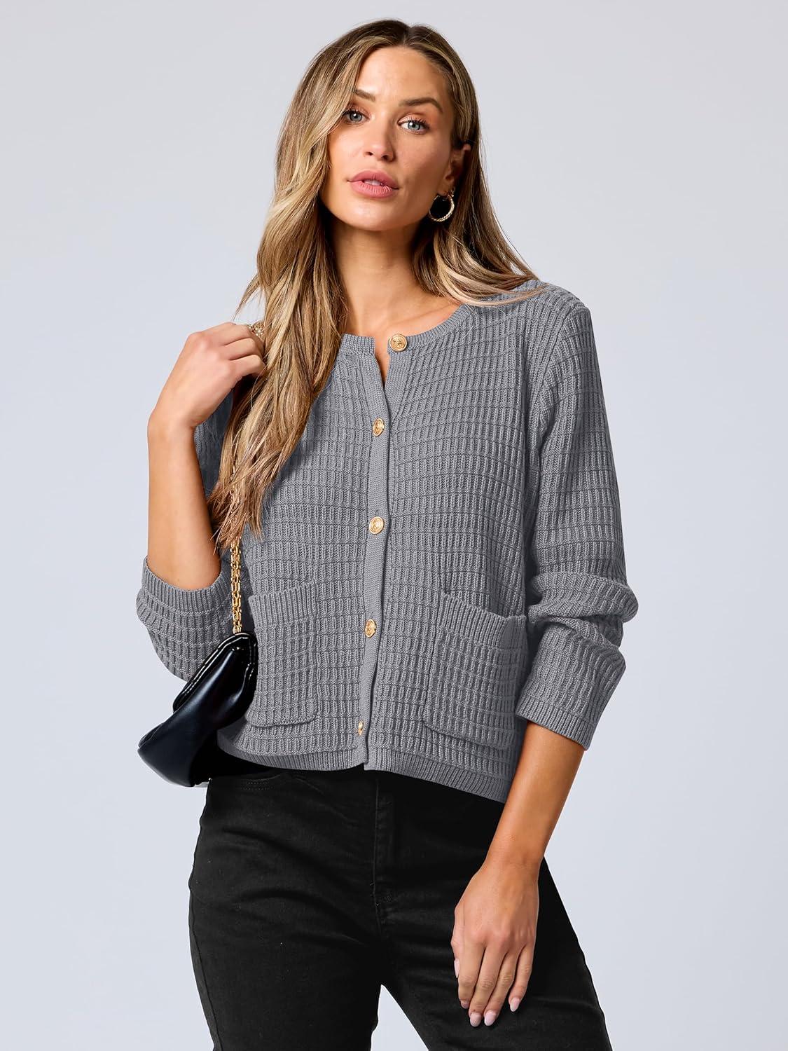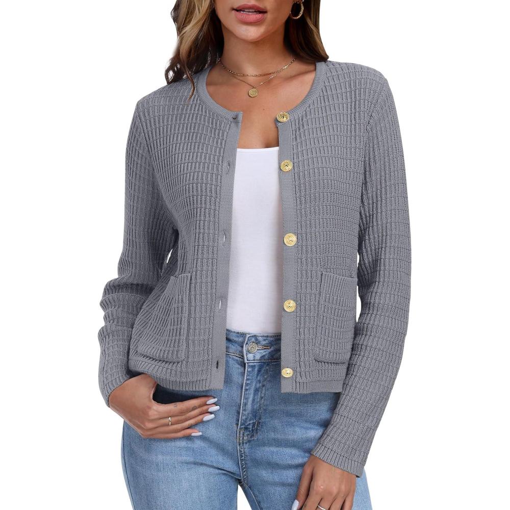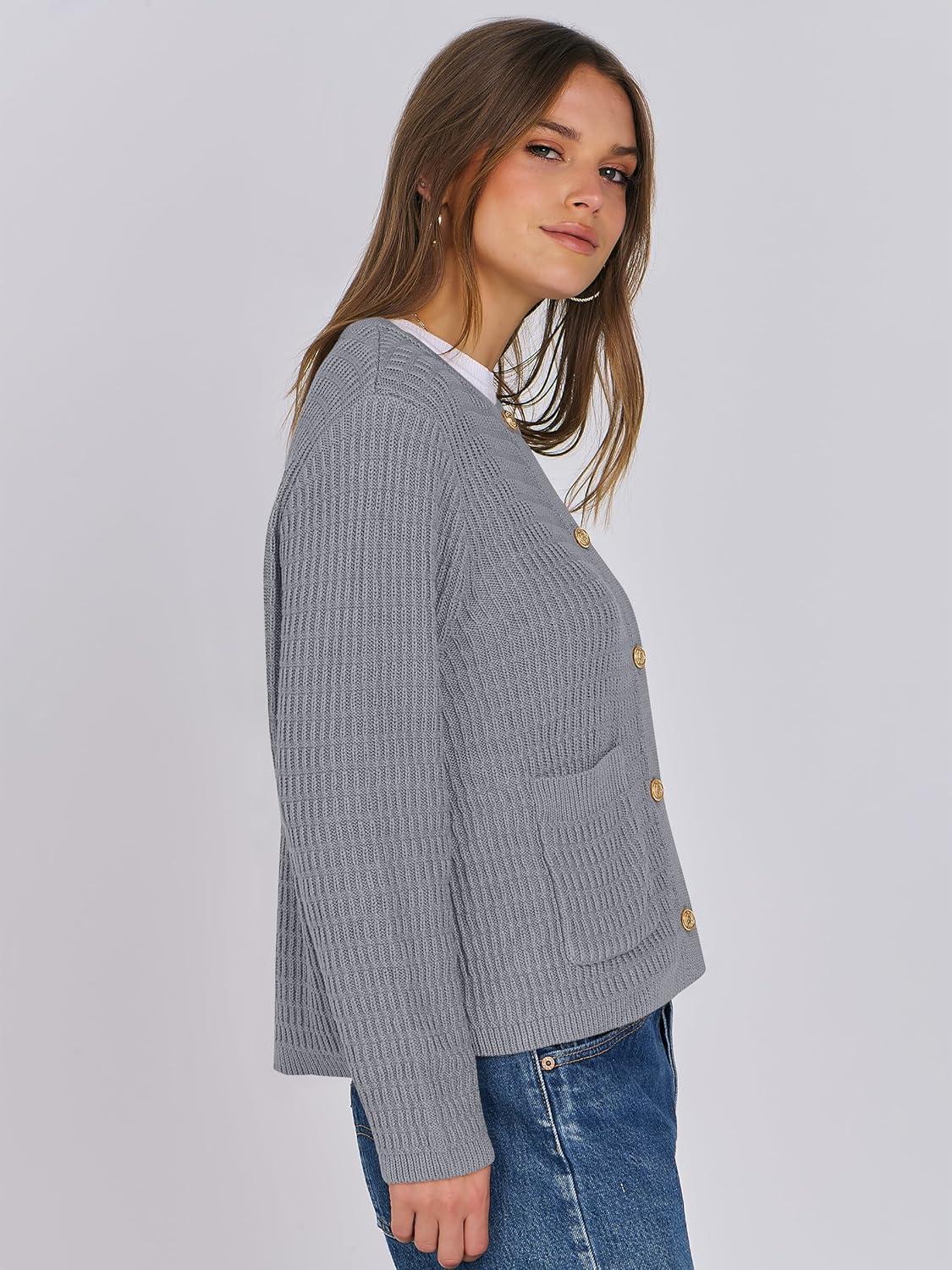 ANRABESS Women Cardigan Sweater Dressy Casual Classic Long Sleeve Crew Neck Button Down Tweed Knit Jacket 2025 Fall Outfits(Grey)