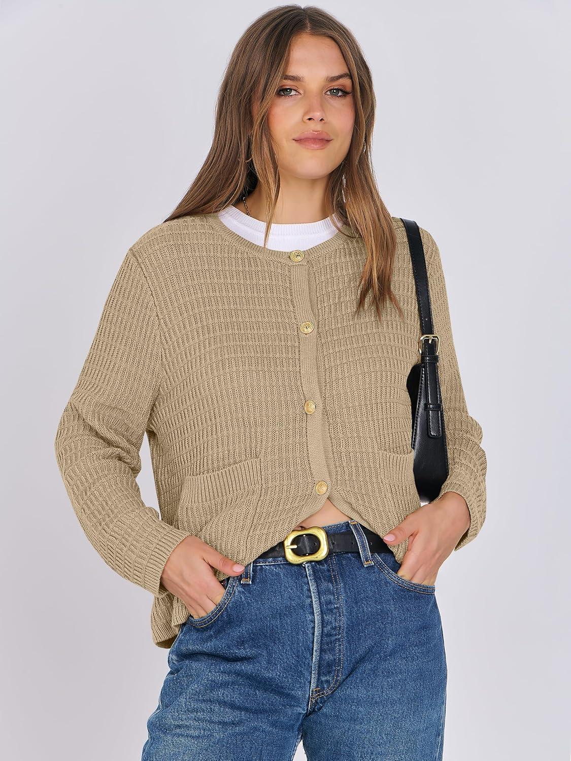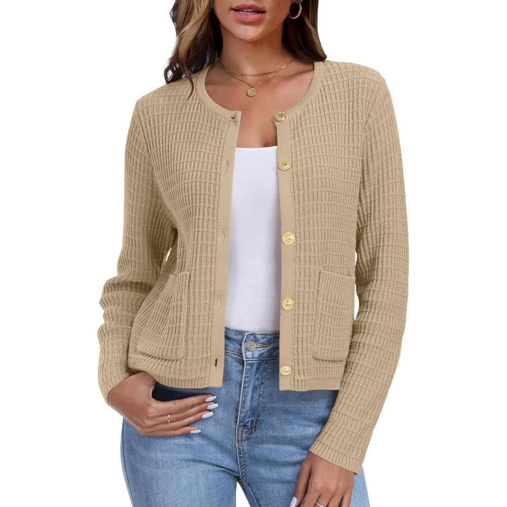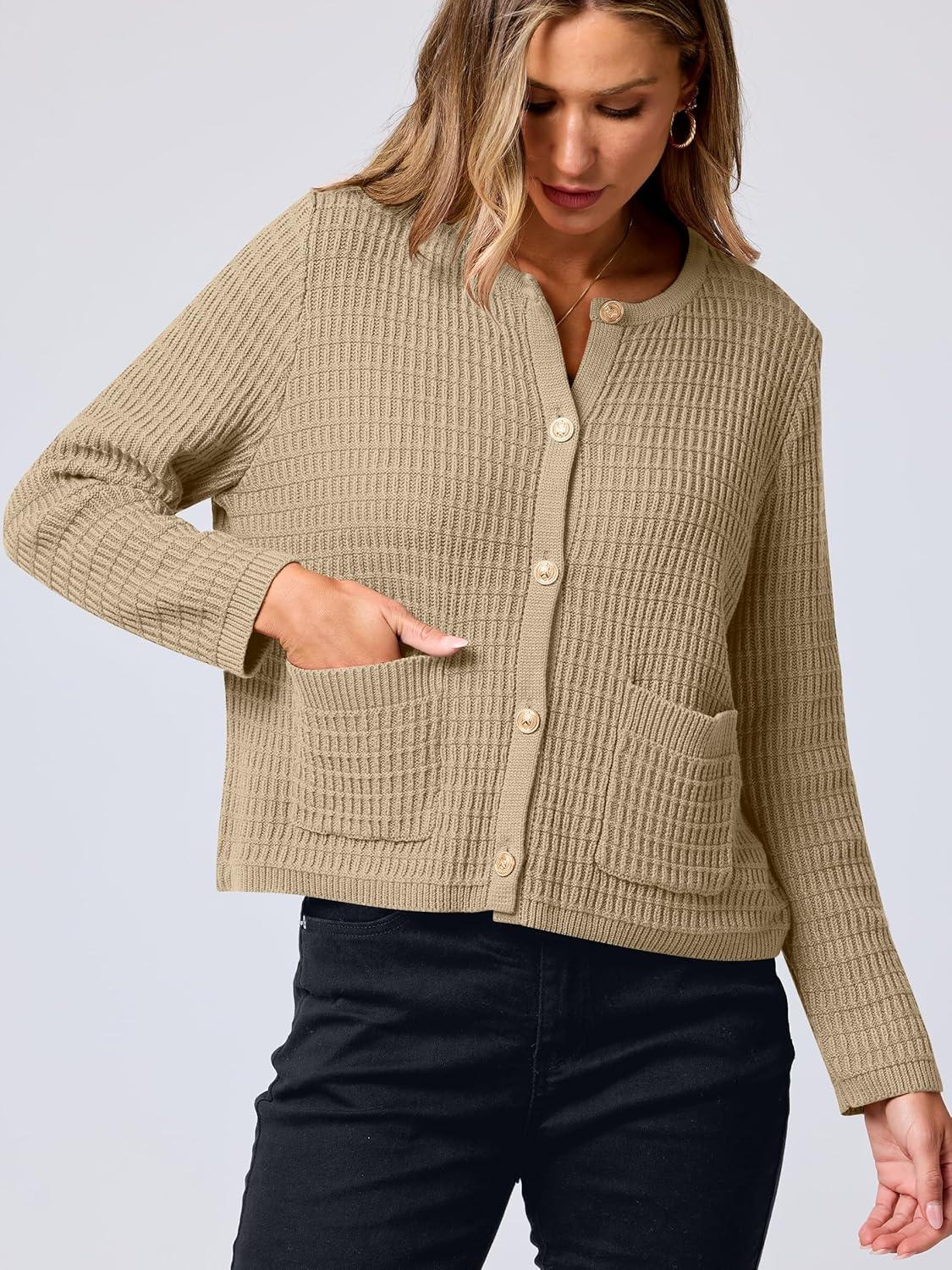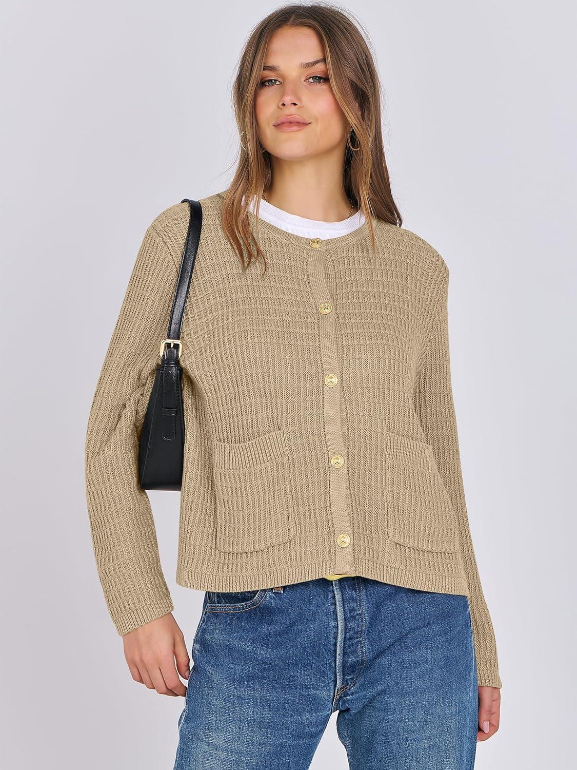ANRABESS Women Cardigan Sweater Dressy Casual Classic Long Sleeve Crew Neck Button Down Tweed Knit Jacket 2025 Fall Outfits(Khaki)