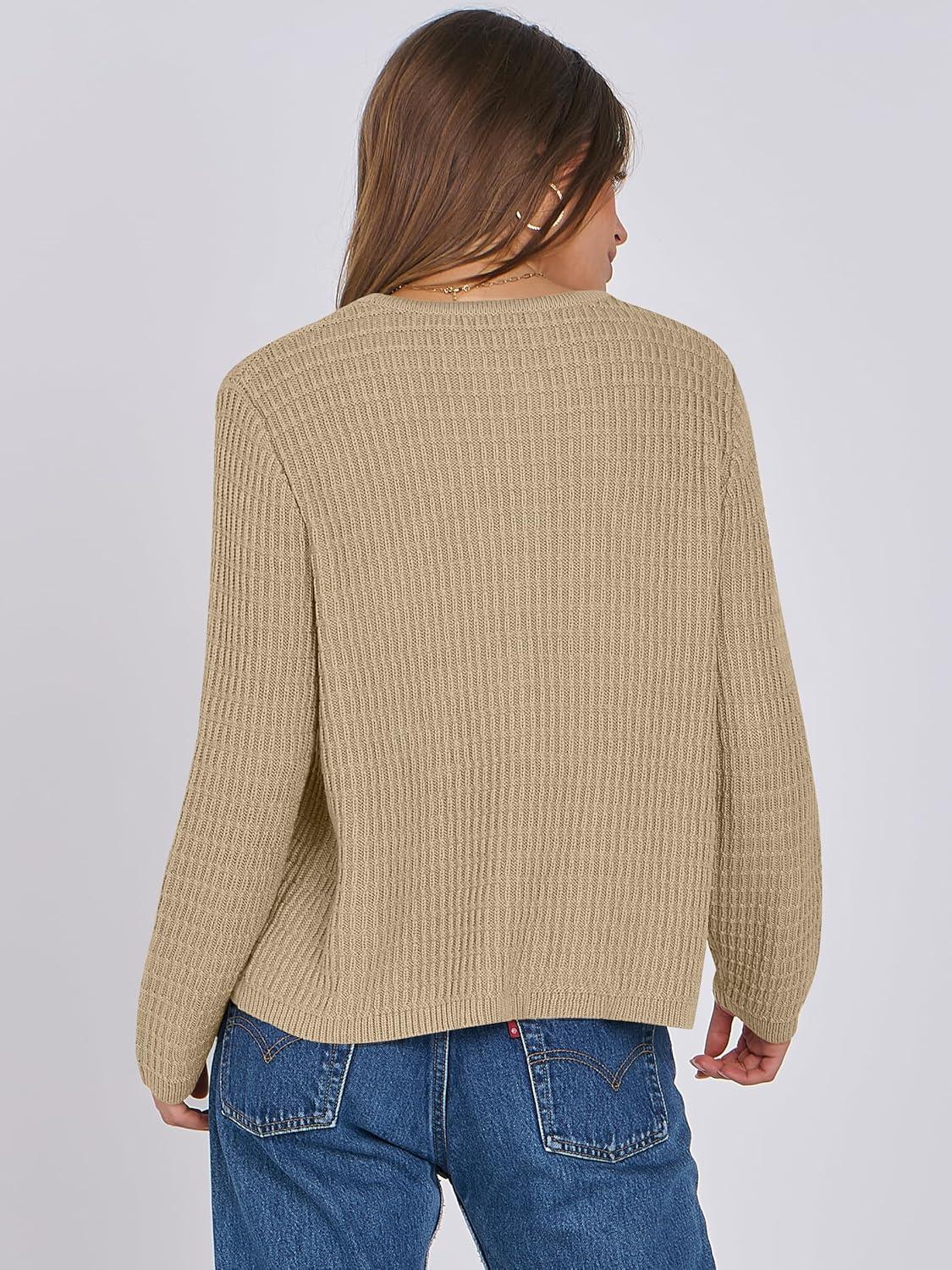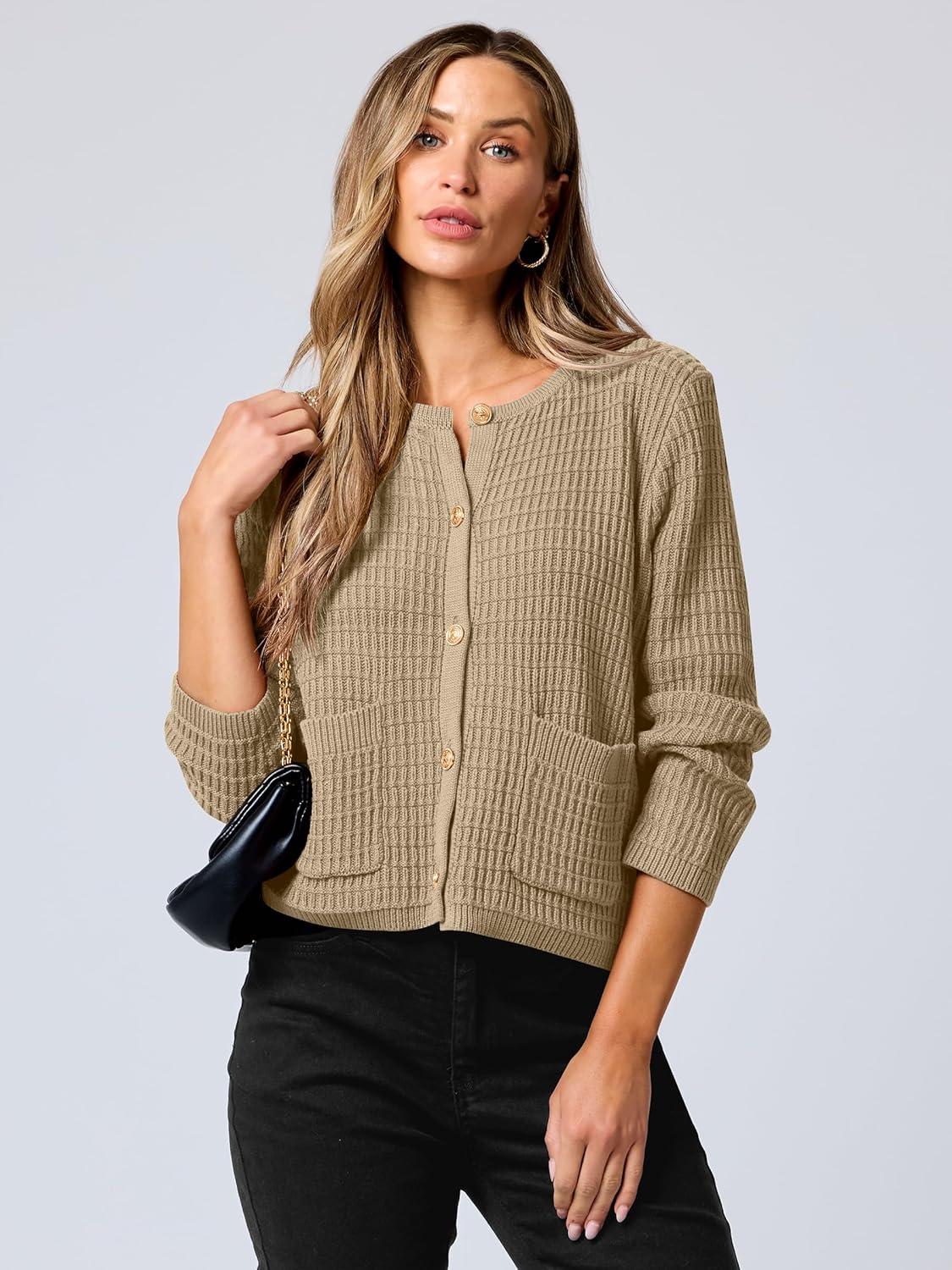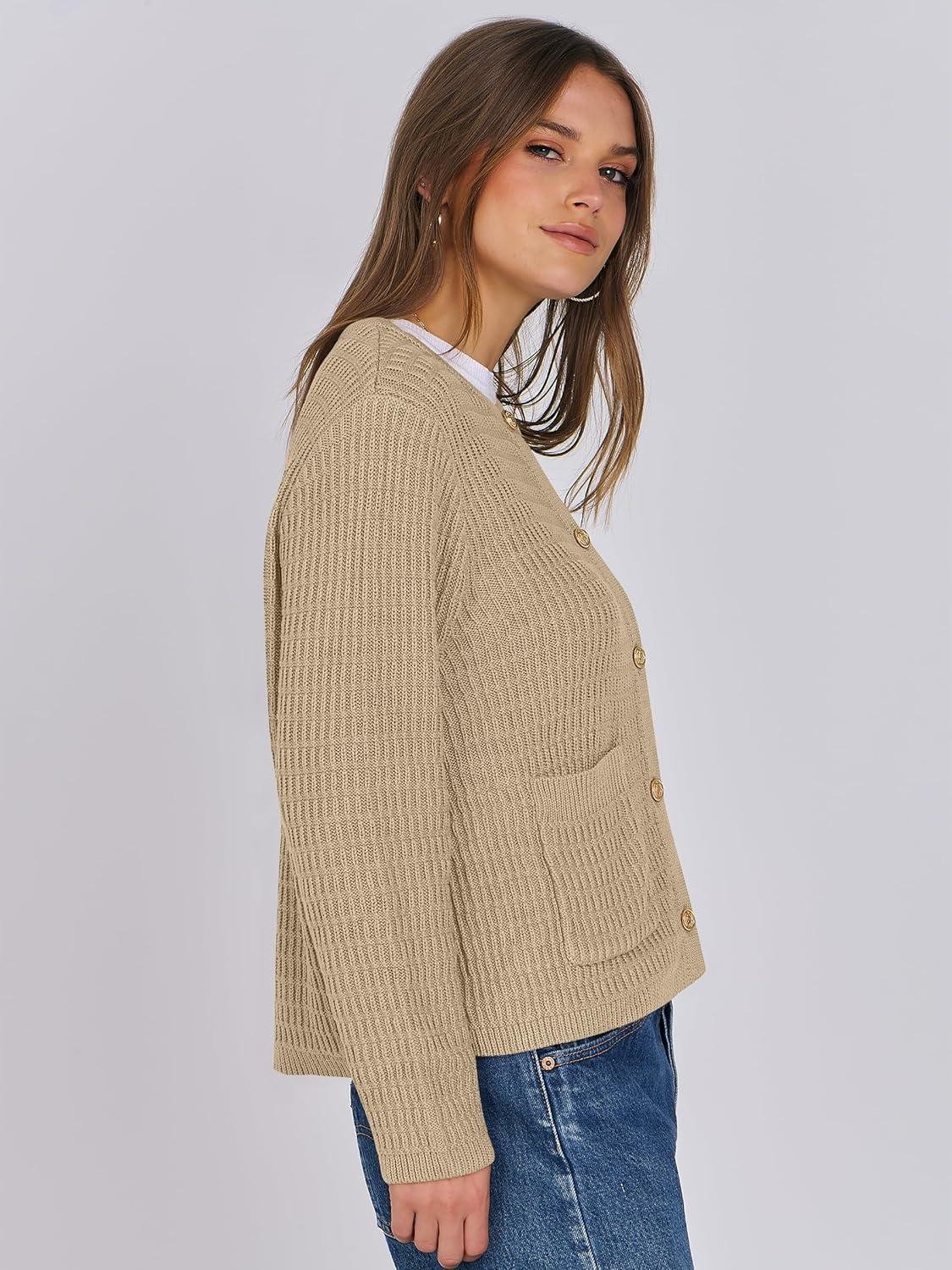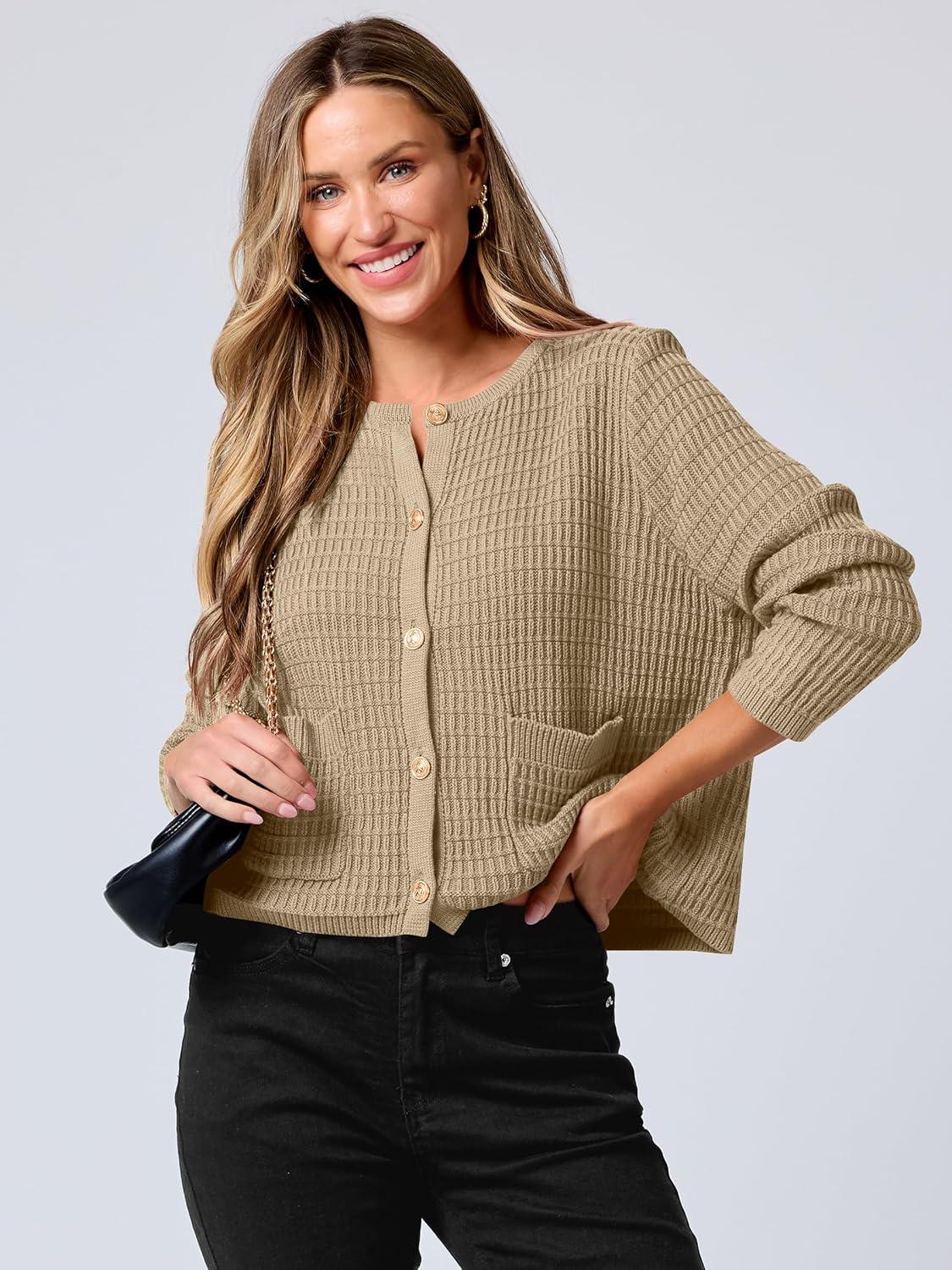 ANRABESS Women Cardigan Sweater Dressy Casual Classic Long Sleeve Crew Neck Button Down Tweed Knit Jacket 2025 Fall Outfits(Khaki)
