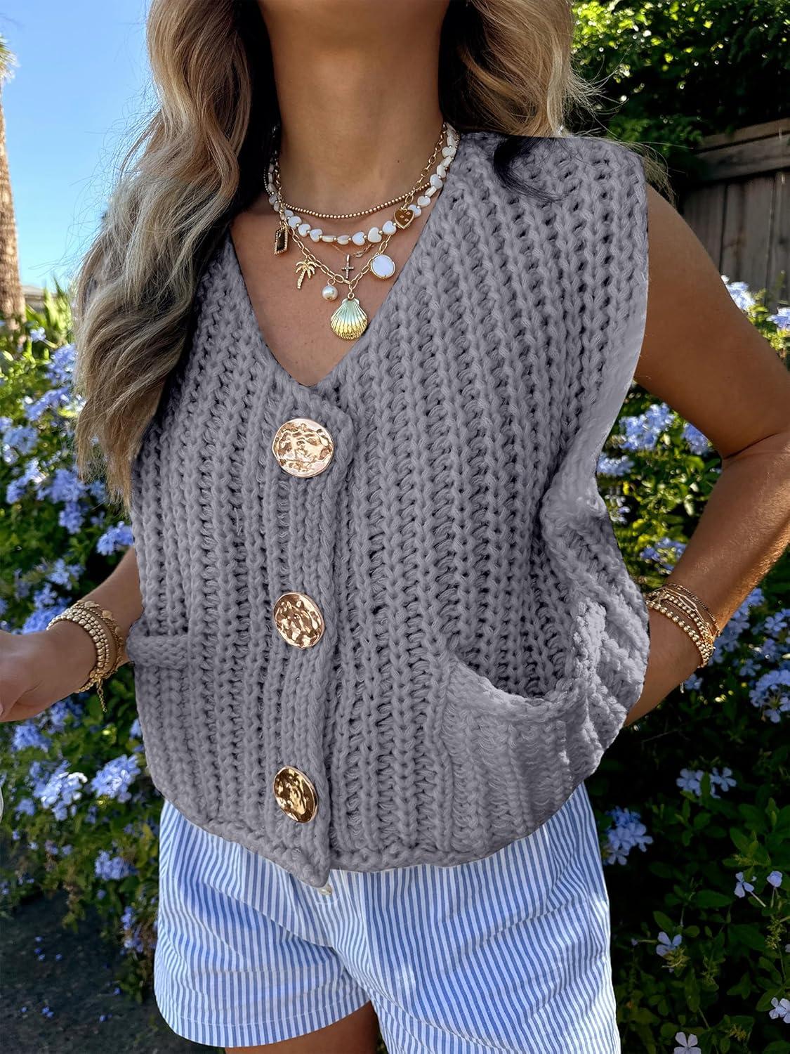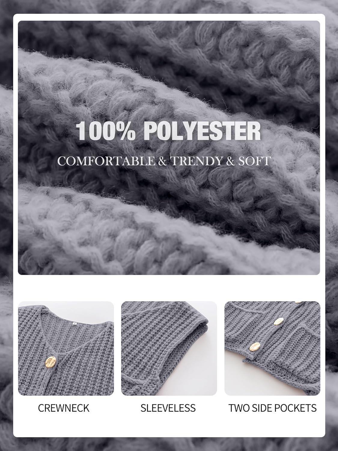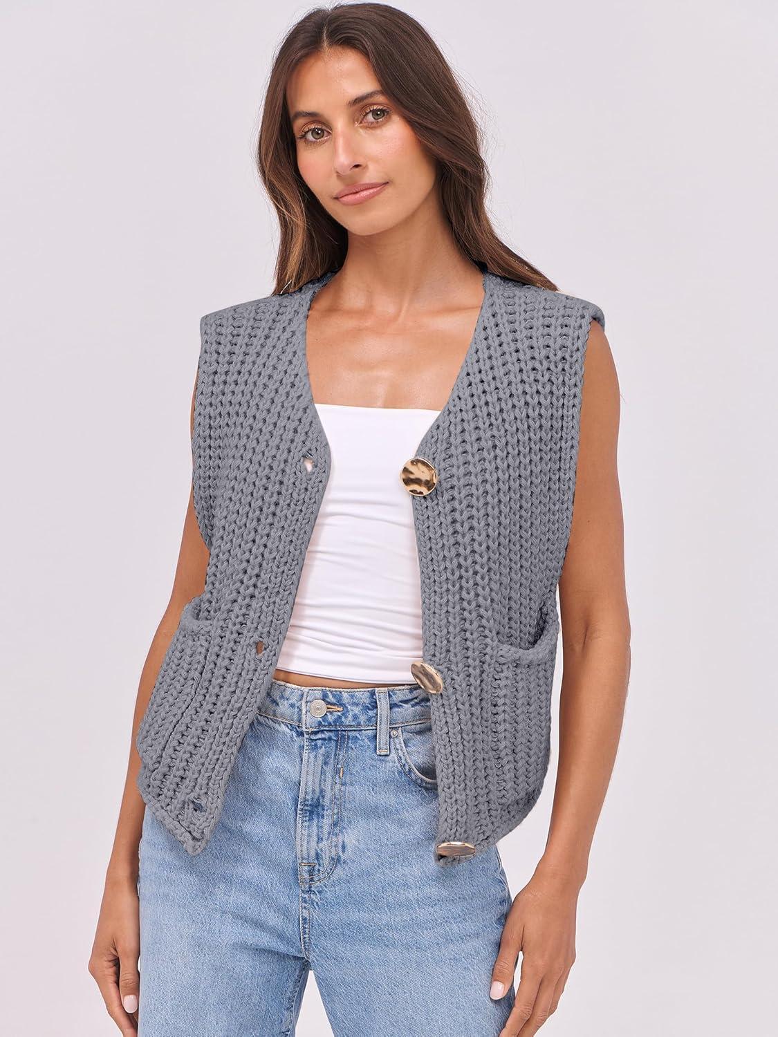 ANRABESS Women Chunky Knit Sweater Vest Button Down Casual Sleeveless Cardigan with Pockets Spring Trendy Outfits 2025(Gray)