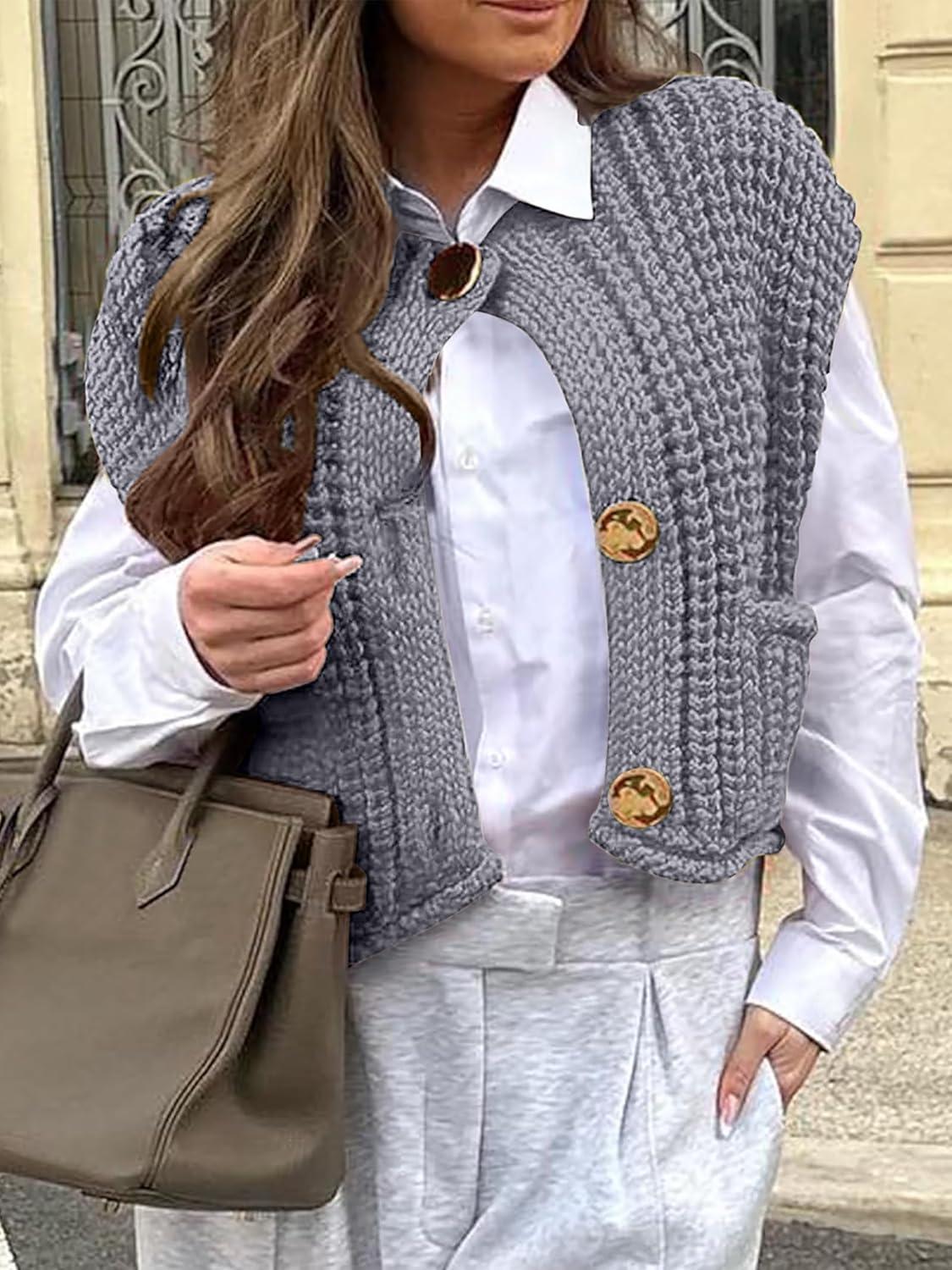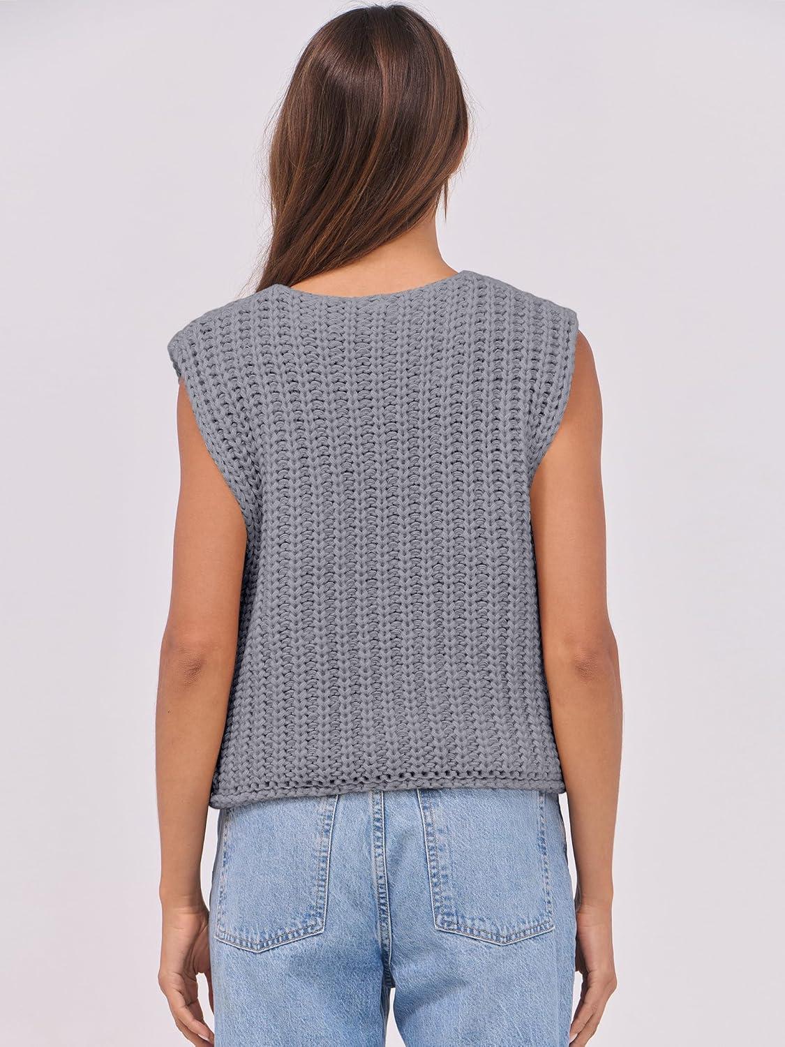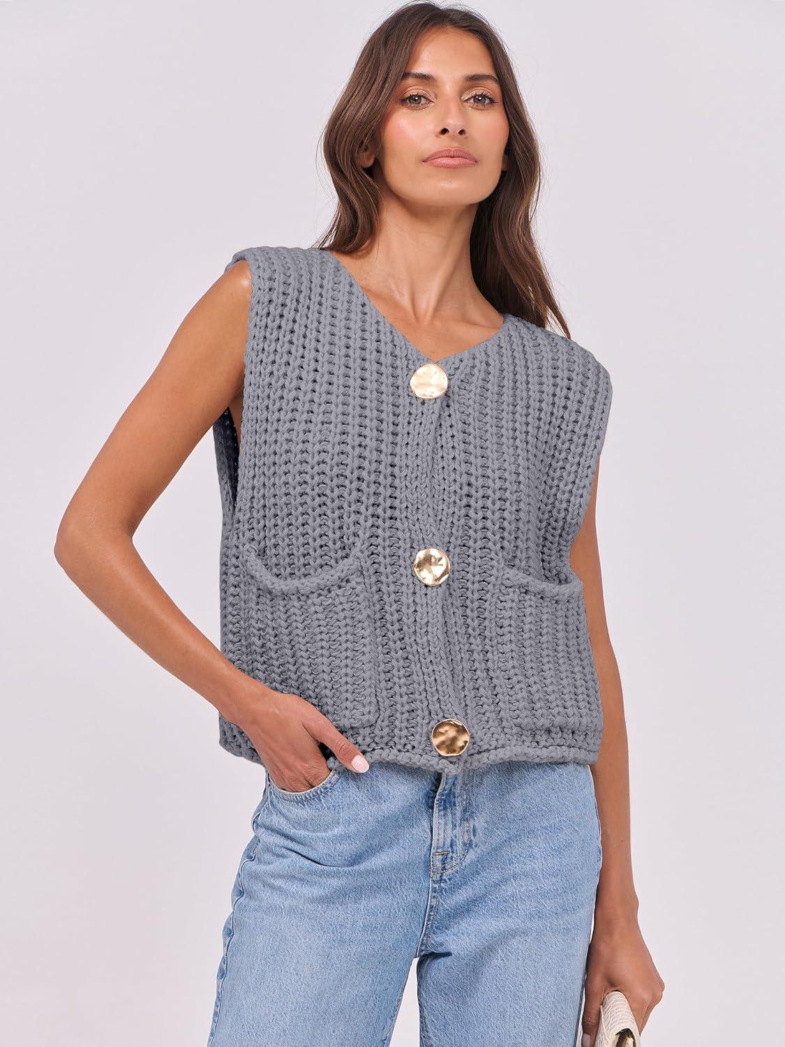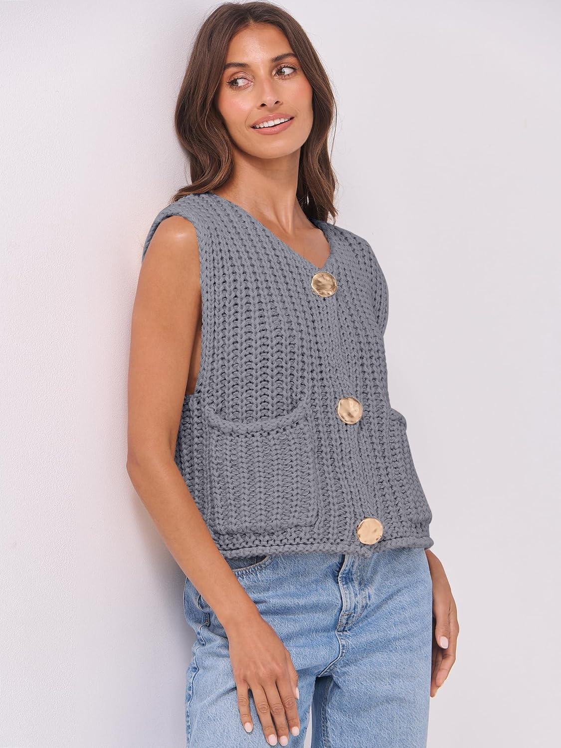 ANRABESS Women Chunky Knit Sweater Vest Button Down Casual Sleeveless Cardigan with Pockets Spring Trendy Outfits 2025(Gray)