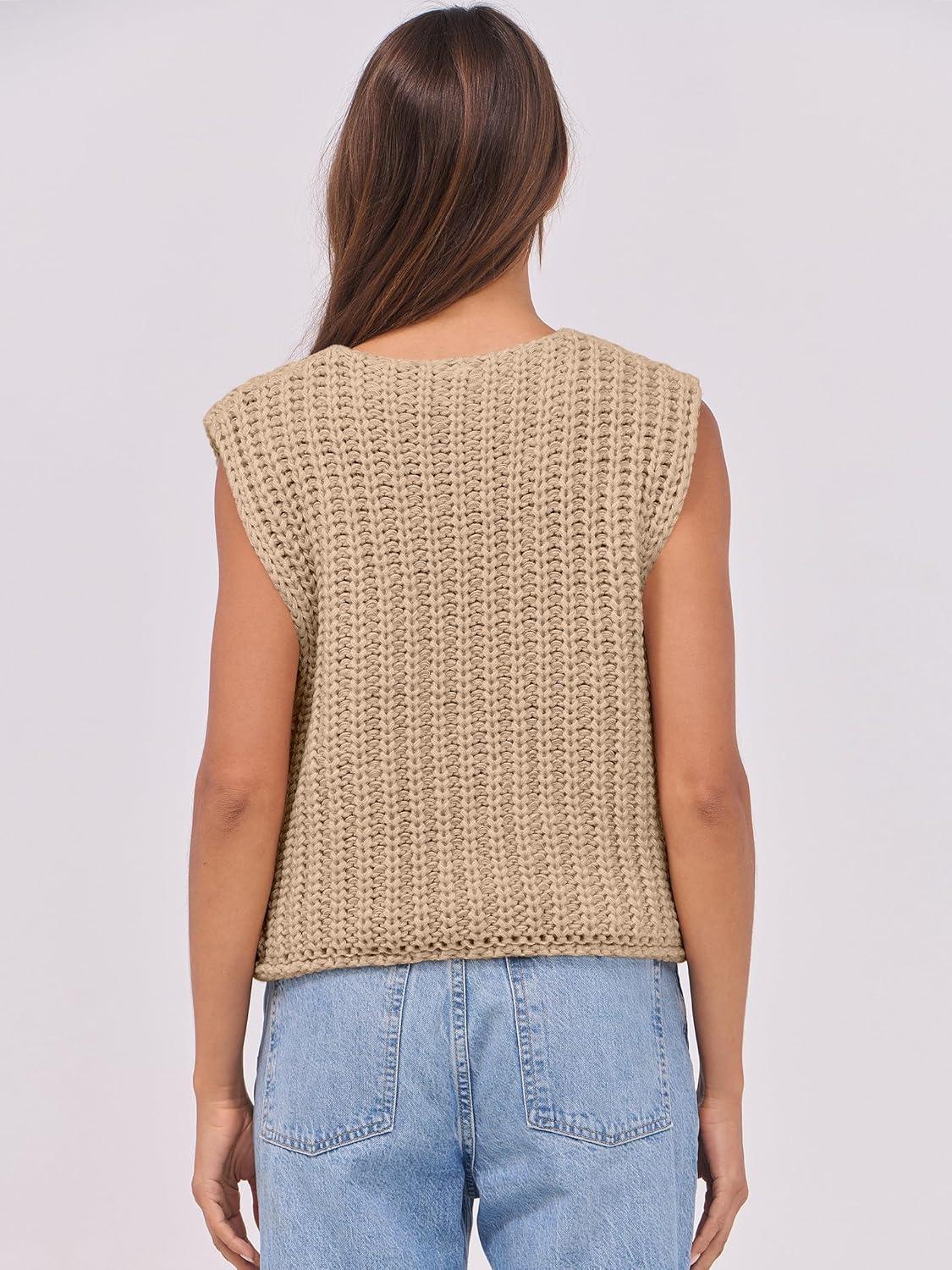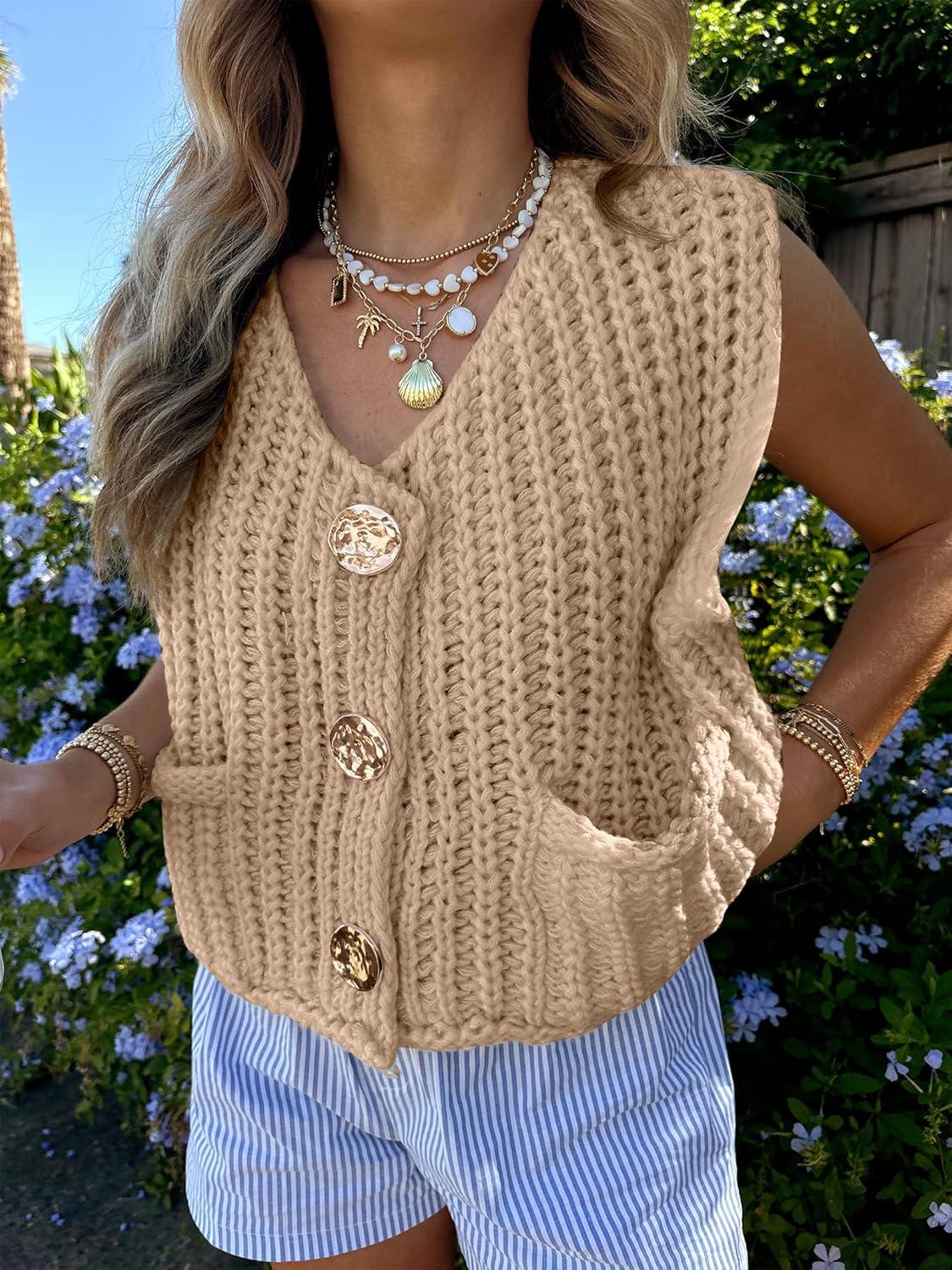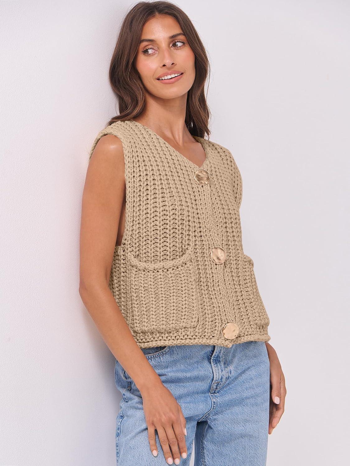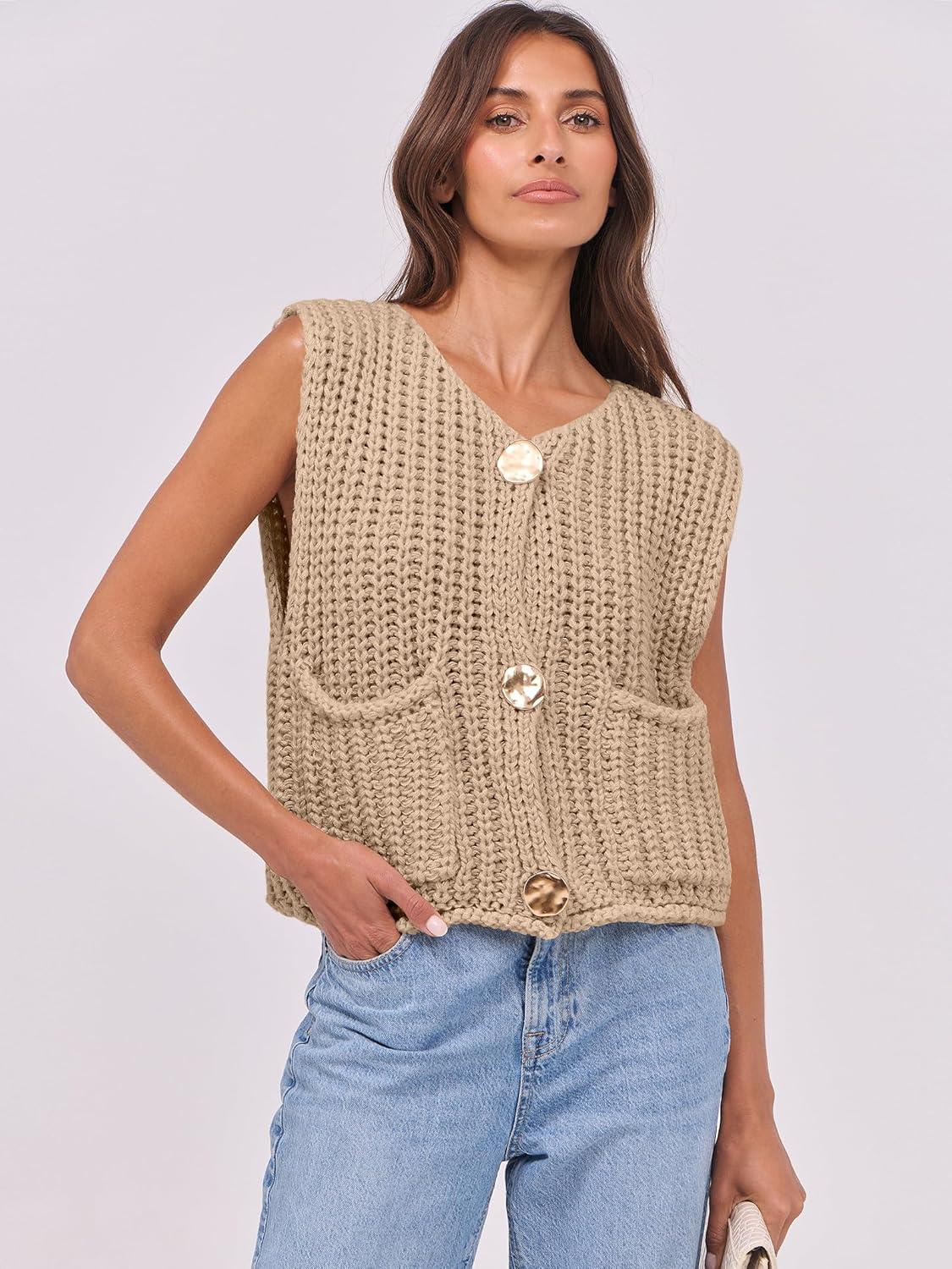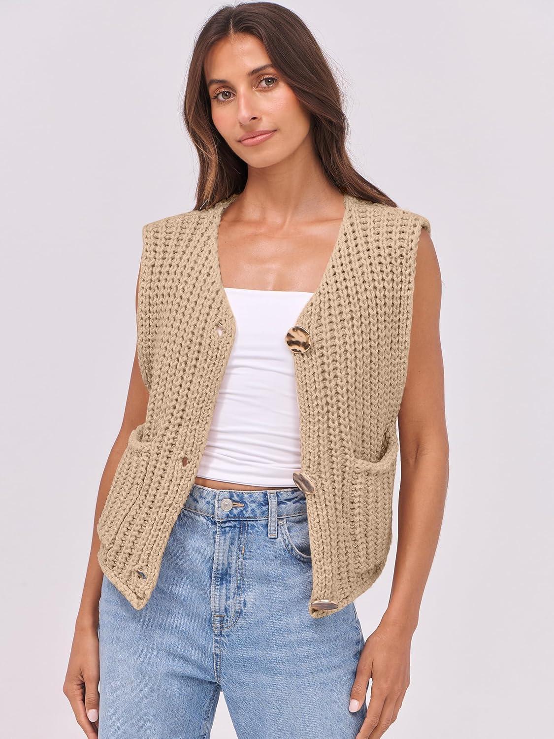 imageANRABESS Women Chunky Knit Sweater Vest Button Down Casual Sleeveless Cardigan with Pockets Spring Trendy Outfits 2025Khaki