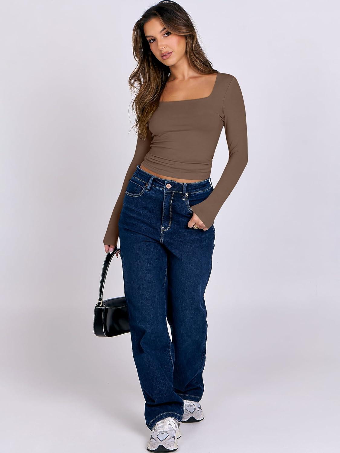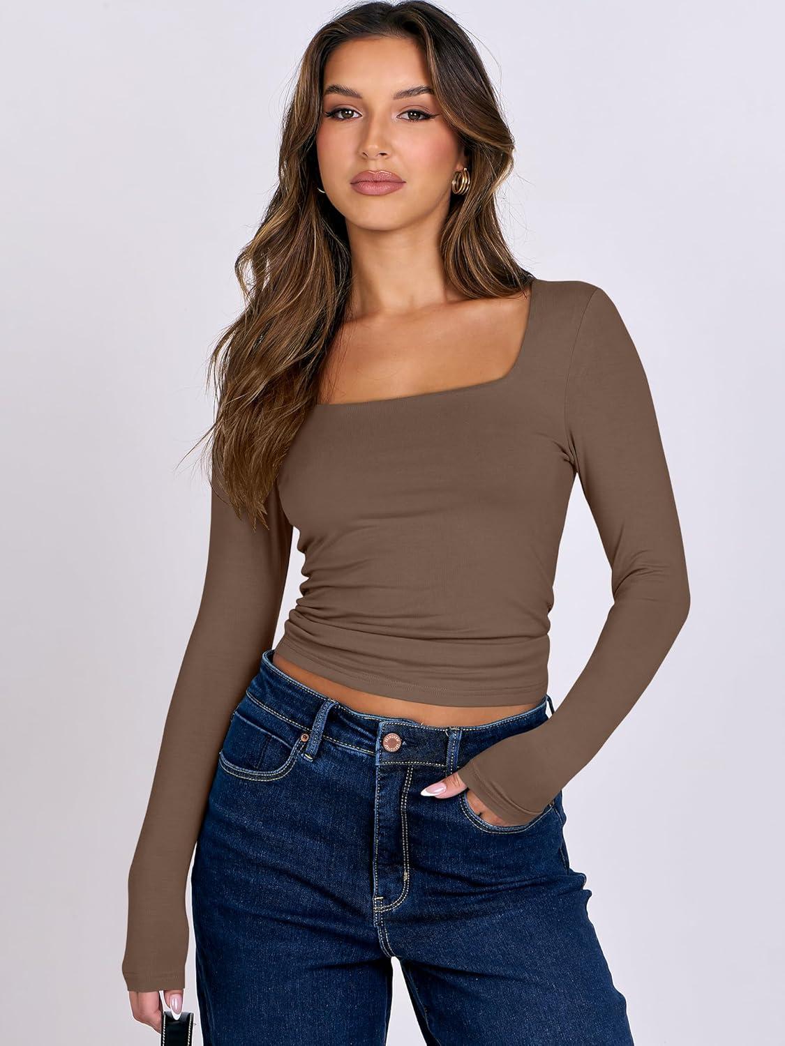 ANRABESS Women Double Lined Long Sleeve Crop Tops Shirts Square Neck Tight Fitted Going Out T-Shirt Basic Tee Outfits 2025(Brown)