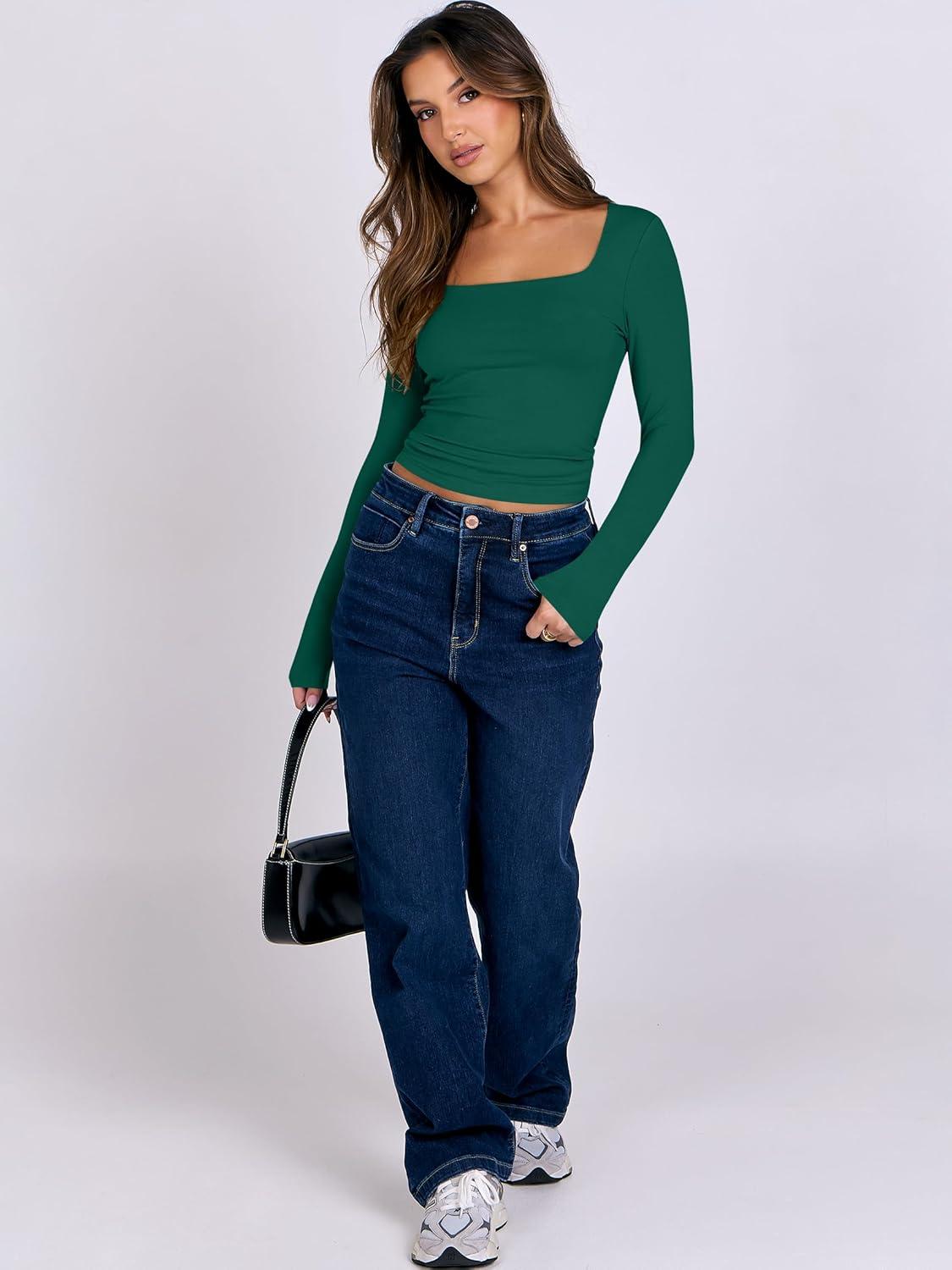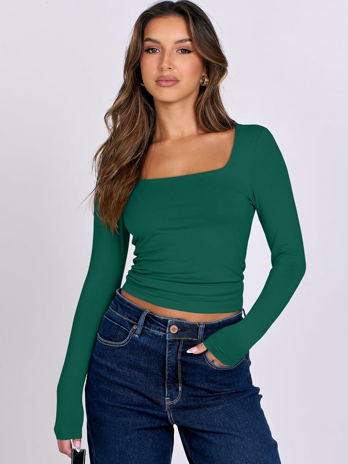 ANRABESS Women Double Lined Long Sleeve Crop Tops Shirts Square Neck Tight Fitted Going Out T-Shirt Basic Tee Outfits 2025(Forest Green)