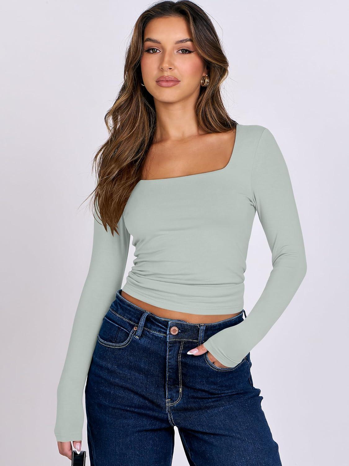 ANRABESS Women Double Lined Long Sleeve Crop Tops Shirts Square Neck Tight Fitted Going Out T-Shirt Basic Tee Outfits 2025(Light Green)