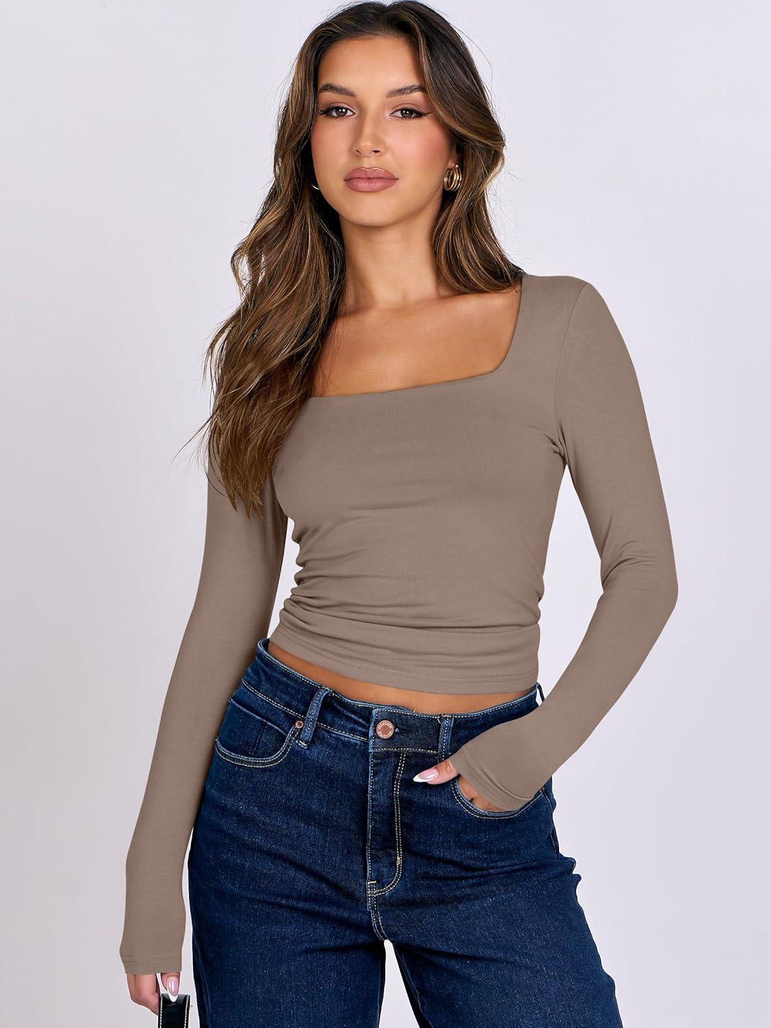 ANRABESS Women Double Lined Long Sleeve Crop Tops Shirts Square Neck Tight Fitted Going Out T-Shirt Basic Tee Outfits 2025(Light Tan Khaki)
