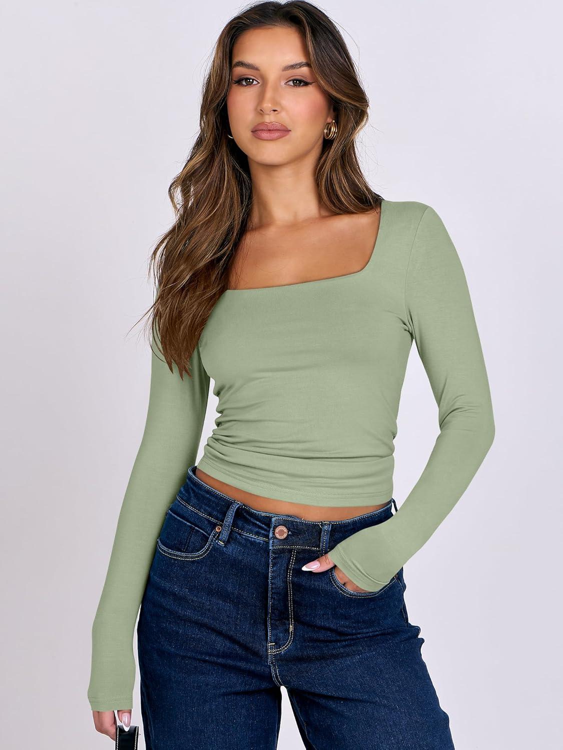 ANRABESS Women Double Lined Long Sleeve Crop Tops Shirts Square Neck Tight Fitted Going Out T-Shirt Basic Tee Outfits 2025(Pea Green)