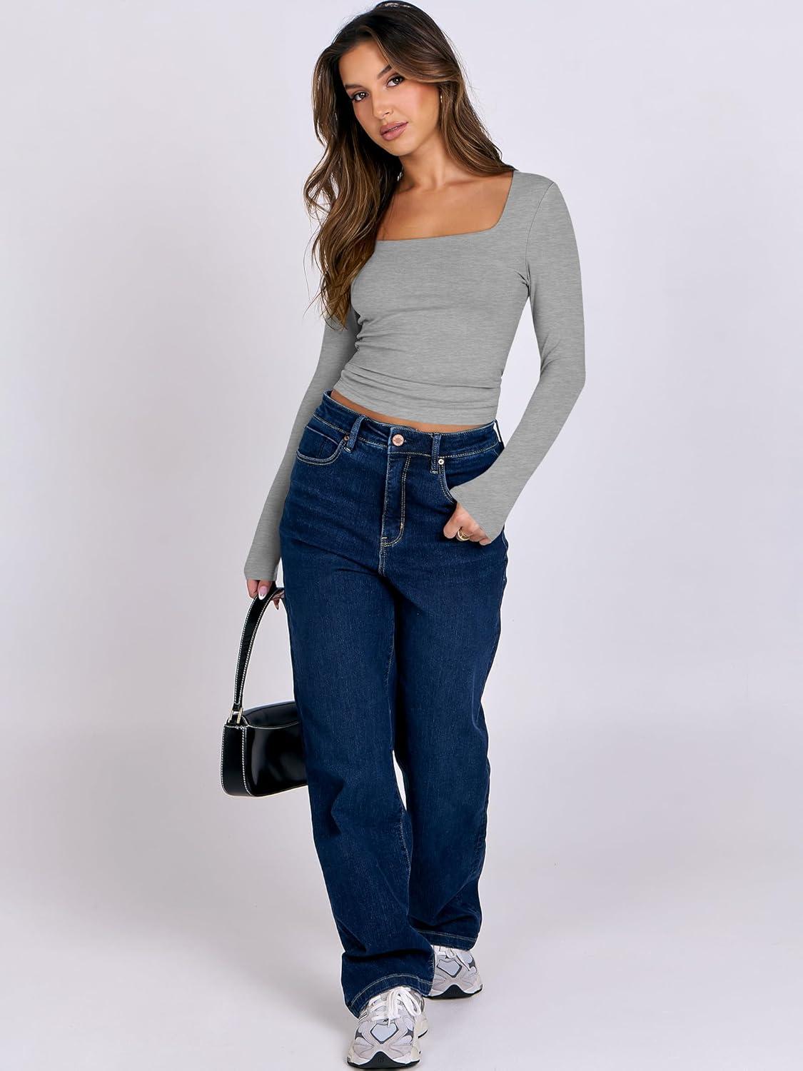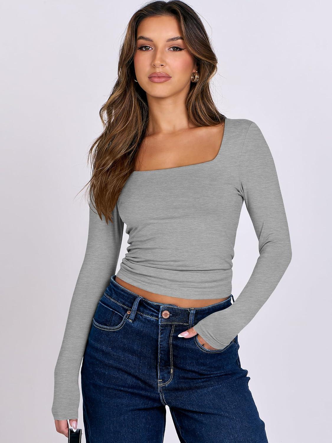ANRABESS Women Double Lined Long Sleeve Crop Tops Shirts Square Neck Tight Fitted Going Out T-Shirt Basic Tee Outfits 2026(Grey)