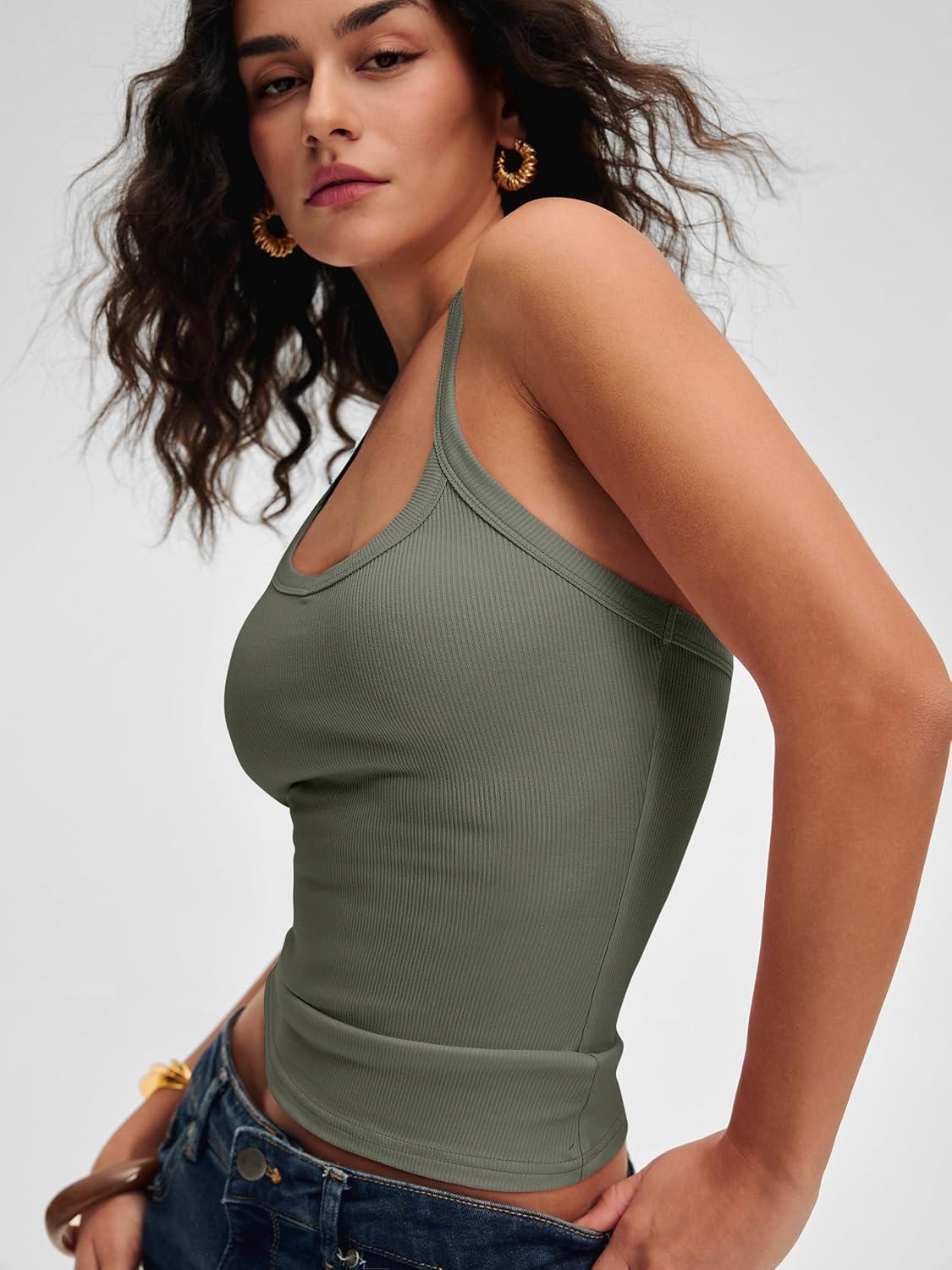 ANRABESS Women Halter Crop Tank Tops V Neck Backless Ribbed Fitted Sleeveless Cami Shirts 2026 Summer Workout Gym Clothes(Army Green)