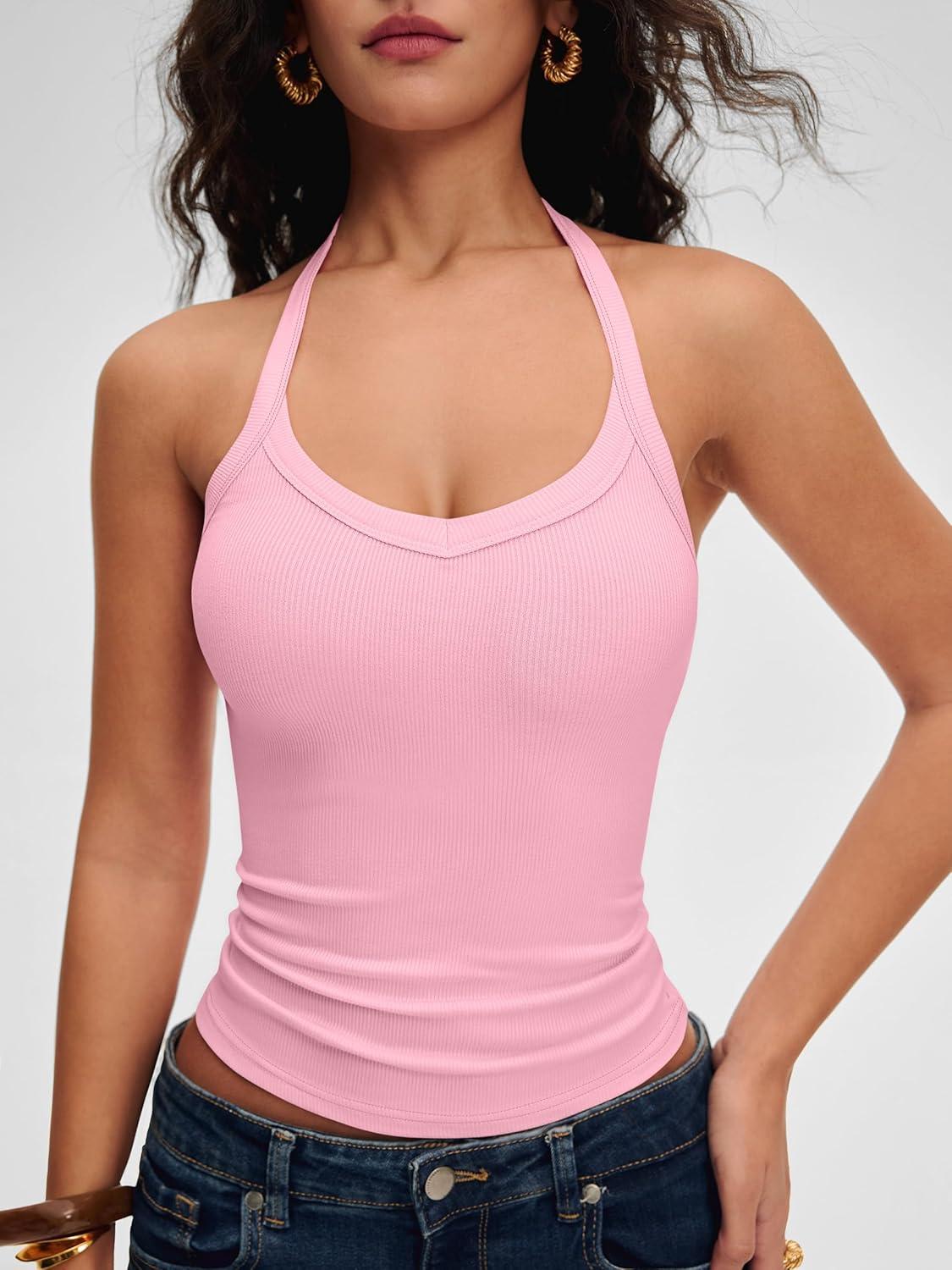 ANRABESS Women Halter Crop Tank Tops V Neck Backless Ribbed Fitted Sleeveless Cami Shirts 2026 Summer Workout Gym Clothes(Pink)
