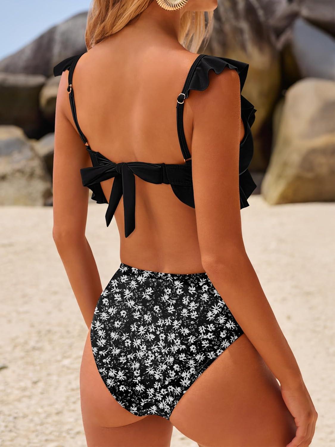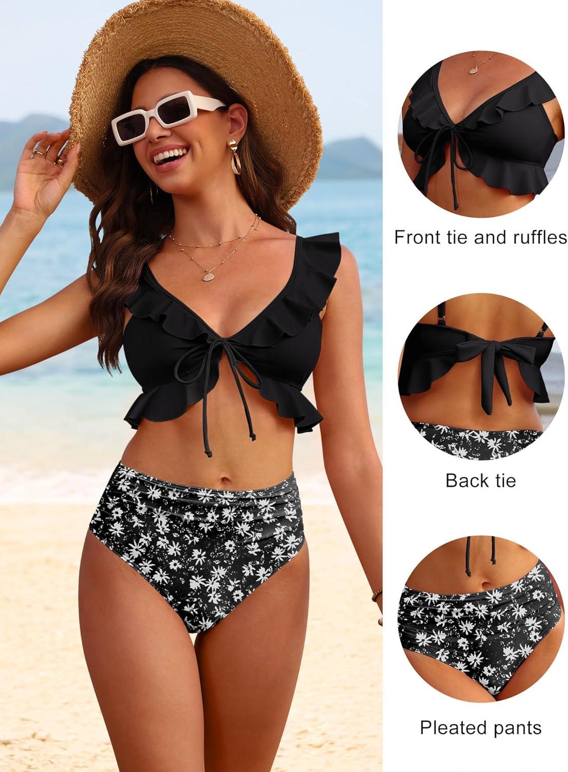 ANRABESS Women High Waisted Bikini Sets Two Piece Ruffled Self Tie Swimsuit Ruched Bathing Suit 2026 Summer Beach Swimwear(Black White Floral)