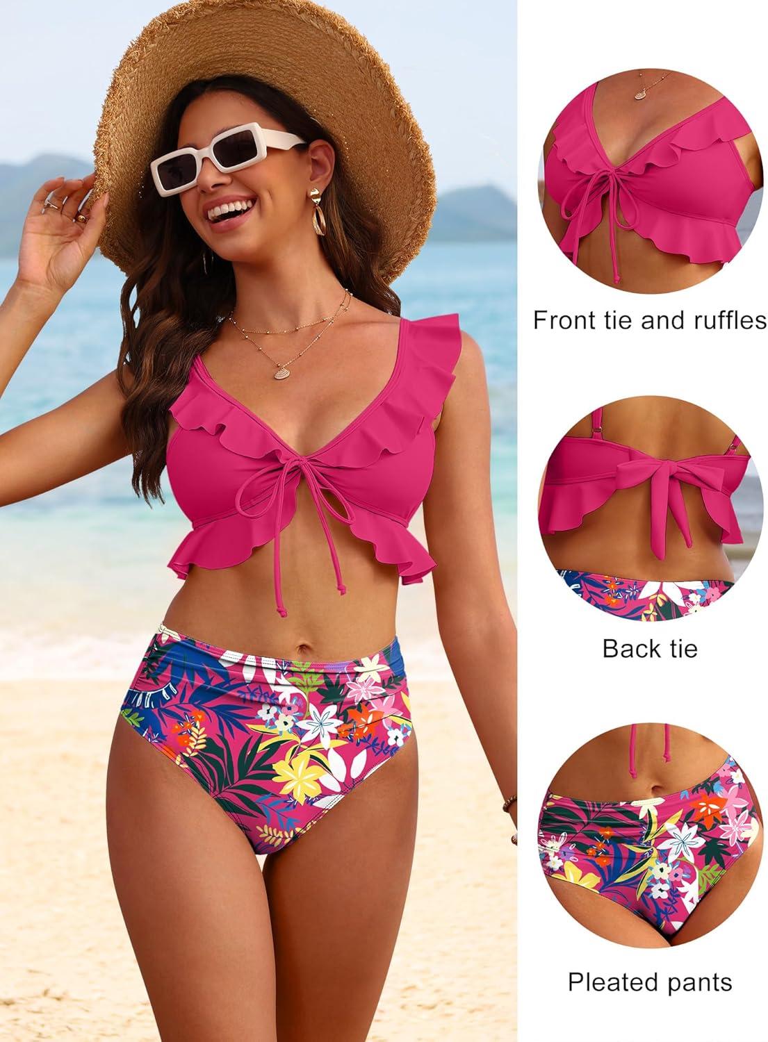 ANRABESS Women High Waisted Bikini Sets Two Piece Ruffled Self Tie Swimsuit Ruched Bathing Suit 2026 Summer Beach Swimwear(Hot Pink Floral)