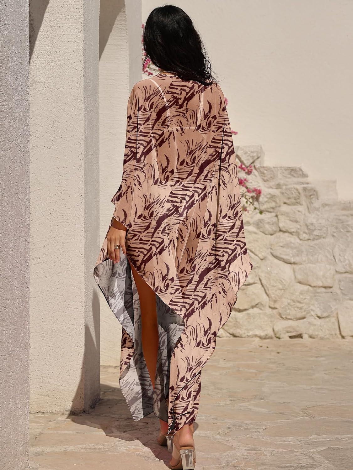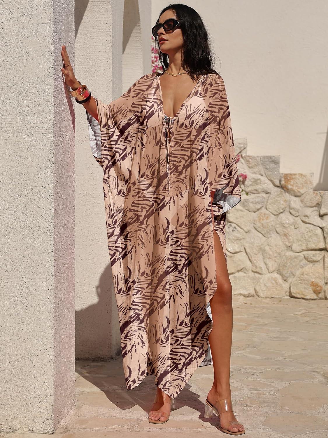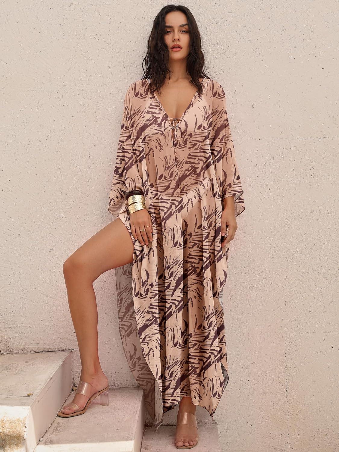 ANRABESS Women Kaftan Moo Moos Dresses Floral Batwing Sleeve V Neck Beach Swimsuit Cover Up Caftan Maxi Dress(Khaki Brown Floral)