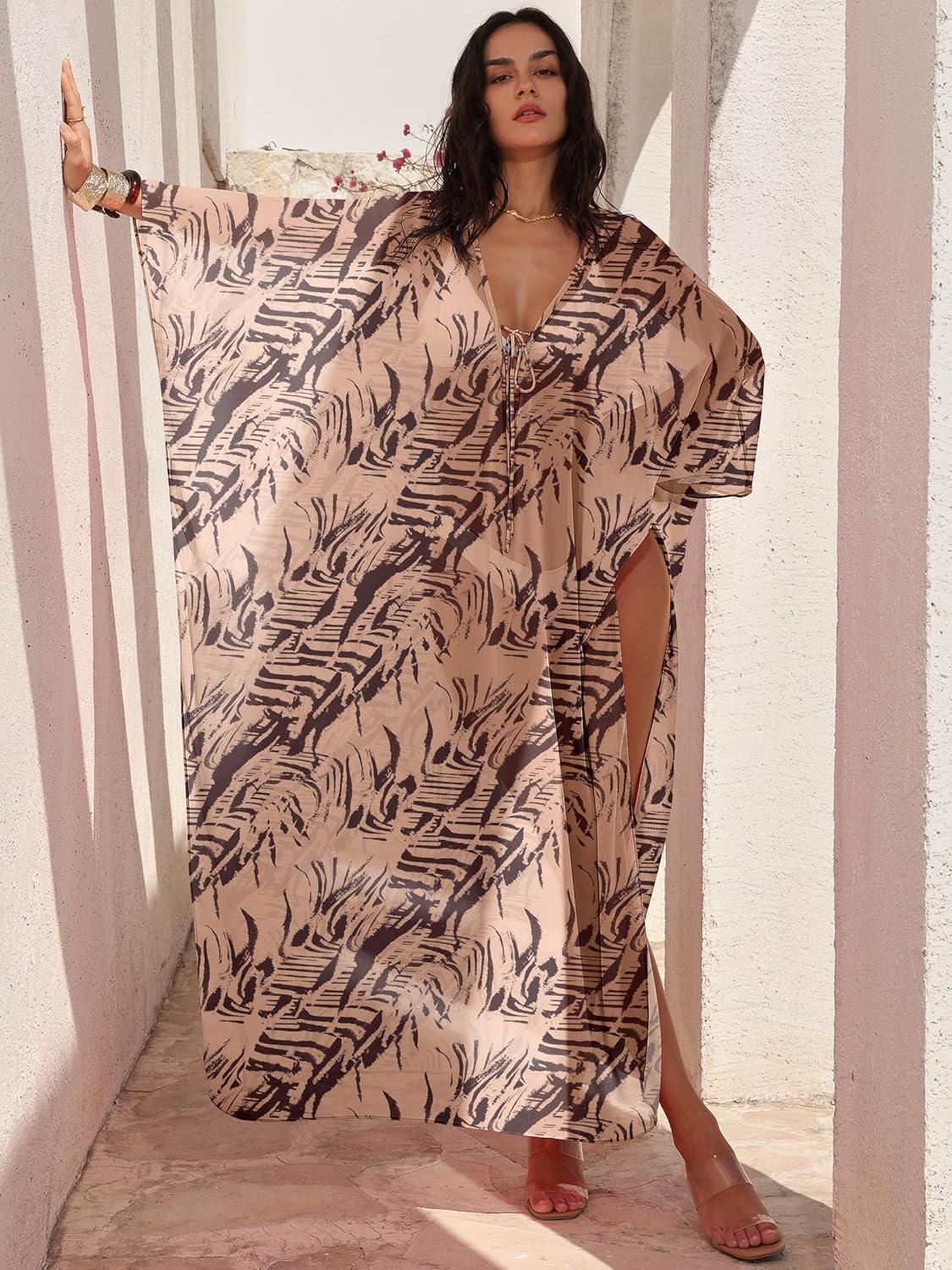 imageANRABESS Women Kaftan Moo Moos Dresses Floral Batwing Sleeve V Neck Beach Swimsuit Cover Up Caftan Maxi DressKhaki Brown Floral