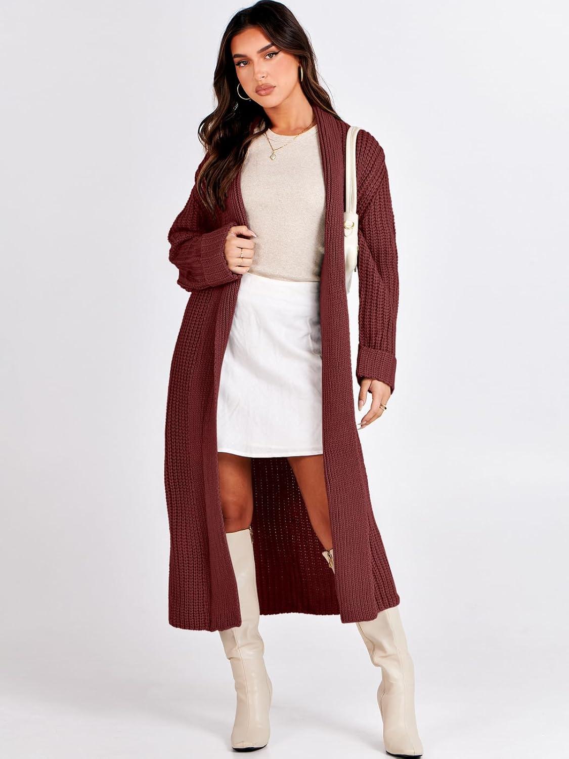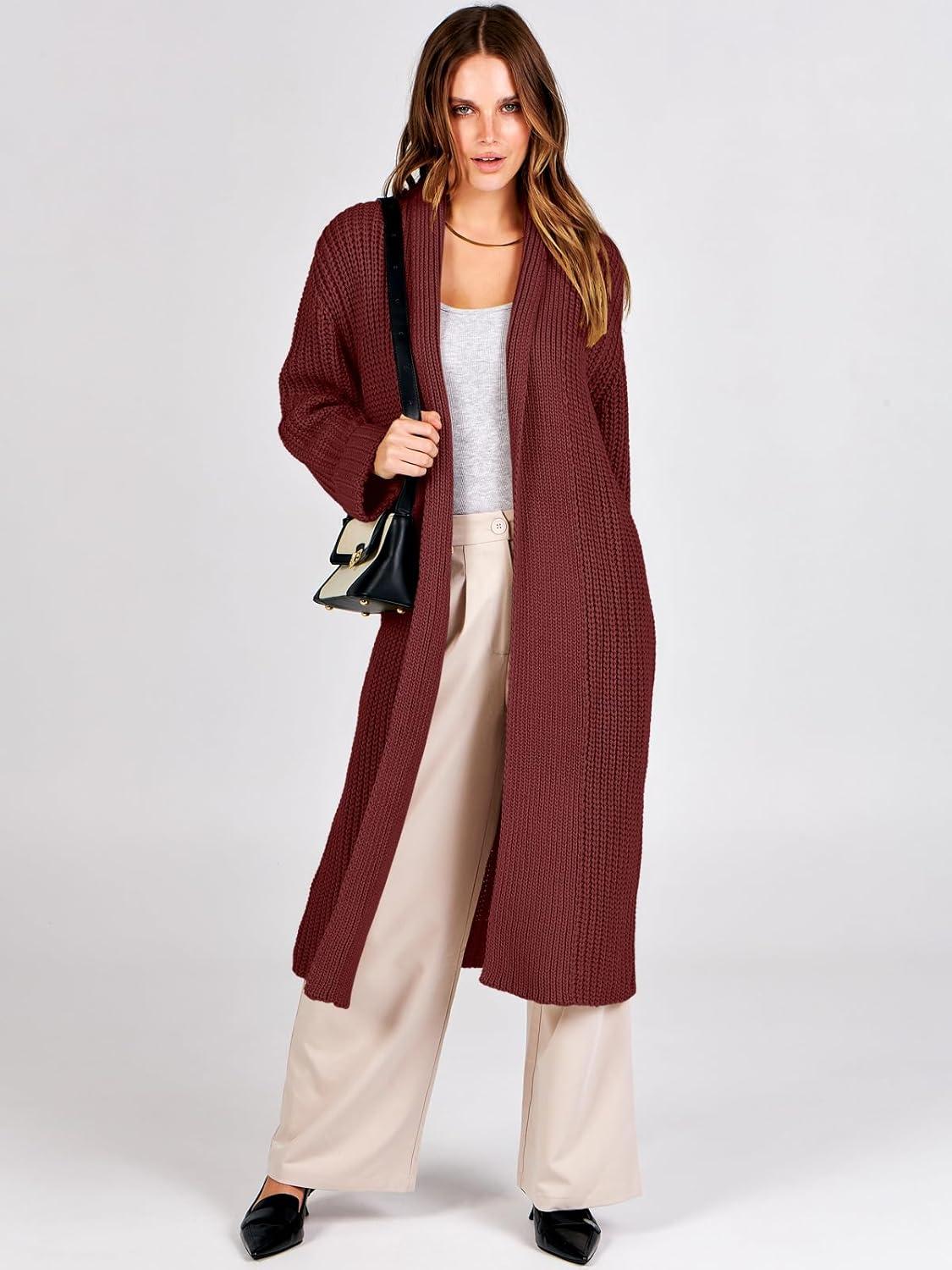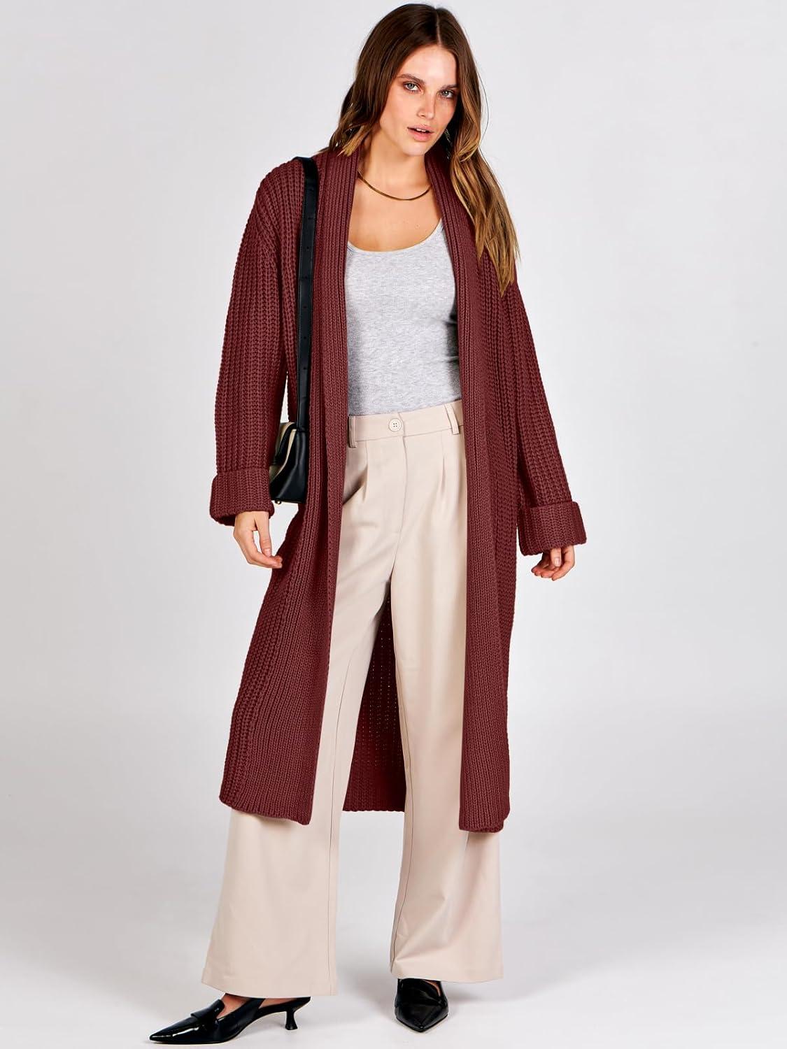 ANRABESS Women Knit Long Cardigan Long Sleeve Open Front Lapel Oversized Sweater Coat 2025 Fall Duster Outerwear Clothes(Burgundy)