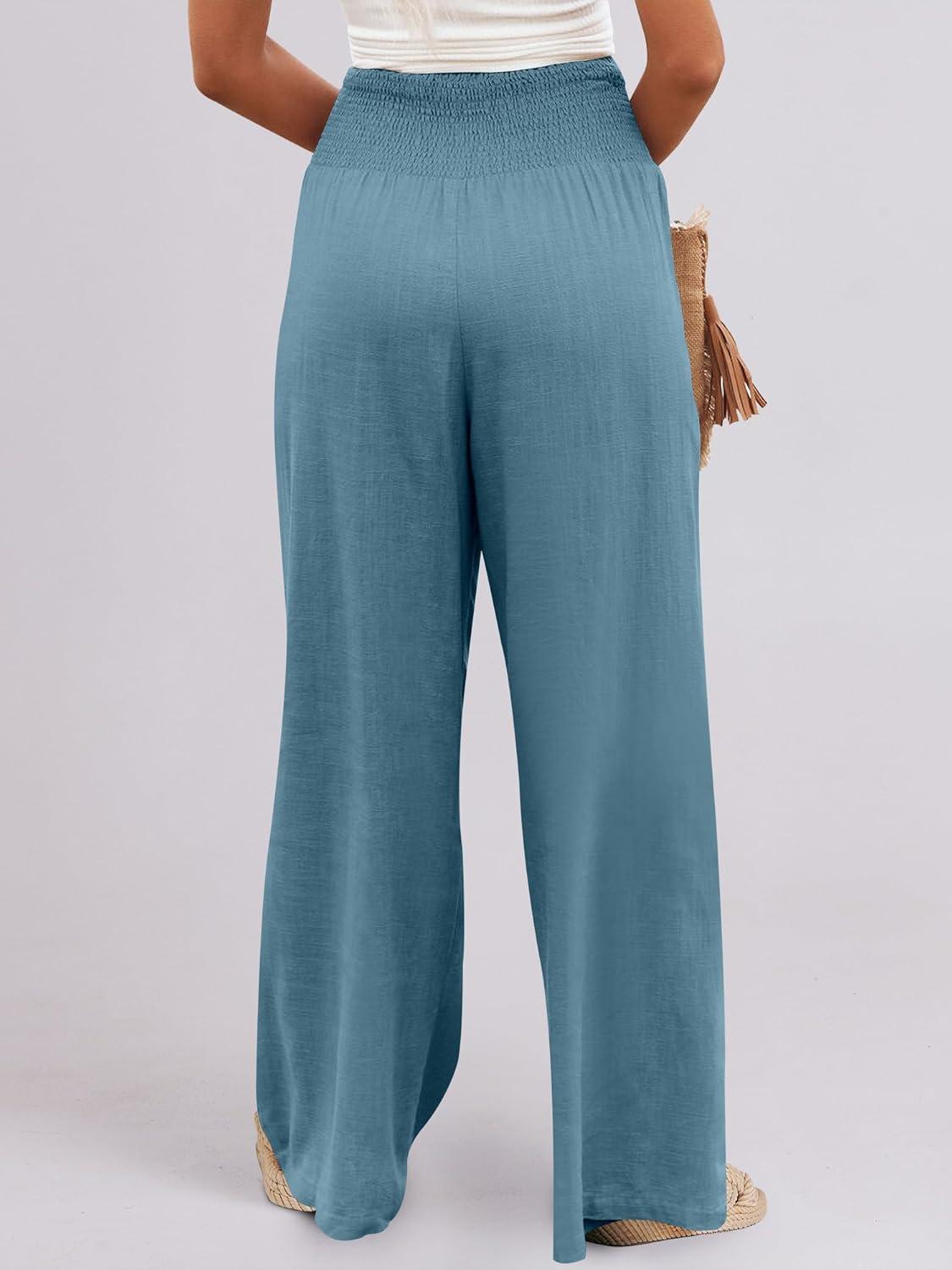 ANRABESS Women Linen Palazzo Pants Summer Boho Wide Leg High Waist Casual Lounge Pant 2025 Beach Travel Vacation Outfits(Lake)