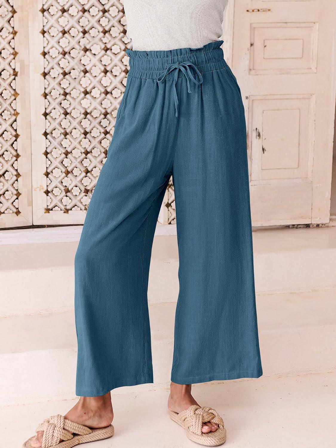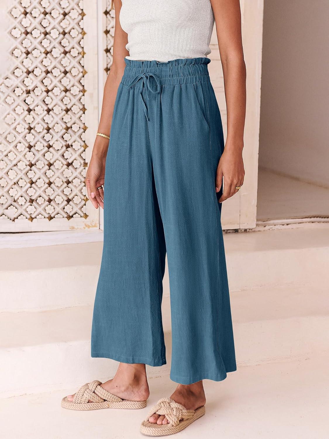 ANRABESS Women Linen Pants Casual Loose High Waist Boho Wide Leg Cropped Palazzo Beach Pants Summer Outfits 2025 Trendy(Lake Blue)