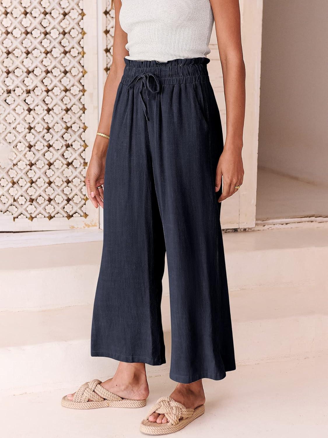 imageANRABESS Women Linen Pants Casual Loose High Waist Boho Wide Leg Cropped Palazzo Beach Pants Summer Outfits 2025 TrendyNavy Blue