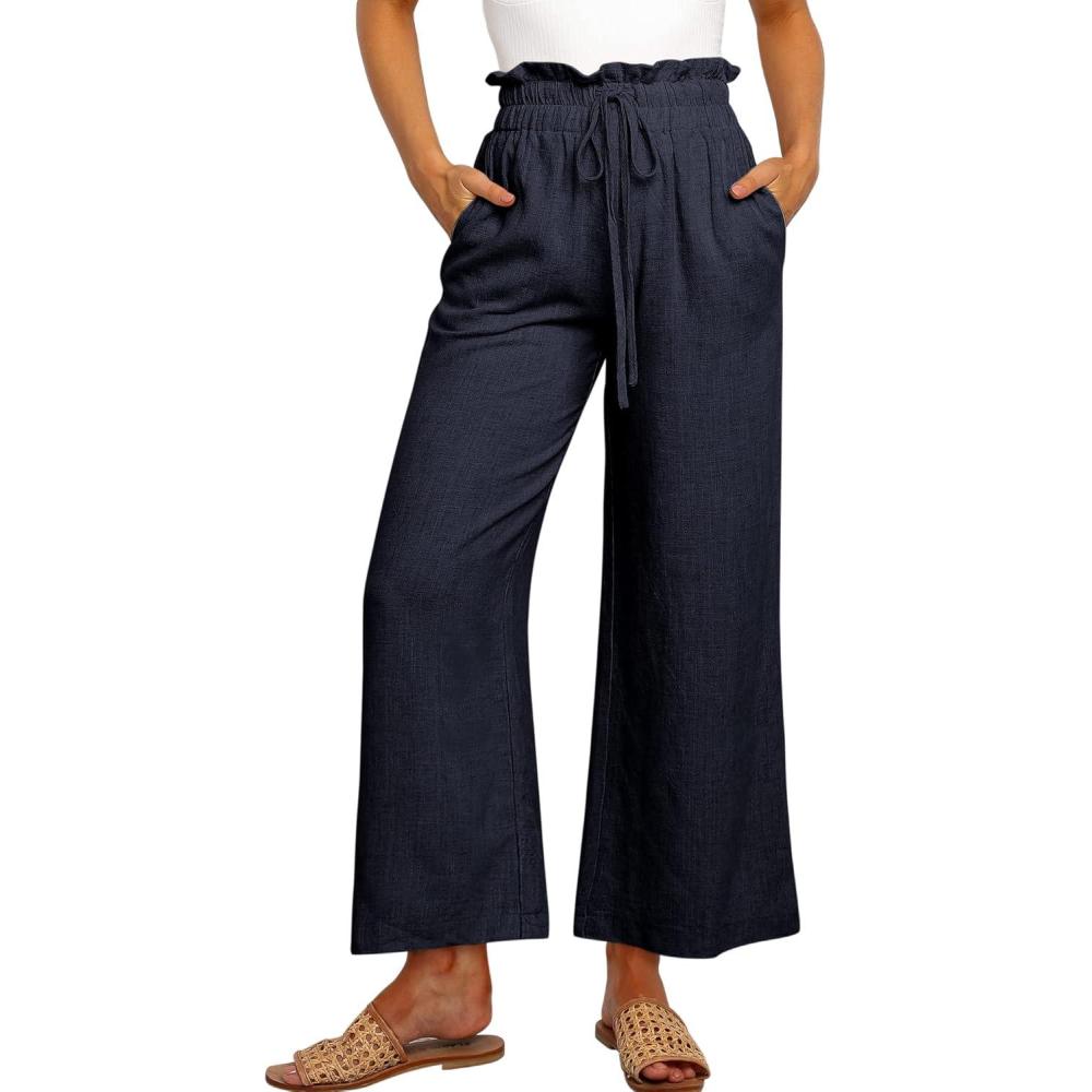 ANRABESS Women Linen Pants Casual Loose High Waist Boho Wide Leg Cropped Palazzo Beach Pants Summer Outfits 2025 Trendy(Navy Blue)