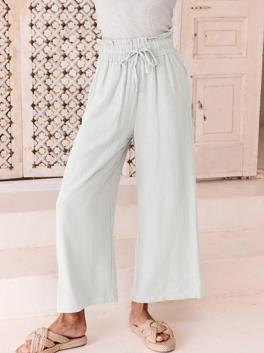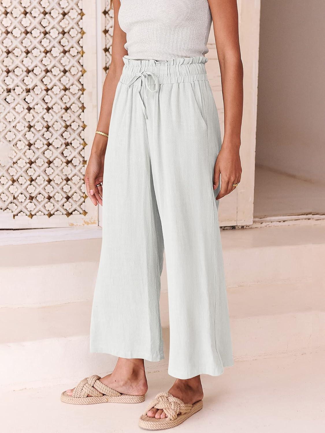 ANRABESS Women Linen Pants Casual Loose High Waist Boho Wide Leg Cropped Palazzo Beach Pants Summer Outfits 2026 Trendy(White)