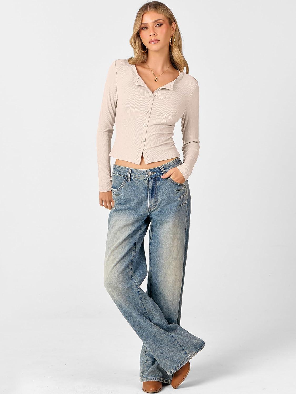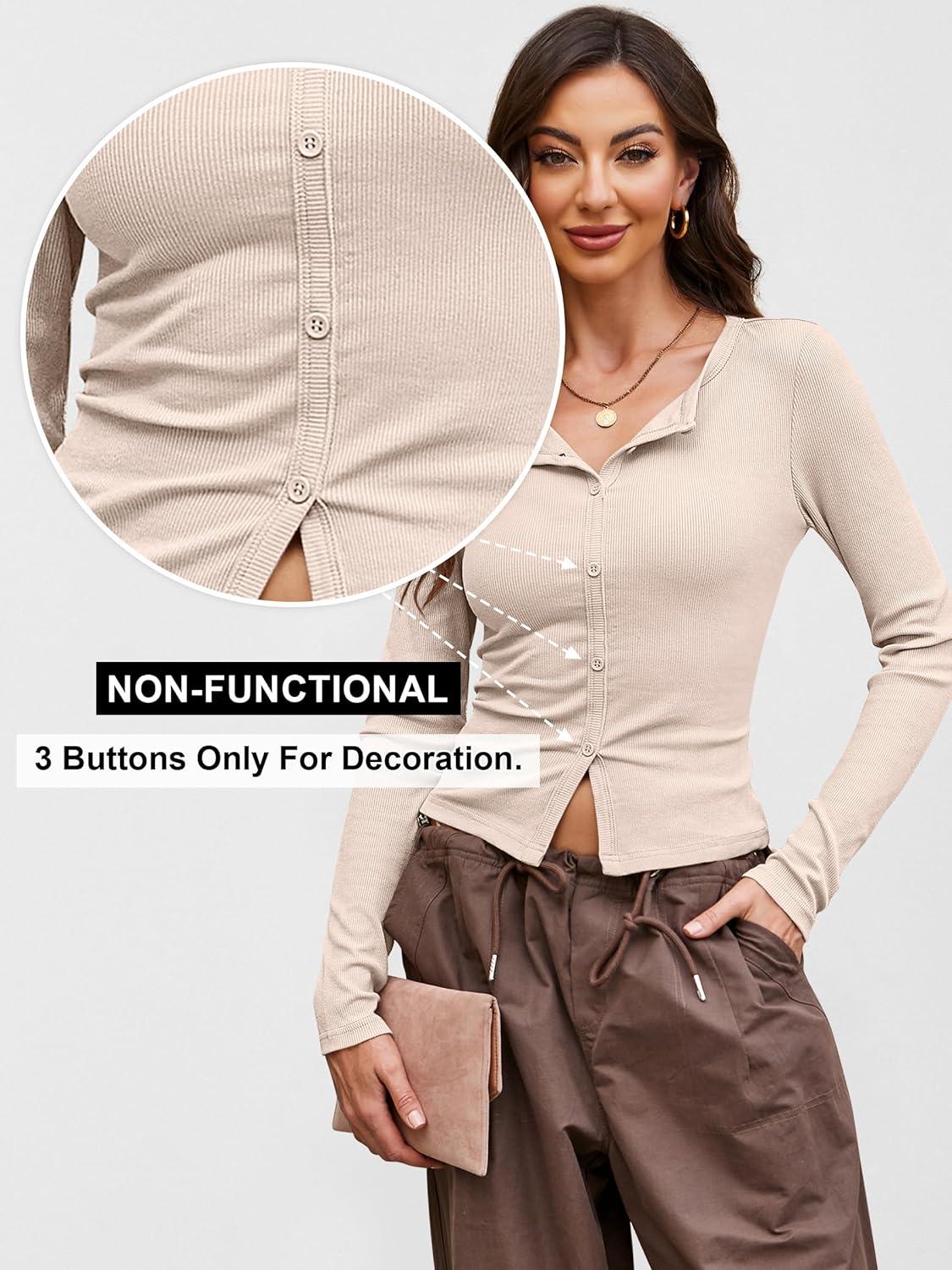 ANRABESS Women Long Sleeve Button Down Shirts Ribbed Knit Slim Fitted Crop Tops 2026 Fall Y2K Dressy Casual Trendy Outfits(Beige)