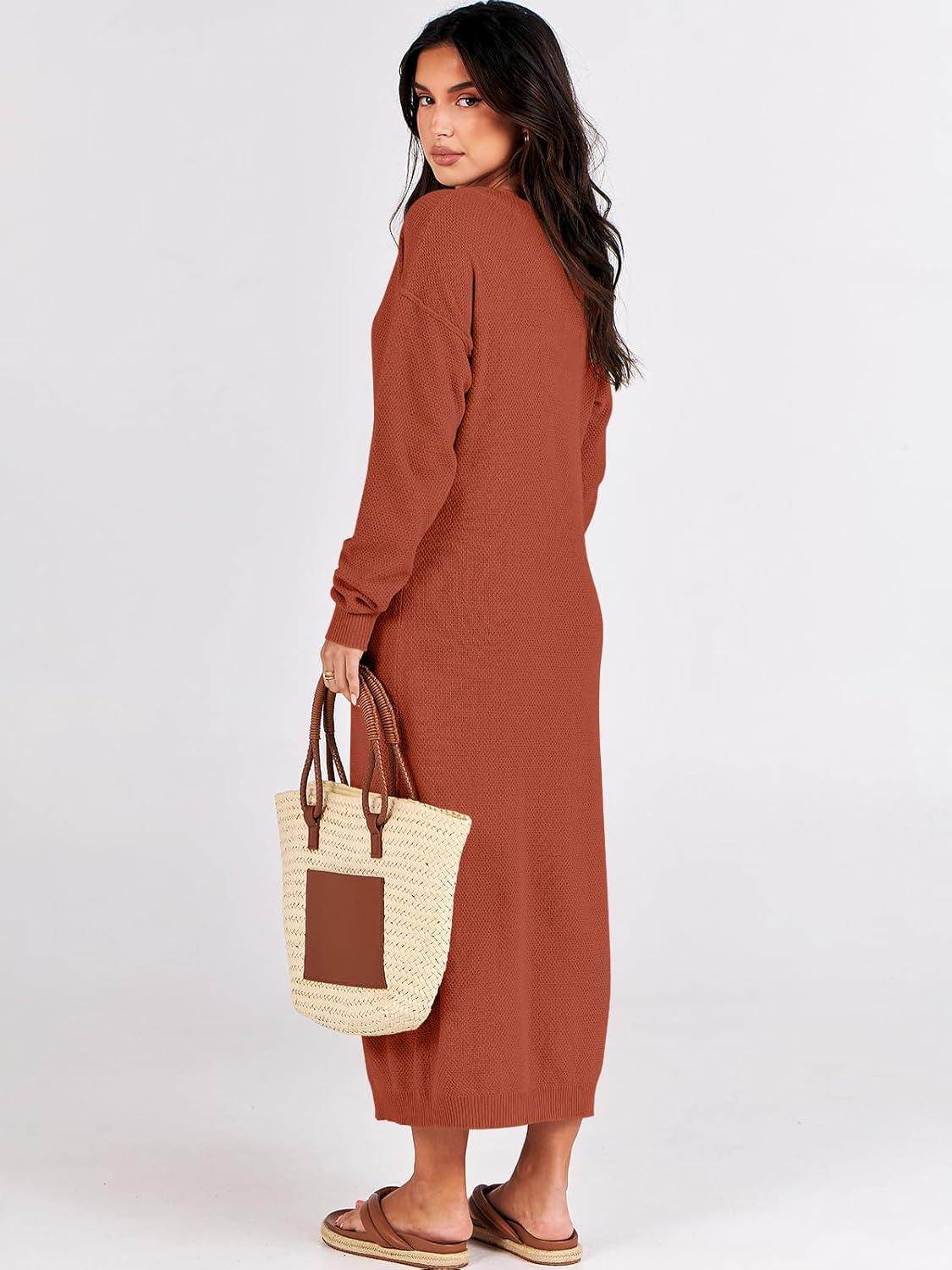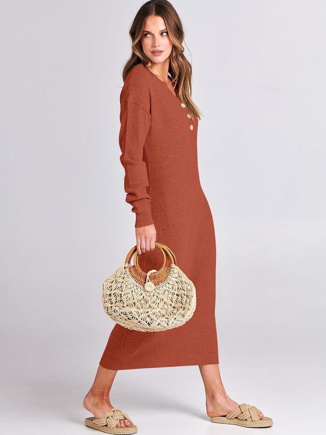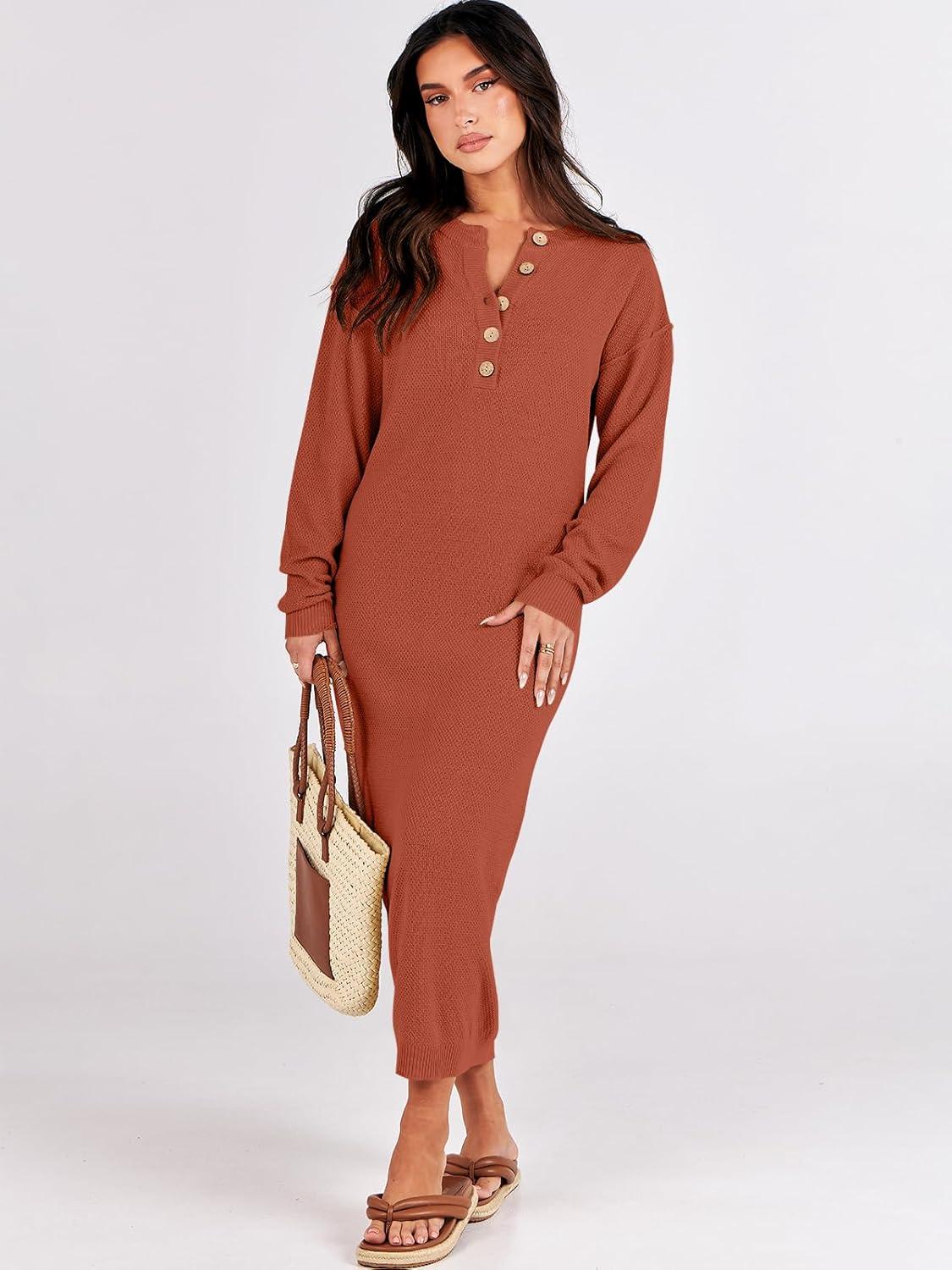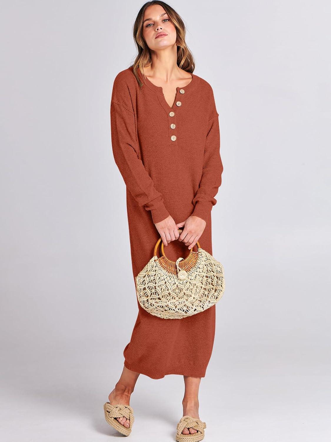 ANRABESS Women Long Sleeve Button V Neck Oversized Casual Loose Fit Waffle Knit Fall Midi Sweater Dress 2025 Trendy Outfits(Brick Red)