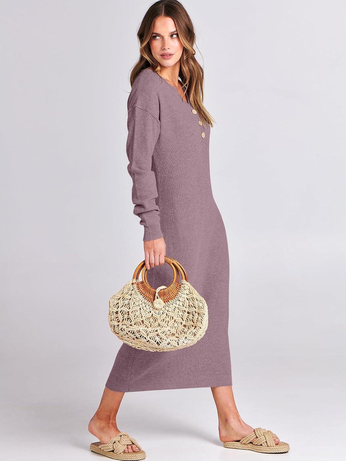 ANRABESS Women Long Sleeve Button V Neck Oversized Casual Loose Fit Waffle Knit Fall Midi Sweater Dress 2025 Trendy Outfits(White)