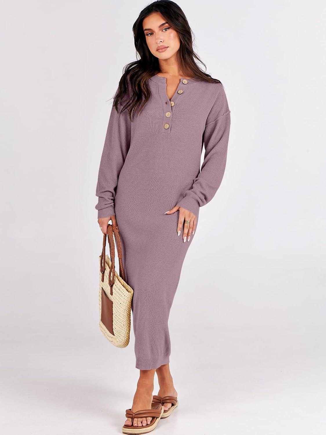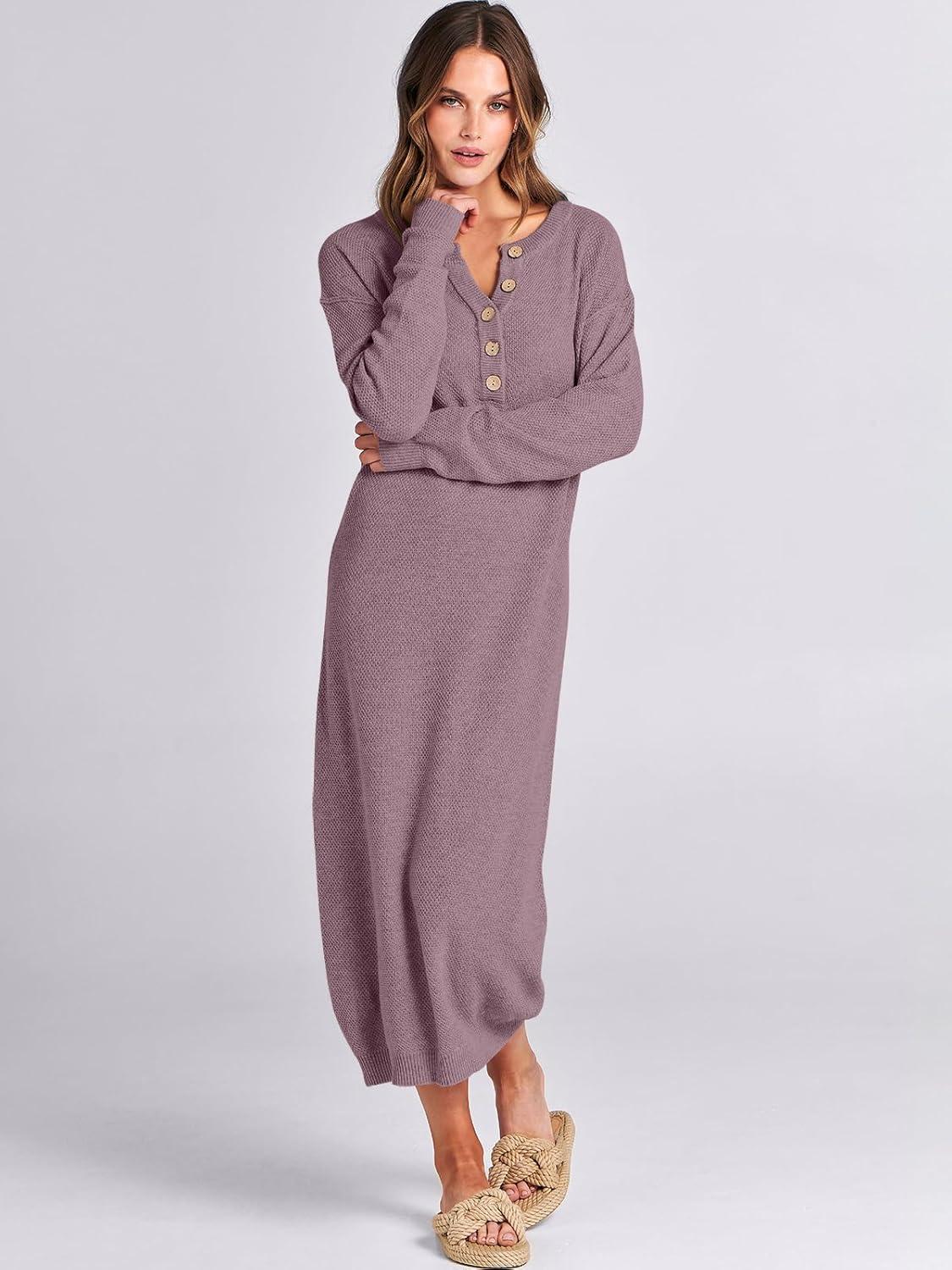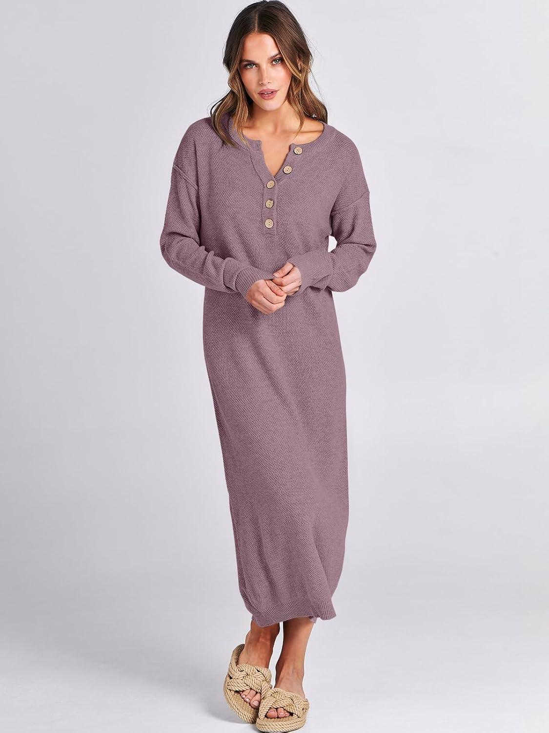 imageANRABESS Women Long Sleeve Button V Neck Oversized Casual Loose Fit Waffle Knit Fall Midi Sweater Dress 2025 Trendy OutfitsRed