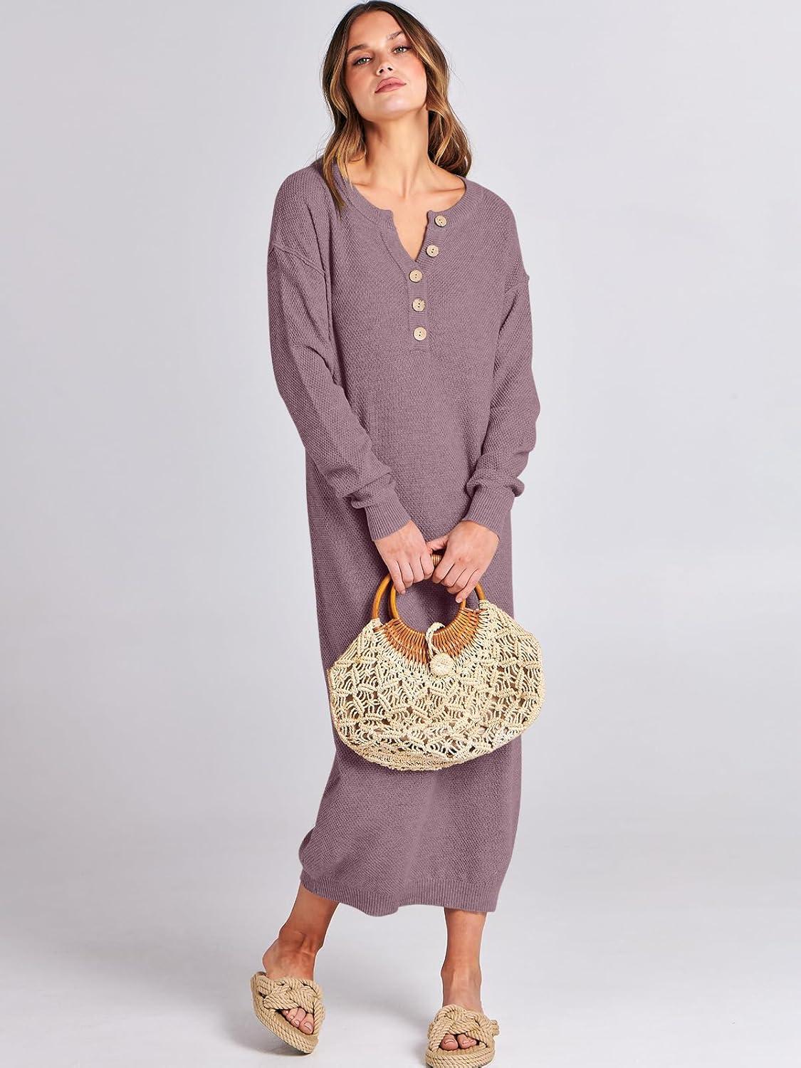 ANRABESS Women Long Sleeve Button V Neck Oversized Casual Loose Fit Waffle Knit Fall Midi Sweater Dress 2025 Trendy Outfits(Red Apricot)