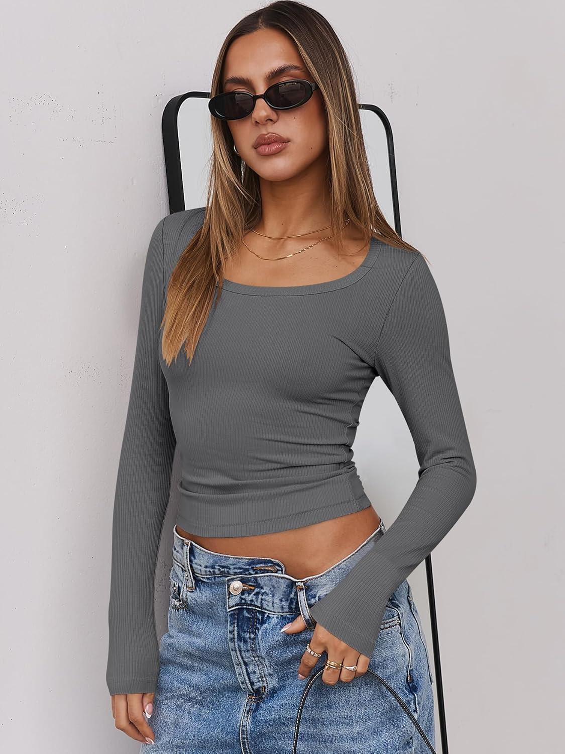 ANRABESS Women Long Sleeve Crop Tops Scoop Neck Ribbed Knit Tight Slim Fit 2025 Fall Going Out Sexy T-Shirts Basic Tee Shirts(Deep Grey)