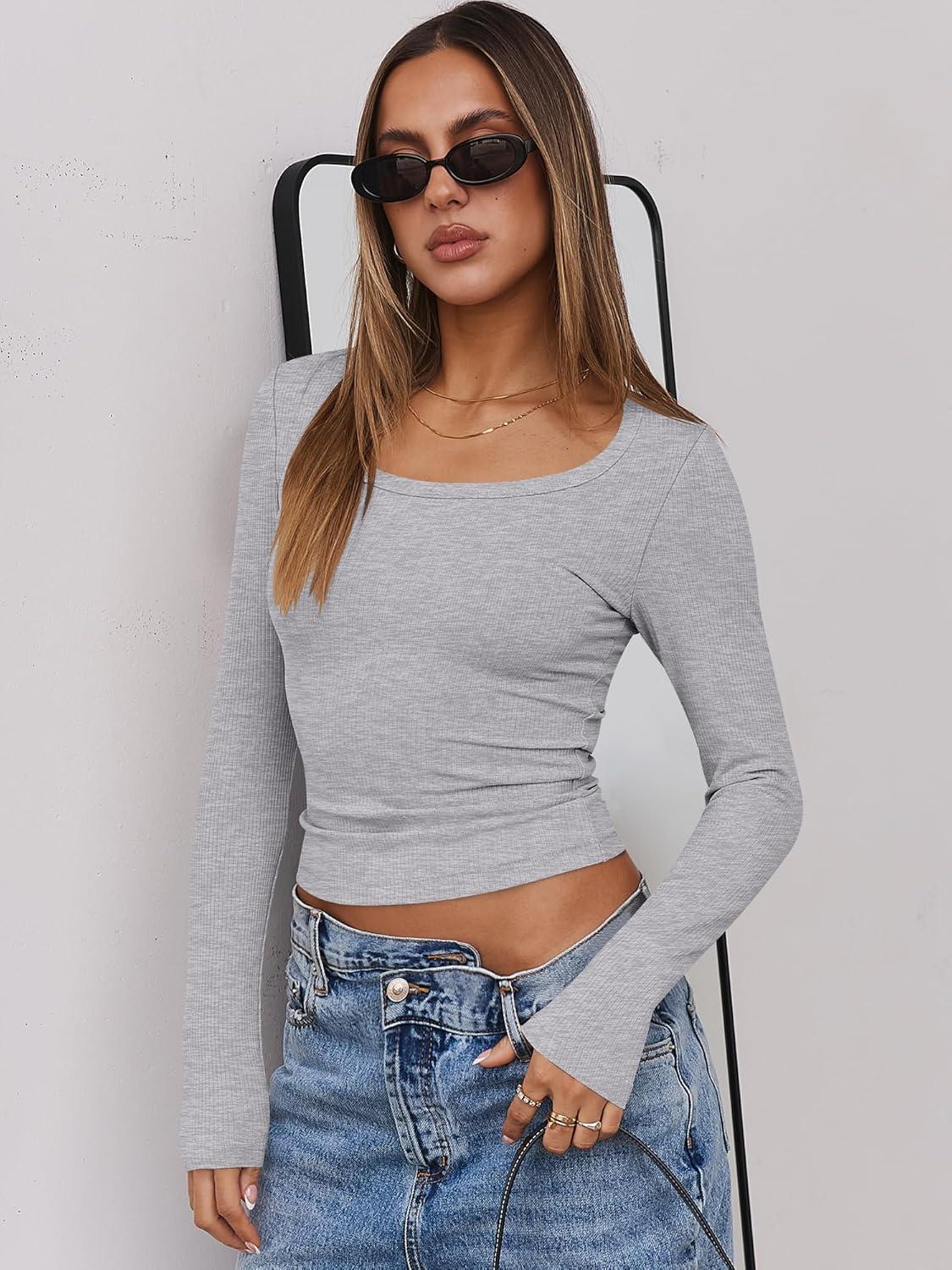 ANRABESS Women Long Sleeve Crop Tops Scoop Neck Ribbed Knit Tight Slim Fit 2025 Fall Going Out Sexy T-Shirts Basic Tee Shirts(Grey)