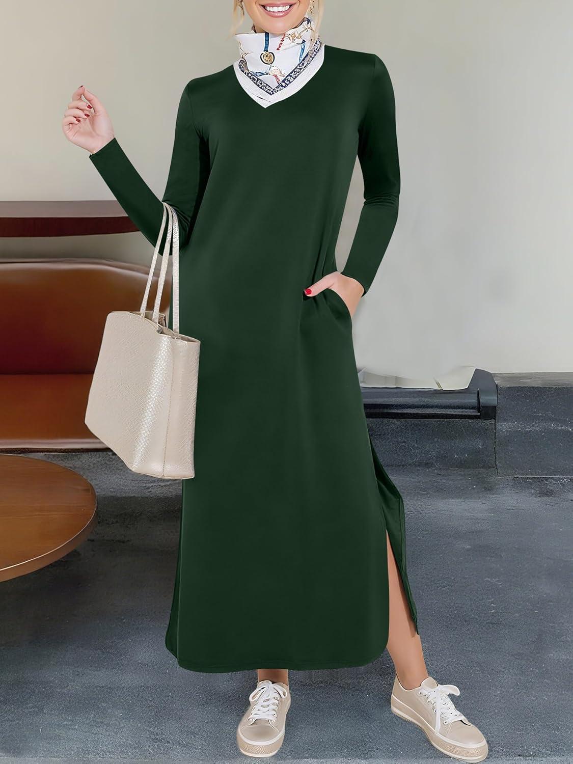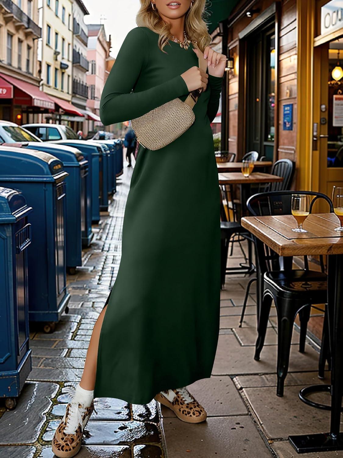 ANRABESS Women Long Sleeve Dresses 2025 Fall Casual Crewneck Loose Fit Split Flowy Wrinkle-Free Travel Vacation Maxi Dress(Deep Green)