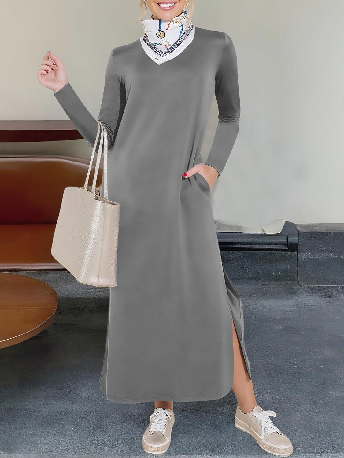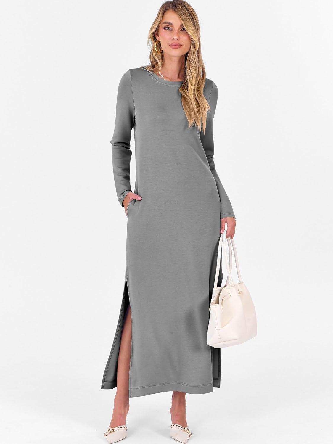 ANRABESS Women Long Sleeve Dresses 2025 Fall Casual Crewneck Loose Fit Split Flowy Wrinkle-Free Travel Vacation Maxi Dress(Grey)
